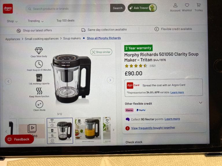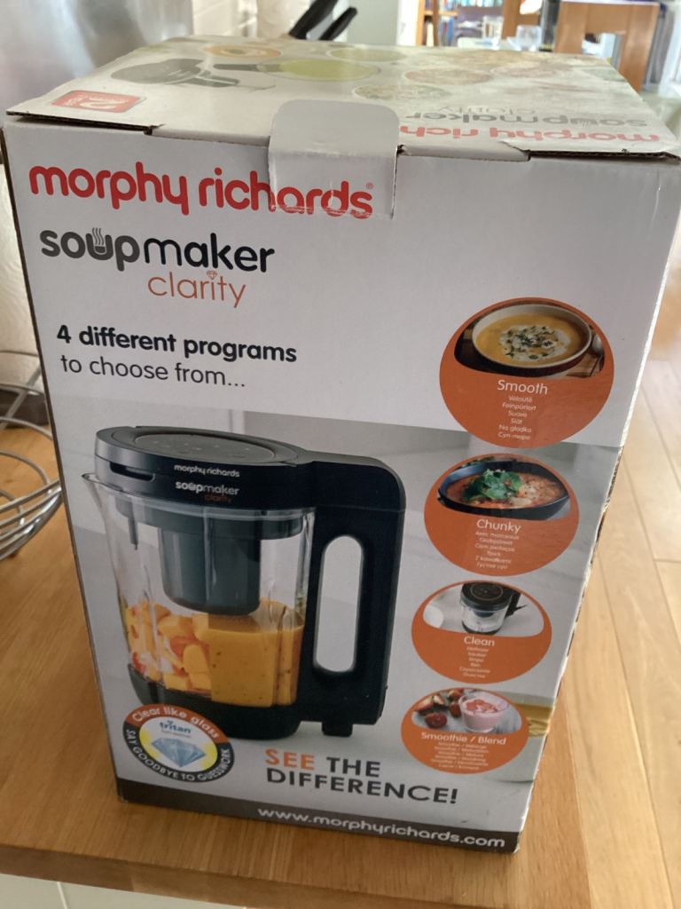Morphy Richards Clarity Soup/Smoothie Maker. Makes smooth, chunky or clean soup, and smoothies. The item is boxed, and brand new. Currently £90 at Argos.