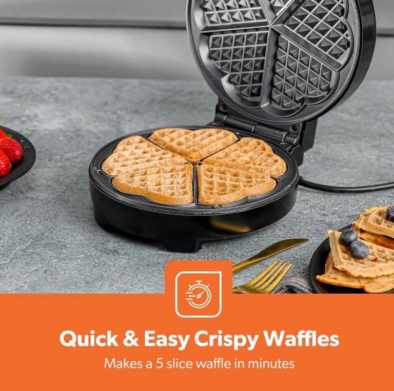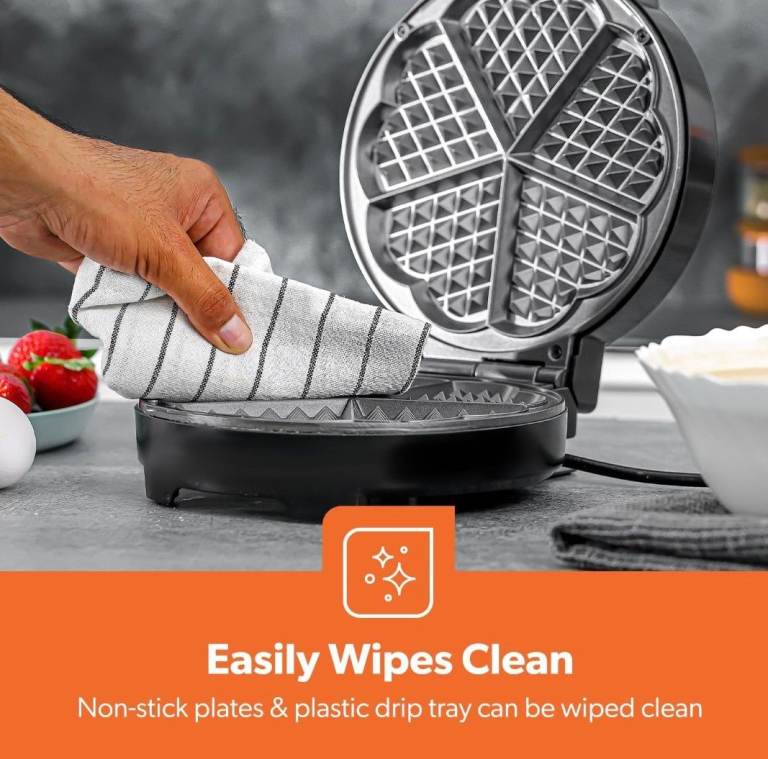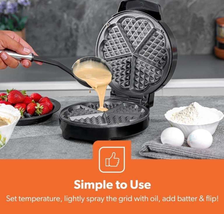 Adjustable Heat: Features a sliding thermostat control with settings typically from 1 to 5, allowing you to choose between light and fluffy or dark and crispy waffles.