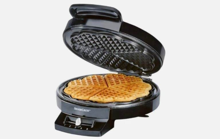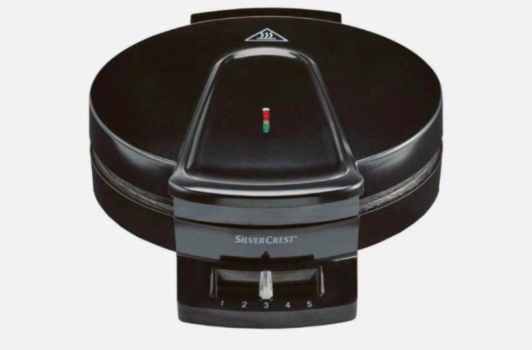 This appliance is a SilverCrest Waffle Maker (model SWE 1200), a popular item frequently sold at Lidl. It is specifically designed to bake one large round waffle that can be separated into five heart-shaped slices.