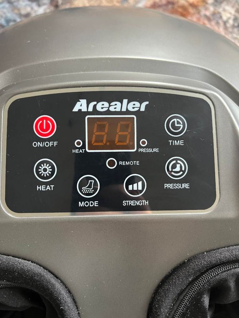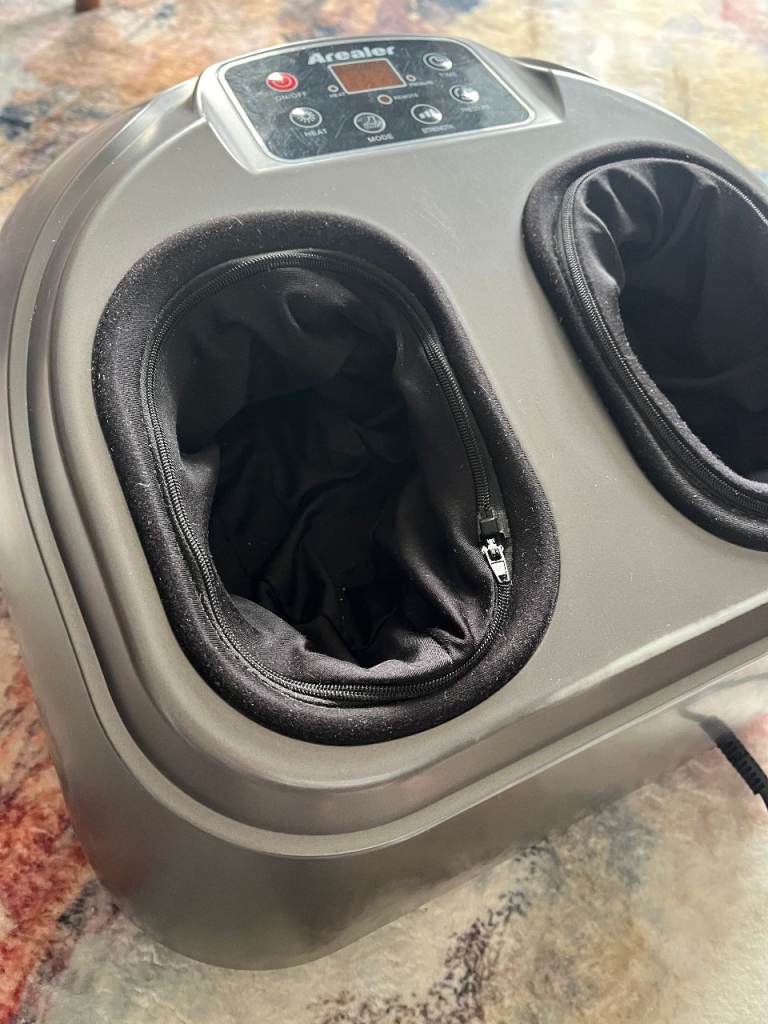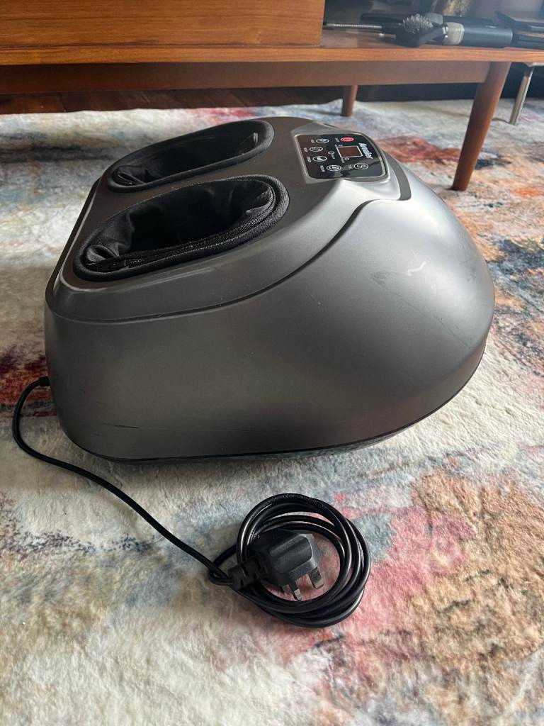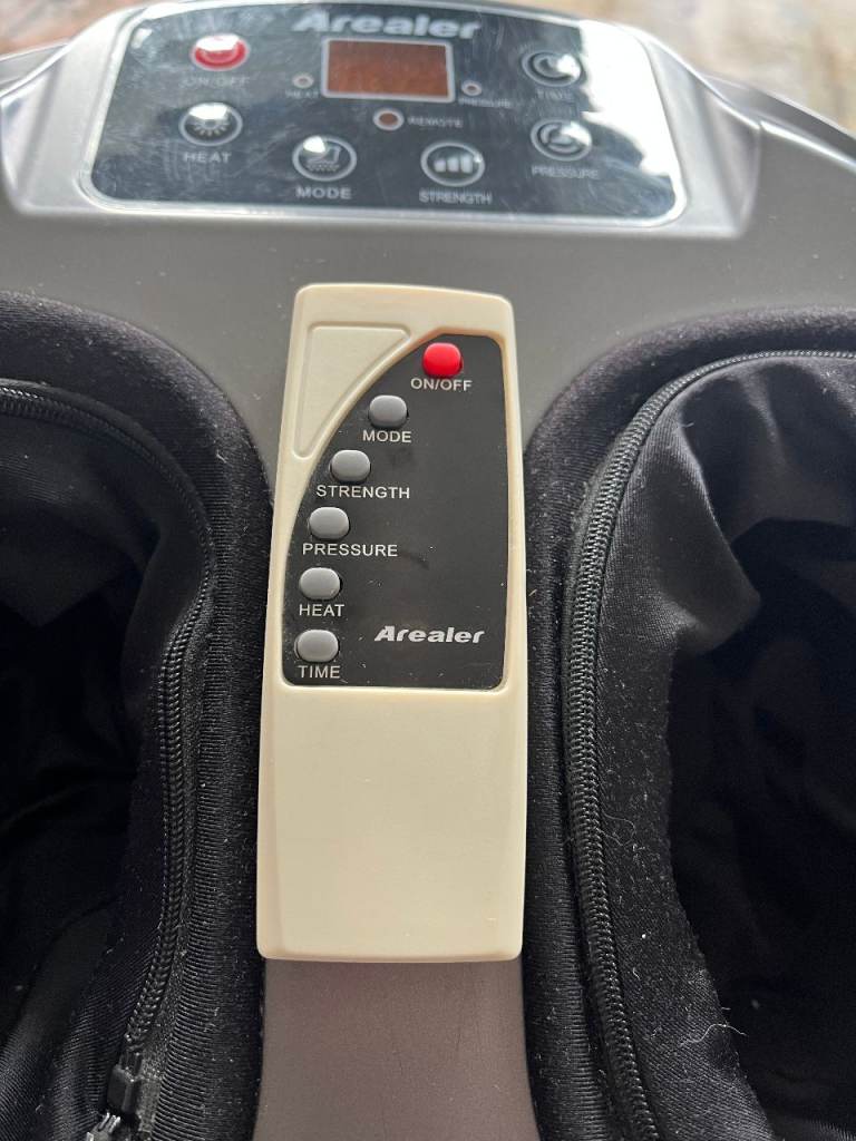 Electric foot massager, with multiple heat, pressure, strength, and massage style options. Inserts are easily unzipped and can be machine washed (have been washed in preparation for sale). Includes a battery-powered remote so it's easy to choose just the right setting.