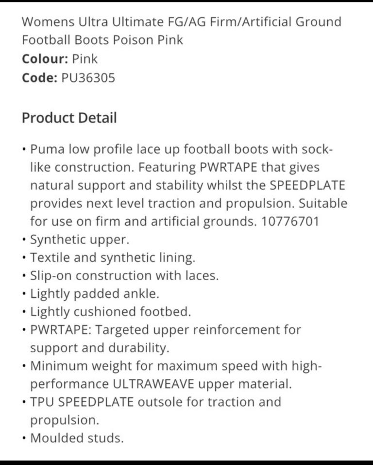 For sale I have the Puma Ultra Ultimate ladies or girls football boots. These are puma’s top of the range player edition boots, rrp is £220. Size 4 and designed for ladies, these will define you from anyone else on the pitch. Moulded studs so good for all surfaces.