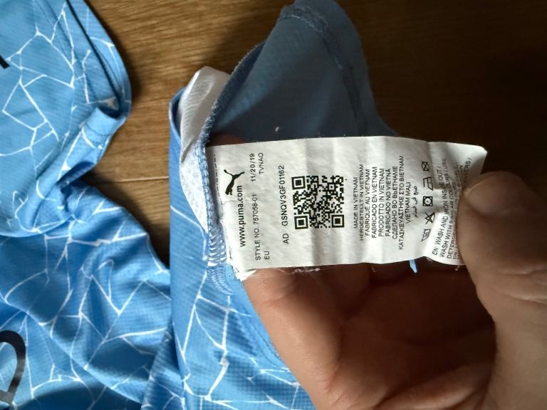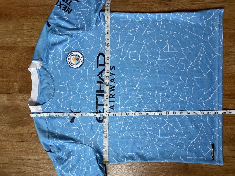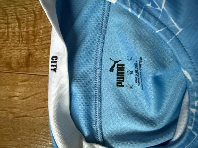 Original Man City soccer jersey in men’s XL. Light blue and white kit with Etihad Airways sponsor across the chest and Puma patches on the sleeve and crewneck collar.