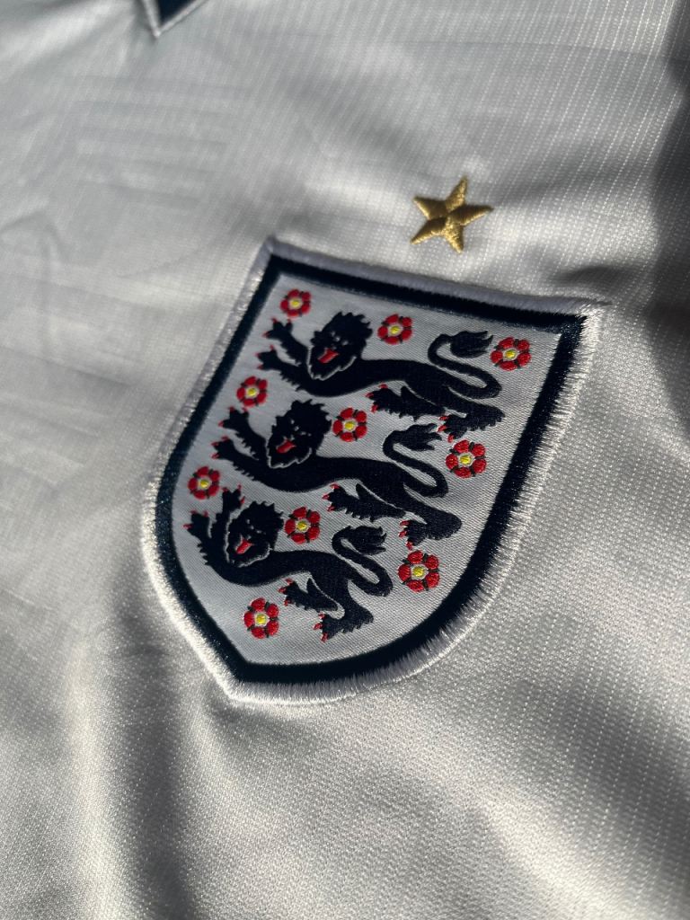 Features the classic England crest and Nike swoosh, with blue and red trim on the collar.