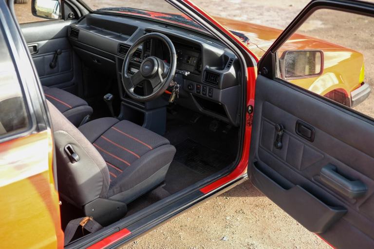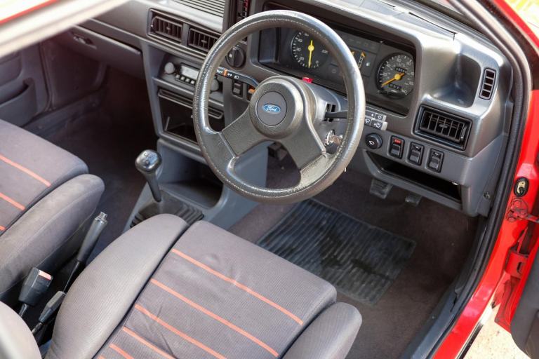 Its visual impact was immediate and enduring. Alloy wheels, sports suspension, distinctive decals and a purposeful stance ensured the XR3 stood apart, while the interior featured deeply bolstered sports seats trimmed in grey with characteristic red stripes, a three-spoke steering wheel and a full complement of instrumentation. Today, the early carburettor cars are particularly sought after, representing the purest form of the model before the later fuel-injected XR3i arrived.