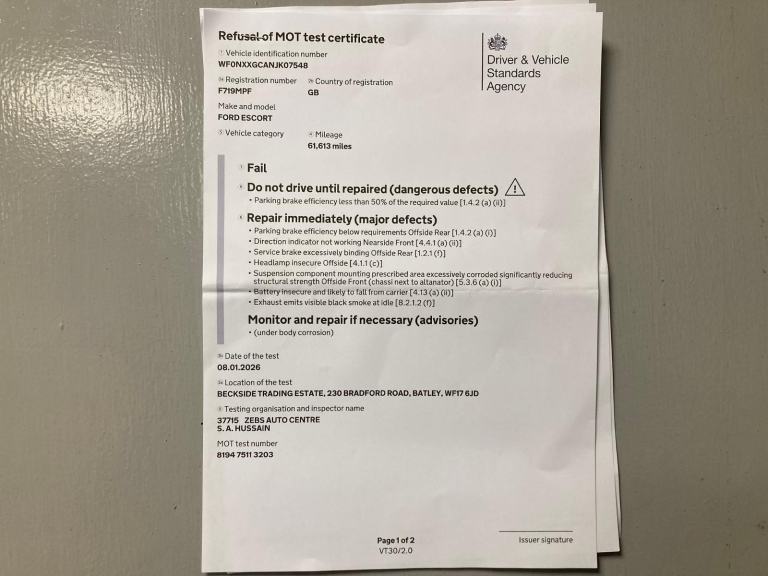 IT'S LAST MOT EXPIRED IN DECEMBER 2025, SO I SUBMITTED HER IN FOR A NEW MOT TODAY, 08/01/26 AT A VERY STRICT (BELT & BRACES) REPUTABLE MOT TEST CENTER IN DEWSBURY. AND SHE FAILED ON A FEW EASY FIX BITS & BOBS AND ALSO A TINY BIT OF WELDING THAT REQUIRES DOING ON THE VERY END OF ONE OF THE FRONT CHASSIS LEGS (BUT DEFINITELY NOT HORRENDOUS) AND EVEN THE MOT TESTER HIMSELF COMMENTED ON HOW SOLID IT IS UNDERNEATH FOR ITS AGE !!
