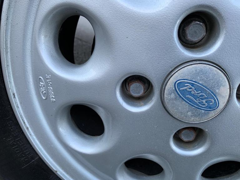 IT STILL HAS ITS ORIGINAL FORD STEREO CASSETTE UNIT, AND IT'S ALSO FITTED WITH A SET OF 5, INCLUDING THE SPARE. GENUINE (FORD STAMPED) PERIOD STYLE PEPPER-POT DESIGN 14" SPORTS ALLOY WHEELS !!