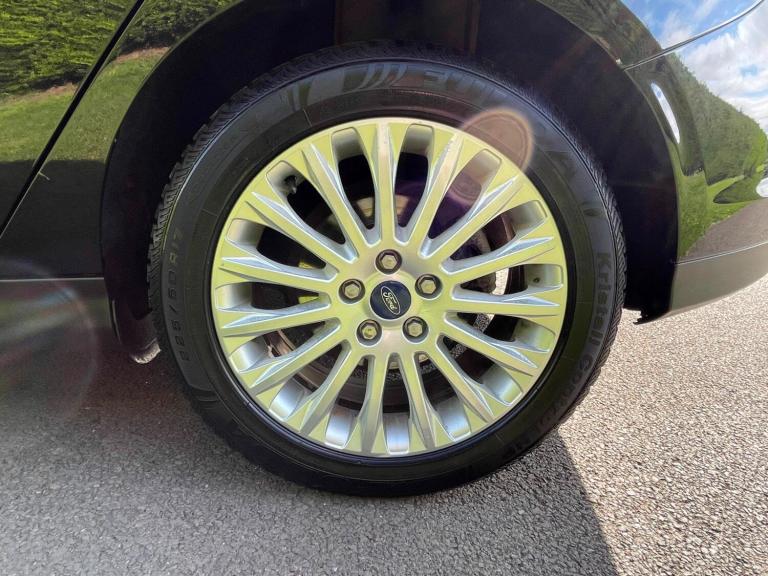 Deflation detection system, Driver airbag, Front inertia reel height adjustable seatbelts with pre-tensioners, Front passenger airbag, Front side airbags, Side curtain airbags, Three rear inertia reel lap/diagonal seatbelts, Anti-burst high-security shielded door locks, Immobiliser-Passive Anti-Theft System (PATS), Locking wheel nuts, Remote central double locking, Thatcham Category 1 alarm, Anti lock brake system + Electronic Brake force Distribution, Electronic stability programme with traction control + emergency brake assist, Hill start assist, Automatic dimming rear view mirror, Body colour electric folding/heated door mirrors, 'Quickclear' heated windscreen/heated washer jets, Automatic rain sensing wipers, Electric front and rear windows + one touch + global open/closing, Front variable intermittent wipers with electric wash, Heated rear window, Tailgate wash/wipe, Body colour bodyside mouldings, Body colour bumpers, Body colour door handles, Chrome finish on upper door line, High gloss black grille, Solid paint, Bi-Xenon headlights and headlight washers, Black headlamp bezels, Front fog lights, Guide me home headlights with delay switch-off, Headlight levelling control, LED daytime running lights, 60/40 split back and cushion rear seats with 2 height adjustable headrests, Driver's seat electric height adjustment, Driver's seat with adjustable lumbar support, Driver/passenger front seatback pockets, Electric heated front seats, Height adjustable front headrests, Isofix child seat preparation, Passenger seat height/lumbar adjustment, Sports style front seats, Front/rear floor mats, 2 map reading lights, Ambient lighting, Footwell lights, Illuminated heater controls, Rear overhead dome courtesy light, Driver/passenger sunvisors with illuminated vanity mirrors + covers, 12V power point front/rear, 4 spoke leather steering wheel with silver accents, Centre console storage box/armrest, Leather gear knob, Part leather upholstery, Reach + rake adjustable steering column, Rear armrest with storage, Dual electronic automatic temperature control air conditioning - CFC-free, Pollen/active carbon filters, 'Ford Power' starter button, Easy fuel capless refuelling system, Electric boot release, Cruise control + speed limiter, Front and rear parking sensors, Power assisted steering, Digital clock, Door ajar warning, Exterior temperature gauge, Lights on warning, Low screen washer fluid warning, Trip computer, Bluetooth connection with voice control and USB port, 9