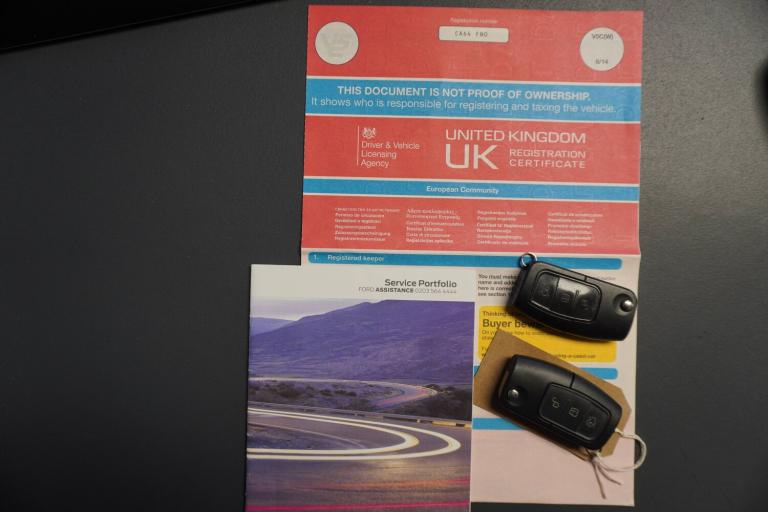3 point seatbelts on all rear seats, ABS+EBA, Curtain airbags, Driver and passenger airbags, Drivers knee airbag, ESP + traction control, Front passenger airbag deactivation, Front side airbags, Hill start assist, Tyre pressure monitoring system, Electric power steering, SYNC Emergency Assistance, Trip computer, Body colour bumpers, Body colour door handles, Body colour electric adjustable heated door mirrors, Body colour rear spoiler, Body colour tailgate handle, Chrome beltline trim, Chrome surround for front fog lights, Courtesy headlamp delay, Electric front windows/one touch facility, Front fog lights, LED daytime running lights, Quickclear heated windscreen, Rear wiper, Solid paint, Tinted glass, Upper front grille chrome surround, 3 spoke leather steering wheel, 60/40 split folding rear seat, Adjustable head restraints, Ambient lighting, Boot carpet, Cloth upholstery, Footwell illumination, Front map reading lights, Front seat and rear pockets, Illuminated glovebox, Leather trimmed handbrake handle, Load area light, Manual air conditioning, Manual seat adjustment, Pollen filter, Rake/reach adjustable steering wheel, Immobiliser, MyKey system, Remote central locking, 6 speakers, Auxiliary input socket, DAB radio/CD and Ford SYNC Bluetooth connection with voice control, Steering wheel mounted controls, USB connection, 15 inch 5x2 spoke alloy wheels, Tyre repair kit