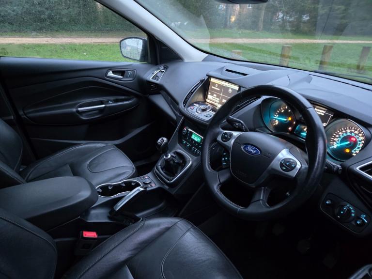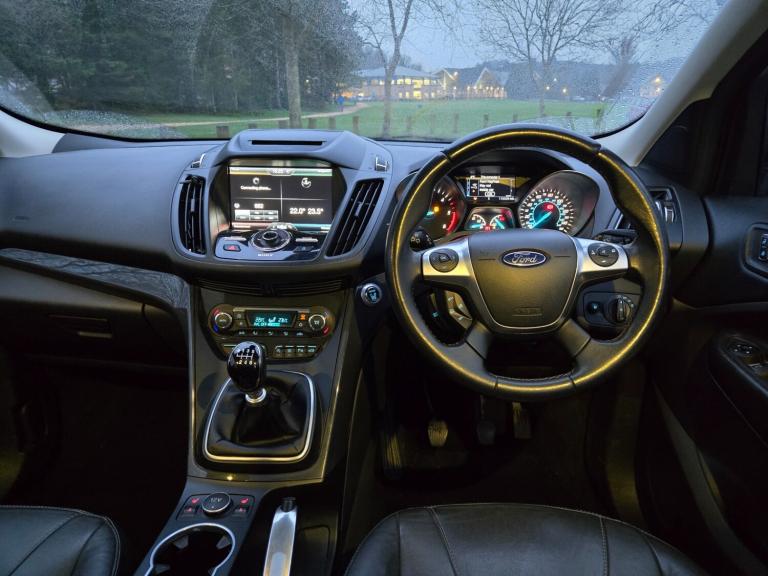 HAVING A BRAND NEW CAM BELT AND WATER PUMP REPLACEMENT This 2016 Ford Kuga TDCi Titanium X offers a compelling blend of capability and comfort, featuring a robust 2.0 litre diesel engine paired with a four wheel drive system for confident handling in various conditions. As a Euro 6 compliant vehicle, it meets modern emissions standards. The Titanium X trim level ensures a well equipped interior, boasting heated driver and passenger seats for those colder journeys. Practicality is enhanced with Bluetooth handsfree phone connectivity, allowing for safe and easy communication on the go.Further enhancing the driving experience are Bi-Xenon headlights that provide excellent visibility, complemented by automatic headlights that adjust to ambient light conditions. The fixed panorama roof floods the cabin with natural light, creating a more open and airy feel. With an impressive highlight fuel economy of 54 miles per gallon and low CO2 emissions, this Kuga represents a more efficient choice compared to many other vehicles in its class.