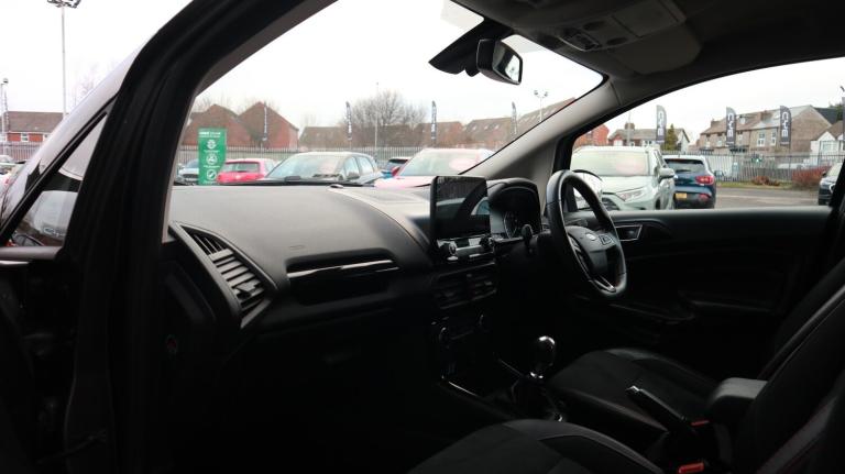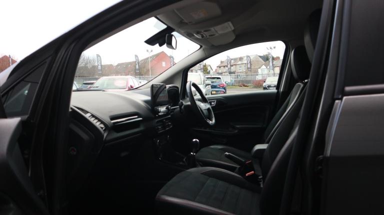 .This 2019 Ford EcoSport ST-Line presents an exceptional opportunity with its remarkably low mileage of just 27,383 miles. As a T ST-Line variant, this petrol model boasts a 1.0 litre engine and meets Euro 6 emission standards. It comes equipped with automatic headlights, ensuring enhanced visibility and convenience for the driver. The EcoSport ST-Line offers impressive fuel economy, achieving up to 47 miles per gallon, which is a significant advantage for running costs compared to many other vehicles. Furthermore, its low CO2 emissions contribute to a more environmentally conscious driving experience. This combination of efficiency and thoughtful features makes this Ford EcoSport a compelling choice..Cruise control, Easy fuel capless refuelling system, PAS, SYNC 3 nav system with DAB radio, 8'' screen, voice control, emergency assistance, Apple car play/Android auto, 2x USB, Ford pass connect, Trip computer, Sports suspension, Steering wheel mounted audio controls, 'Quickclear' heated windscreen/heated washer jets, Auto dimming rear view mirror, Automatic headlights, Black roof rails, Body colour door handles, Body coloured bumpers, Electrically adjustable and heated door mirrors, Front door threshold plates with ST-Line logo, Front fog lights, Headlight levelling control, Large rear spoiler, Power foldable door mirrors with puddle lights, Power front and rear windows with global opening/closing, Rain sensing front wipers, Rear wiper, ST-Line body styling kit, ST-Line front grille, 12V socket in front and rear, 60/40 split rear seats, 7 shade adjustable ambient lighting, Centre console with sliding front armrest, Cooled glovebox, Courtesy lights with map reading light, Driver seat height/lumbar adjust, Driver's side glovebox, Driver/passenger sunvisors and lidded vanity mirrors, EATC - Electronic Auto Temperature control, Folding grab handles, Footwell ambient lighting, Front head restraints, Front seat back map pockets, Front/rear floor mats, Illuminated glovebox, Illuminated luggage compartment, Isofix system on outer rear seats, Leather steering wheel/gearshift/handbrake lever with red stitching, Luggage compartment carpet, Overhead console with sunglasses holder, Partial leather upholstery, Rake adjustable rear seats, Reach + rake adjustable steering column, Rear headrests, Stainless steel sports pedals, Steering wheel with chrome inserts, Storage drawers under front seats, Tie down hooks, Variable boot floor, Rear view camera pack - Ecosport, 3x3