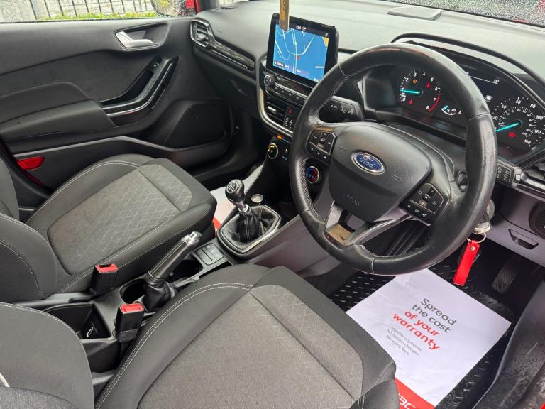 2019 FORD FIESTA 1.0ECOBOOST ACTIVE 1 5DR, ONLY 47800 MILES FROM NEW WITH SERVICE HISTORY, 2 KEYS, FULL YEARS MOT & SERVICE, RED METALLIC, FULL BLACK WITH CHARCOAL GREY CLOTH INTERIOR, FORD MEDIA SYSTEM WITH FULL COLOUR SATELLITE NAVIGATION/RADIO/D.A.B/USB/AUX & BLUETOOTH TELEPHONE PREP, PIANO BLACK INLAYS, LEATHER MULTI FUNCTION STEERING WHEEL, AUTO HEADLIGHTS WITH DAYTIME RUNNING LIGHTS, CLIM,ATE CONTROL WITH A/C, LANE ASSIST, ELECTRIC WINDOWS & DOOR MIRRORS, REAR PRIVACY GLASS, 17 INCH 5 SPOKE GREY ALLOYS, REAR PARKING SENSORS, REAR ISOFIX, REMOTE CENTRAL LOCKING, ALARM ** IDEAL FIRST CAR WITH LOW INSURANCE & RUNNING COSTS ** 3 MONTHS RAC WARRANTY **
