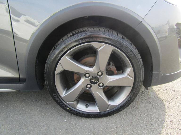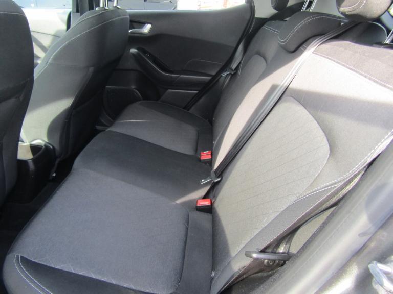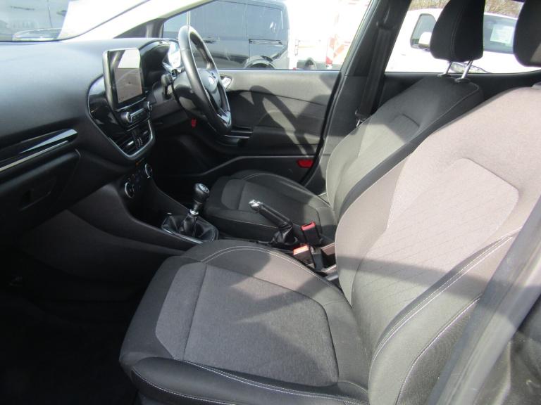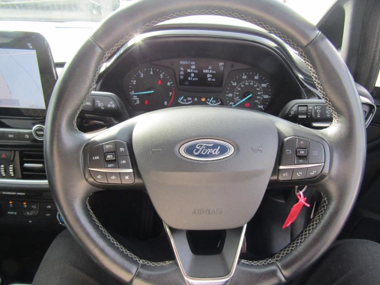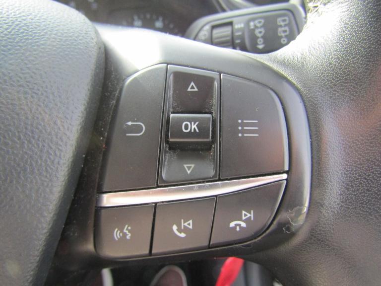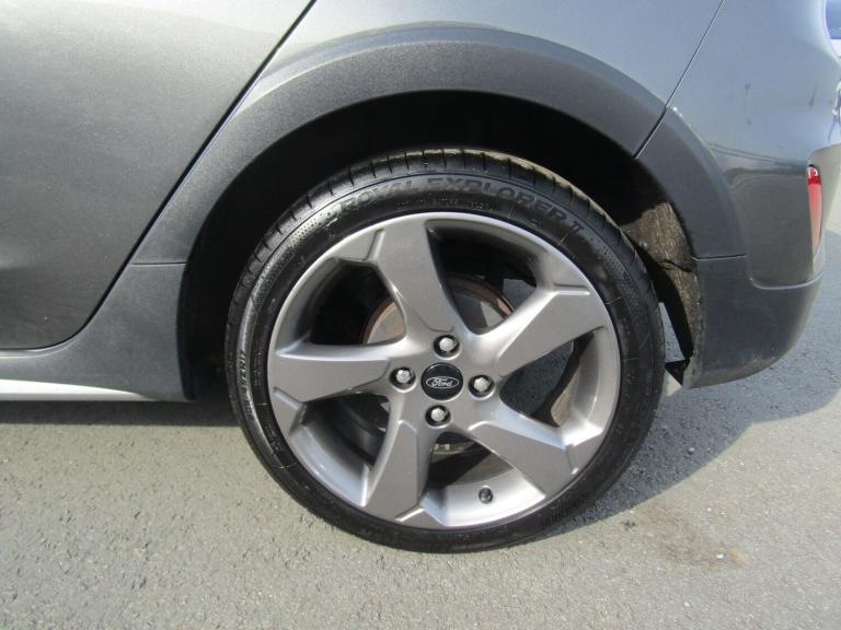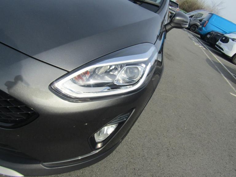 ..Bluetooth system, Drive mode selector, Electric power steering, Ford easy fuel, Trip computer, Rough road suspension with increased ride height adjust, 2 USB ports, Auxiliary input socket, DAB Digital radio, Steering wheel mounted controls, Active logo front door thershold plates, Automatic headlights, Body colour bumpers, Body colour door handles, Body colour electric adjustable heated door mirrors with integral indicators, Body colour rear spoiler, Chrome beltline trim, Chrome lower window surround, Cornering front fog lights, Electric front windows/one touch facility, Electric rear windows, LED Night signature to rear lights, LED rear lights, Quickclear heated windscreen, Rear privacy glass, Rear wiper, Rugged body styling kit with active front wing badges, Tinted glass, Upper front grille chrome surround, 12V Accessory socket in centre console, 3 spoke leather trimmed steering wheel with audio control, 60/40 split folding rear seat, Adjustable head restraints, Ambient lighting, Boot carpet, Chrome inner door handles, Cloth upholstery, Drivers and Passenger lumbar support, Footwell illumination, Front floor mats, Front map reading lights, Front seat and rear pockets, Height adjustable driver's seat, Illuminated glovebox, Leather gear knob, Leather trimmed handbrake handle, Load area light, Luxury woven headliner, Manual air conditioning, Overhead console with sunglasses holder, Pollen filter, Rake/reach adjustable steering wheel, Rear centre head restraint, NCAP Pack - Fiesta, 3 point seatbelts on all rear seats, ABS+EBA, Curtain airbags, Driver and passenger airbags, Drivers knee airbag, Electronic stability control with hill start assist, Front passenger airbag deactivation, Front side airbags, Seatbelt warning, Tyre pressure monitoring system, MyKey system, Remote central locking & engine immobiliser, Thatcham Cat.1 alarm, 17'' 5 spoke alloy wheels with rough metal machined finish