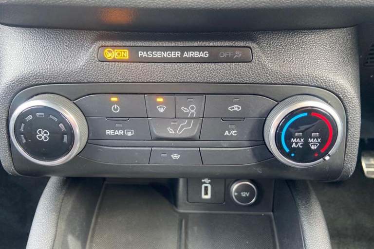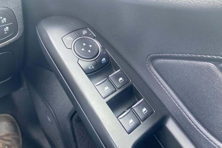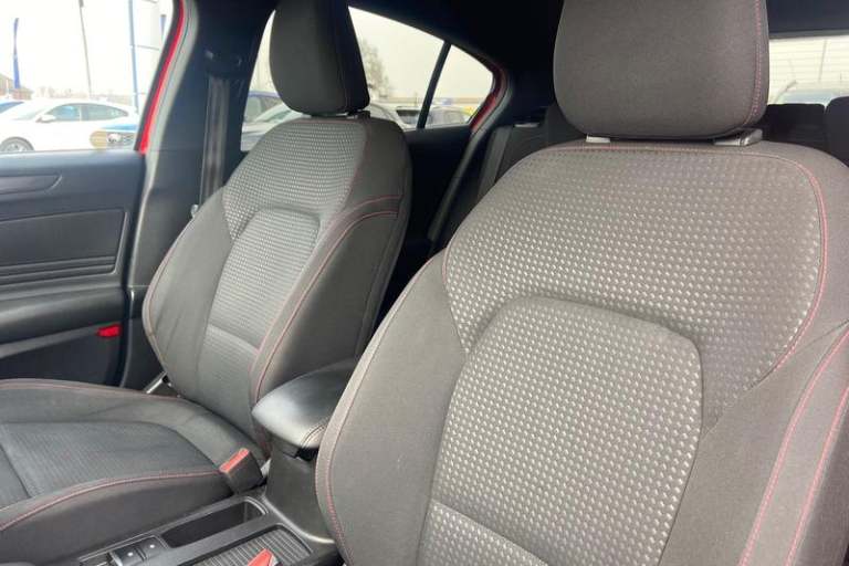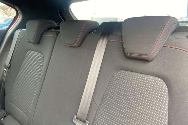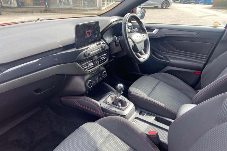 Bluetooth system, Digital clock, Easy fuel capless refuelling system, Eco mode, Ford pass connect, Ford SYNC 3 with 8 TFT touchscreen, and app link Android auto/Apple carplay, Intelligent speed assist, Lane keeping aid with lane departure warning, PAS, Selectable drive mode, Trip computer, 'Quickclear' heated windscreen/heated washer jets, Auto headlamps (on/off), Body colour large rear spoiler, Body colour side skirt, Body coloured bumpers, Body coloured door handles, Body coloured electrically operated and heated door mirrors with side indicators, Electrically operated front and rear windows with one touch opening and closing, Front variable intermittent wipers with electric wash, Halogen reflector headlamps, Heated rear window, LED daytime running lamp, LED front fog lamps with cornering function, Polished twin tailpipe, ST-Line upper and lower grille with full body styling kit and wing badges, Tailgate wash/wipe, 3 spoke flat bottomed leather steering wheel with red stitching, 60/40 split back and cushion rear seats with 2 height adjustable headrests, Alloy finish pedals, Aluminium gear knob, Centre console with armrest, Cloth upholstery with red stitching, Dark headliner, Driver's lumbar support, Front floor mats, Height adjustable front headrests, Isofix child seat preparation, Manual air conditioning, Reach + rake adjustable steering column, Rear centre headrest, ABS+Electronic Brake force Distribution, Auto hold function, Driver airbag, Electronic parking brake, Electronic