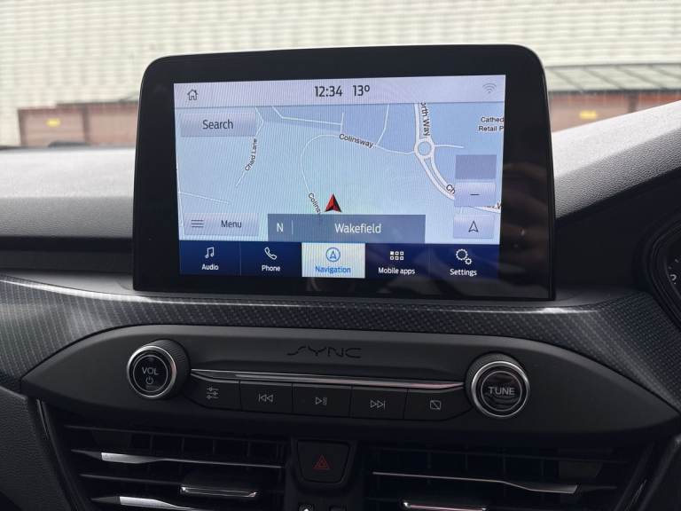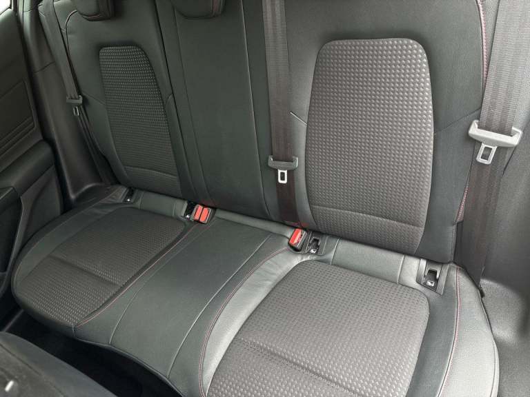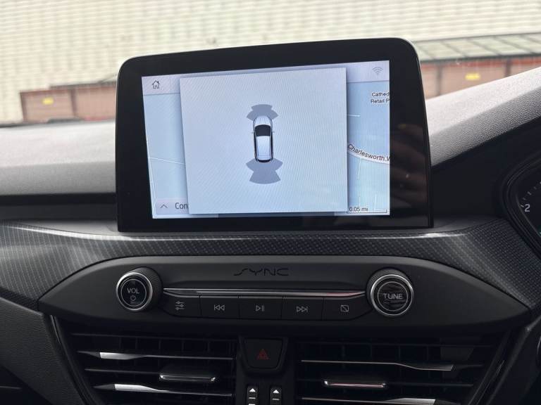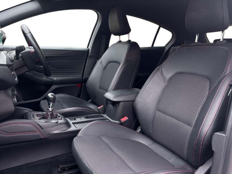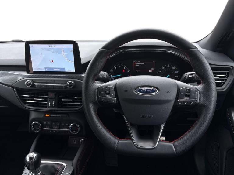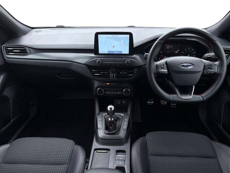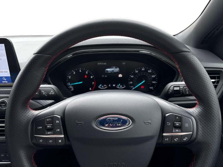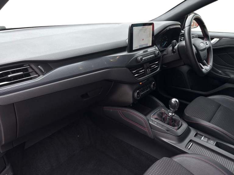 ..4'' TFT coloured cluster screen, Bluetooth system, Digital clock, Easy fuel capless refuelling system, Eco mode, Ford pass connect, Ford SYNC 3 nav system with DAB radio, 8'' colour touch screen, voice control, app link, Apple car play/Android auto and 4.2'' TFT coloured cluster, Lane keeping aid with lane departure warning, PAS, Selectable drive mode, Trip computer, Sports tuned suspension, 2 USB ports, Aux input, 'Quickclear' heated windscreen/heated washer jets, Auto dimming rear view mirror, Auto headlamps (on/off), Automatic rain sensing wipers, Body colour large rear spoiler, Body colour side skirt, Body coloured bumpers, Body coloured door handles, Body coloured electrically operated and heated door mirrors with side indicators, Electrically operated front and rear windows with one touch opening and closing, Front variable intermittent wipers with electric wash, Heated rear window, LED daytime running lamp, LED front fog lamps with cornering function, Polished twin tailpipe, Power folding door mirrors with puddle lights, Rear privacy glass, ST-Line upper and lower grille with full body styling kit and wing badges, Tailgate wash/wipe, Unique door and instrument panel inserts, 3 spoke flat bottomed leather steering wheel with red stitching, 6 way power adjustable driver seat, 60/40 split back and cushion rear seats with 2 height adjustable headrests, Alloy finish pedals, Aluminium gear knob, Centre console with armrest, Dark headliner, Dual zone electronic air temperature control, Front and rear floor mats with red stitching, Front passenger seat manual height and lumbar adjust, Heated front seats, Height adjustable front headrests, Isofix child seat preparation, Part leather upholstery with red stitching, Reach + rake adjustable steering column, Rear centre headrest, Red stitching on steering wheel, Soft console knee pads with red stitching, ABS+Electronic Brake force Distribution, Auto hold function, Driver airbag, Electronic parking brake, Electronic stability control, Front and rear seatbelt reminder, Front inertia reel height adjustable seatbelts with pre-tensioners, Front passenger airbag, Front side airbags, Hill start assist, Passenger airbag deactivate switch, Post collision braking, Pre collision assist with autonomous emergency braking and pedestrian/cyclist detection, Red brake calipers, Side curtain airbags, Three rear inertia reel lap/diagonal seatbelts, Tyre pressure monitoring system, MyKey system, Remote central locking & engine