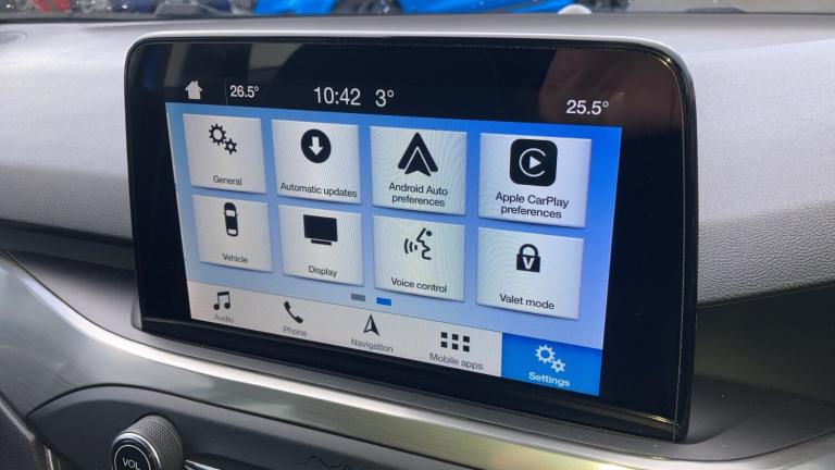 .Front/rear floor mats, Electrically operated front and rear windows with one touch opening and closing, Electronic stability control, Bluetooth system, Selectable drive mode, Easy fuel capless refuelling system, Ford SYNC 3 nav system with DAB radio, 8"" colour touch screen, voice control, app link, Apple car play/Android auto and 4.2"" TFT coloured cluster, Body coloured electrically operated and heated door mirrors with side indicators, Aux input, Body coloured bumpers, LED rear lamps, Dual zone electronic air temperature control, 3 spoke leather trimmed steering wheel with integrated audio controls, Ambient Lighting, Passenger airbag deactivate switch, Rear centre headrest, Remote central locking & engine immobiliser, 16"" 15 spoke sparkle silver alloy wheels, Mini steel spare wheel
