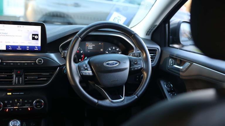 .The Ford Focus 1.0 EcoBoost 125 Titanium X 5dr offers a seamless blend of practicality, performance, and high-tech features, making it an ideal choice for those who value comfort and efficiency. The 1.0 EcoBoost engine provides an impressive balance of power and fuel economy, perfect for both urban and highway driving. Inside, the cabin is well-equipped with a 8'' colour touchscreen, Ford SYNC 3 nav system, and seamless smartphone integration with Apple CarPlay and Android Auto. Enjoy a smooth and connected driving experience with features like Bluetooth, voice control, and Ford Pass Connect, ensuring you stay in control no matter where you are. Comfort features include heated front seats, dual-zone electronic climate control, leather-trimmed steering wheel, part leather upholstery, and a 6-way adjustable driver's seat. The spacious cabin includes practical touches like a centre console with sliding armrest, power folding mirrors with puddle lights, and a 60/40 split rear seat configuration. Safety is paramount in the Focus with features like lane-keeping aid with lane departure warning, pre-collision assist with autonomous emergency braking, side curtain airbags, and intelligent speed assist. The car also includes front and rear parking sensors, hill start assist, and a tyre pressure monitoring system, ensuring peace of mind for you and your passengers. On the outside, the Focus stands out with LED daytime running lights, LED rear lamps, body-coloured bumpers and mirrors, and roof rails for added utility. The car sits on 17'' alloy wheels, adding to its sporty yet refined look. Whether youre commuting or embarking on a longer journey, the Ford Focus Titanium X offers a stylish, connected, and safe ride for all occasions..Bluetooth system, Digital clock, Easy fuel capless refuelling system, Eco mode, Ford pass connect, Ford SYNC 3 nav system with DAB radio, 8'' colour touch screen, voice control, app link, Apple car play/Android auto and 4.2'' TFT coloured cluster, Front and rear parking sensors, Intelligent speed assist, Lane keeping aid with lane departure warning, PAS, Selectable drive mode, Trip computer, 2 USB ports, Aux input, 'Quickclear' heated windscreen/heated washer jets, Auto dimming rear view mirror, Auto headlamps (on/off), Automatic rain sensing wipers, Body coloured bumpers, Body coloured door handles, Body coloured electrically operated and heated door mirrors with side indicators, Electrically operated front and rear windows with one