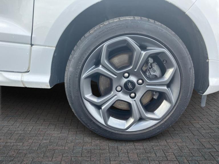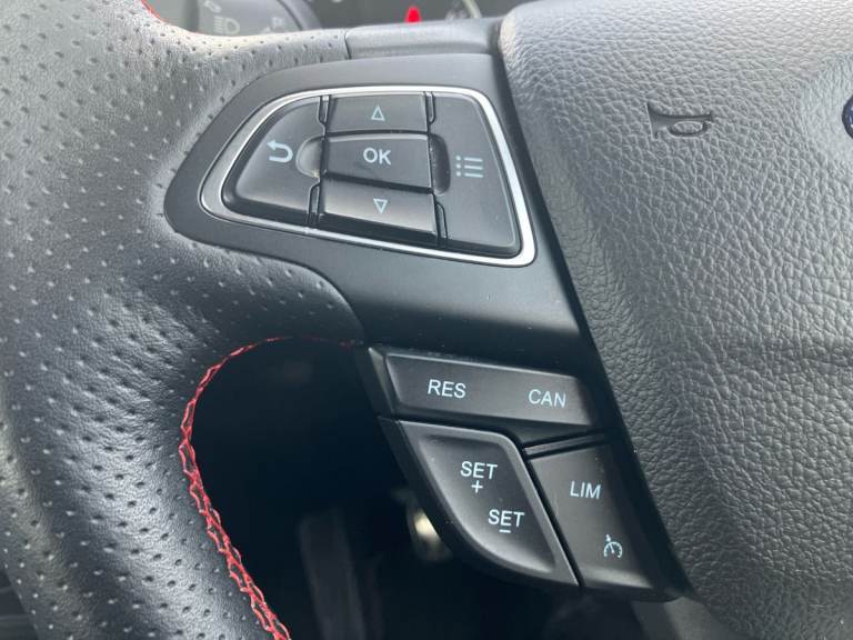..Cruise control with Intelligent speed assist, Easy fuel capless refuelling system, PAS, Rear parking sensors and rear view camera, SYNC 3 nav system with DAB radio,8'' screen, voice control, bluetooth, GPS, emergency assistance,Apple car play/Android auto, 2x USB, Ford pass connect, Traffic sign recognition, Trip computer, Sports suspension, 7 speakers, Steering wheel mounted audio controls, 'Quickclear' heated windscreen/heated washer jets, Auto dimming rear view mirror, Automatic front wipers, Automatic headlights, Black roof rails, Body colour door handles, Body coloured bumpers, Electrically adjustable and heated door mirrors, Front door threshold plates with ST-Line logo, Front fog lights, Headlight levelling control, Large rear spoiler, Power folding door mirrors, Power front and rear windows, Puddle lights, Rear wiper, ST-Line body styling kit, ST-Line front grille, 12V socket in front and rear, 60/40 split rear seats, Ambient lighting, Centre console with sliding front armrest, Cooled glovebox, Courtesy lights with map reading light, Driver seat height/lumbar adjust, Driver's side glovebox, Driver/passenger sunvisors and lidded vanity mirrors, EATC - Electronic Auto Temperature control, Folding grab handles, Front head restraints, Front seat back map pockets, Front/rear floor mats, Illuminated glovebox, Illuminated luggage compartment, Isofix system on outer rear seats, Luggage compartment carpet, Miko dinamica cloth/partial sensico upholstery with red stitching, Overhead console with sunglasses holder, Rake adjustable rear seats, Reach + rake adjustable steering column, Rear headrests, Sensico trimmed steering wheel, handbrake and gearshift gaiter with red stitching, Stainless steel sports pedals, Storage drawers under front seats, Tie down hooks, Variable boot floor, 3x3 point rear seatbelts, ABS, Autonomous emergency braking, Child locks on rear doors, Curtain airbags, Driver airbag, Drivers knee airbag, Electronic Stability Programme with hill launch assist, Front passenger airbag deactivation, Front side airbags, Passenger airbag, Pre collision assist system, Seatbelt reminder for driver and front passenger, Traction control, Tyre pressure monitoring system, Immobiliser, MyKey system, Remote central locking, Thatcham 1 volume sensing alarm, Low rolling resistance tyres, Tyre inflation kit