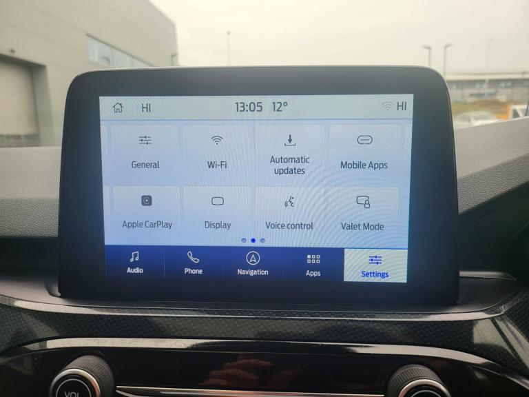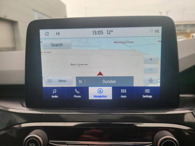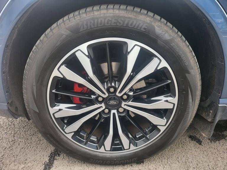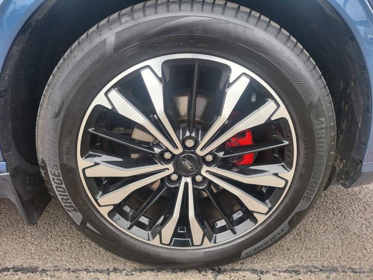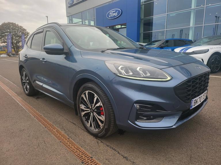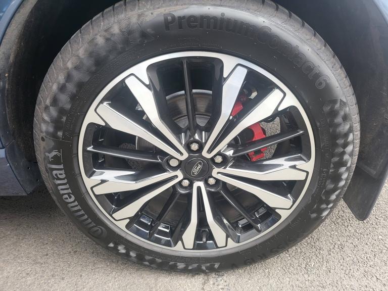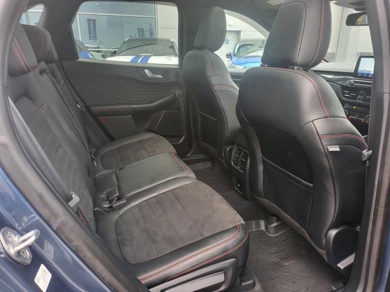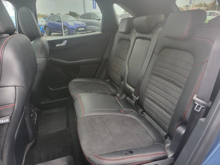 3x3 point rear seatbelts, Airbags - front driver/passenger, front and rear curtain, Drivers knee airbag, Electronic stability control (ESC) and ABS, Ford MyKey Gen 2 safety system, Post collision braking, Powered child proof rear door locks, Pre collision assist with autonomous emergency braking, Red brake calipers, Tyre pressure monitoring system, Cruise control with adjustable speed limiter, Driver impairment monitor, Ford easy fuel, Ford SYNC 3 with 8 inch colour touchscreen, App Link, andriod auto/apple carPlay and navigation with Ford pass connect, Front and rear parking sensors, Hands free power tailgate, Intelligent speed assist, Lane keeping aid with lane departure warning, Mobile phone wireless charging pad, Power assist steering, Selectable drive modes, Auto dimming rear view mirror, Auto headlamps with high and low beam, Auto wipers, Black roof rails, Front LED fog lights with cornering function, Full LED headlamps, Large rear spoiler, LED daytime running lights, LED rear lights, Power folding heated door mirrors with puddle lights, Power front/rear windows with global close, Power opening panoramic roof, Privacy glass, Quickclear heated windscreen, Solid paint, ST Line body styling kit with unique front and rear fascia and bumper, rear painted diffuser, front painted skid plates, dark mesh upper grille, ST Line front scuff plates, Twin exhausts, 10 way power adjustable drivers seat, 2nd row sliding seats, 8 way manual passenger seat including lumbar support and height adjust, Alloy pedals, Ambient lighting, Centre console with electronic parking brake, Dark headlining and pillars, Dual electronic automatic temperature control, Flat bottomed leather steering wheel in sensico with red stitching, Front and rear head restraints, Heated passenger and driver seats, Rear charging point, Sensico partial premium leather upholstery, Sports seats, ST Line front and rear floor mats, Steering wheel mounted paddle shift, BandO with large instrument cluster pack - Kuga, Engine immobiliser, Keyless entry, Keyless start with 'Ford Power' starter button, Locking wheel nuts, Remote powered central double locking doors, Thatcham category 1 alarm, 19 inch 5x2 spoke high gloss machined alloy wheels, Tyre inflation kit