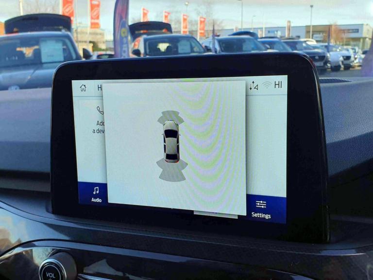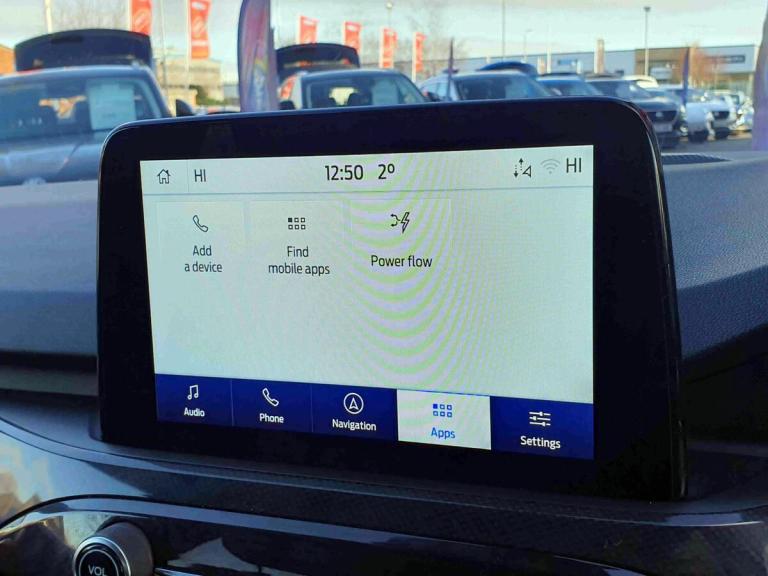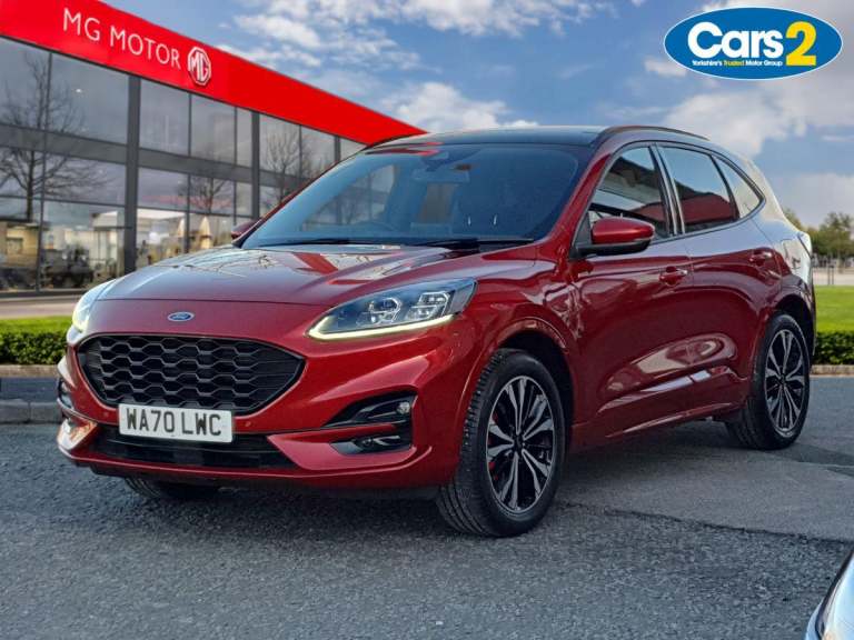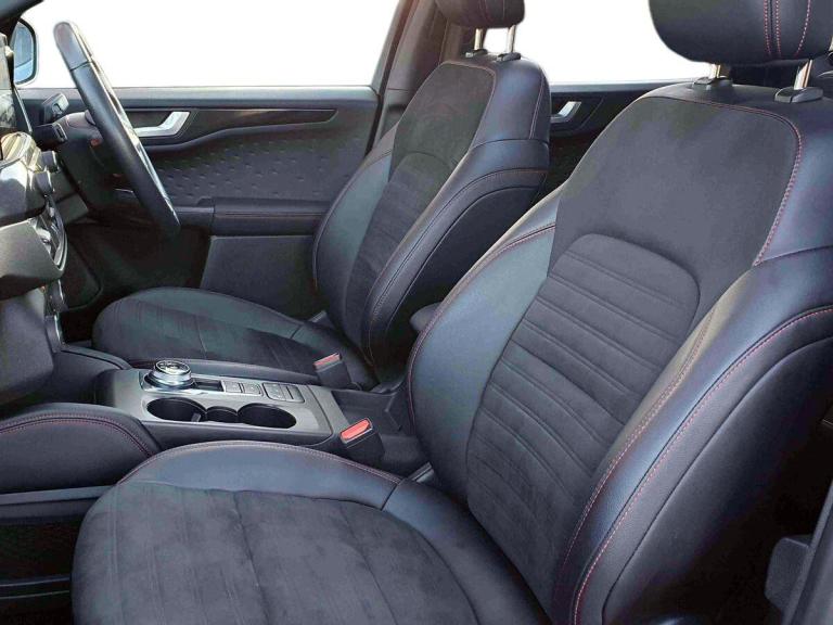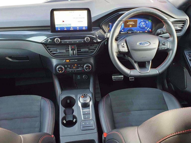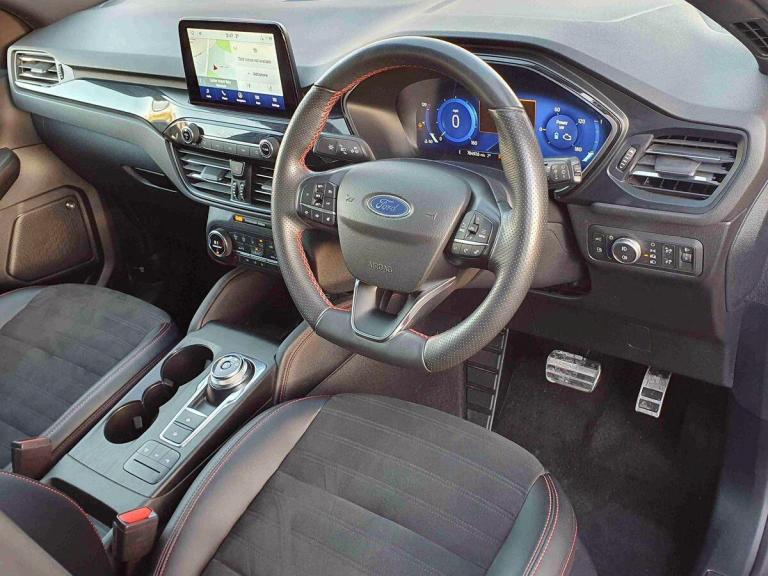 ..Driver impairment monitor, Ford easy fuel, Ford SYNC 3 with 8'' colour touchscreen, App Link, andriod auto/apple carPlay and navigation with Ford pass connect, Front and rear parking sensors, Hands free power tailgate, Intelligent speed assist, Lane keeping aid with lane departure warning, Mobile phone wireless charging pad, Power assist steering, Selectable drive modes, 3-Pin Home charge cable (230V/16A Domestic socket), Sports suspension, Ford DAB audio system with 6 speakers, Auto dimming rear view mirror, Auto headlamps with high and low beam, Auto wipers, Black roof rails, Front LED fog lights with cornering function, Full LED headlamps, Large rear spoiler, LED daytime running lights, LED rear lights, Power folding heated door mirrors with puddle lights, Power front/rear windows with global close, Power opening panoramic roof, Privacy glass, Quickclear heated windscreen, ST Line body styling kit with unique front and rear fascia and bumper, rear painted diffuser, front painted skid plates, dark mesh upper grille, ST Line front scuff plates, Twin exhausts, 10 way power adjustable drivers seat, 2nd row sliding seats, 8 way manual passenger seat including lumbar support and height adjust, Alloy pedals, Ambient lighting, Centre console with electronic parking brake, Dark headlining and pillars, Dual electronic automatic temperature control, Flat bottomed leather steering wheel in sensico with red stitching, Front and rear head restraints, Heated passenger and driver seats, Rear charging point, Sensico partial premium leather upholstery, Sports seats, ST Line front and rear floor mats, B&O with large instrument cluster pack - Kuga, 3x3 point rear seatbelts, Airbags - front driver/passenger, front and rear curtain, Drivers knee airbag, Electronic stability control (ESC) and ABS, Ford MyKey Gen 2 safety system, Post collision braking, Powered child proof rear door locks, Pre collision assist with autonomous emergency braking, Red brake calipers, Tyre pressure monitoring system, Engine immobiliser, Keyless entry, Keyless start with 'Ford Power' starter button, Locking wheel nuts, Remote powered central double locking doors, Thatcham category 1 alarm