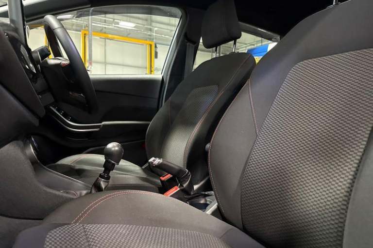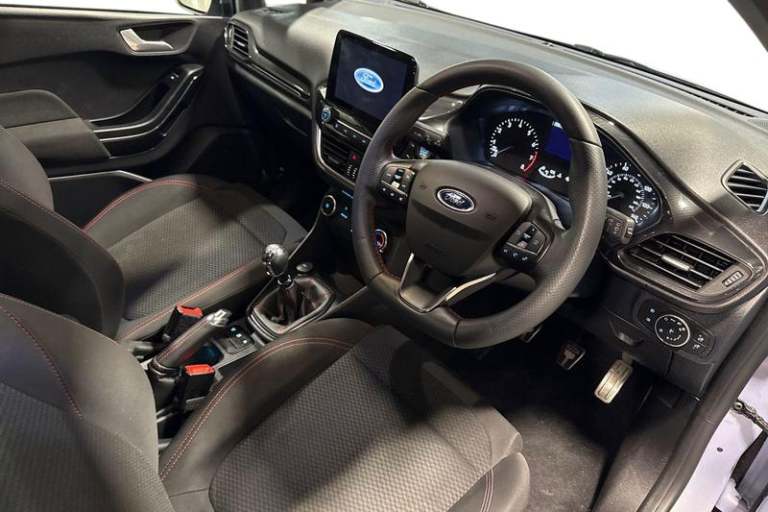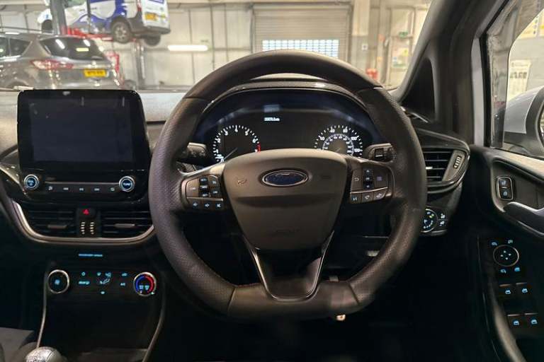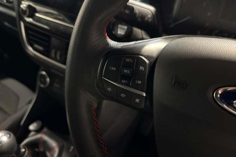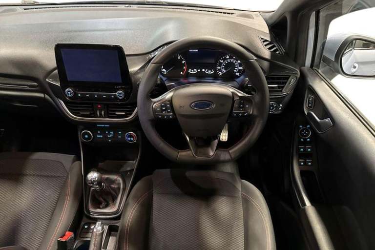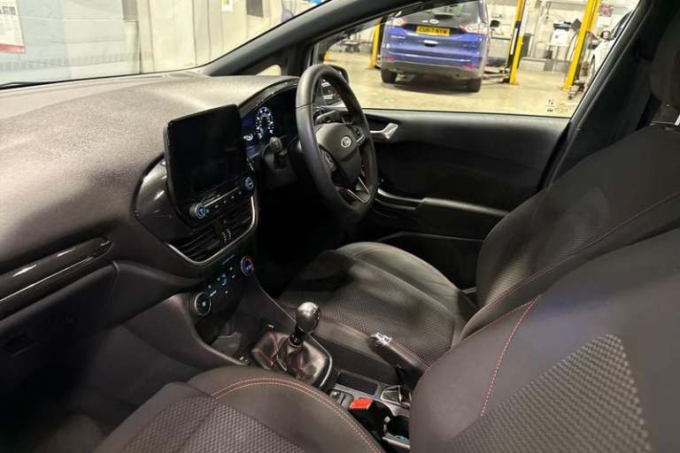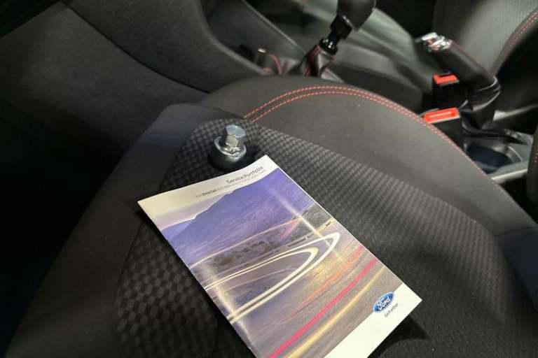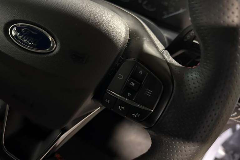 Bluetooth system, Electric power steering, Ford easy fuel, Ford SYNC 3 Navigation system incl 8 touchscreen, 7 speakers, FordPass connect, Apple carplay, android auto, voice control and emergency assistance, Rear parking distance sensors, Selectable drive modes (Normal, Sport, Track), Trip computer, Body colour bumpers, Body colour door handles, Body colour large rear spoiler, Body coloured electrically operated and heated door mirrors with side indicators, Cornering front fog lights, Electric front windows/one touch facility, Electric rear windows, LED Night signature to rear lights, Quickclear heated windscreen, Rain sensing wipers and auto dimming rear view mirror, Rear privacy glass, Rear wiper, Unique ST-Line upper grille & full bodystyling kit with ST-Line wing badges, 3 spoke flat bottomed leather steering wheel, 60/40 split folding rear seat, Adjustable head restraints, Black headlining, Boot carpet, Centre console with opening armrest, 2x cupholders, 12v and USB, Chrome inner door handles, Cloth upholstery, Footwell illumination, Front floor mats in velour, Front map reading lights, Front seat and rear pockets, Illuminated glovebox, Leather gaiter, Load area light, Manual 2 way passenger seat adjust, Manual 4-way driver seat adjust, Manual air conditioning, Overhead console with sunglasses holder, Pollen filter, Rake/reach adjustable steering wheel, Sensico wrapped steering wheel, Sports front seats, 3 point seatbelts on all rear seats, ABS+EBA, Curtain airbags,