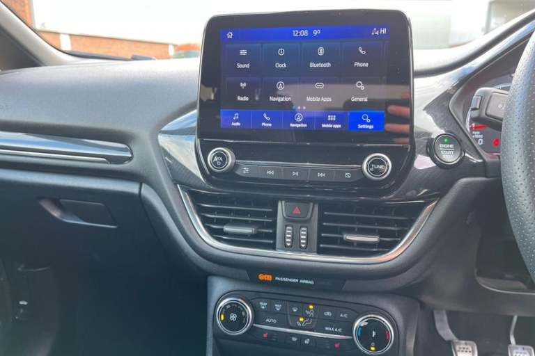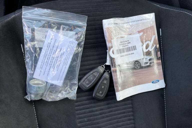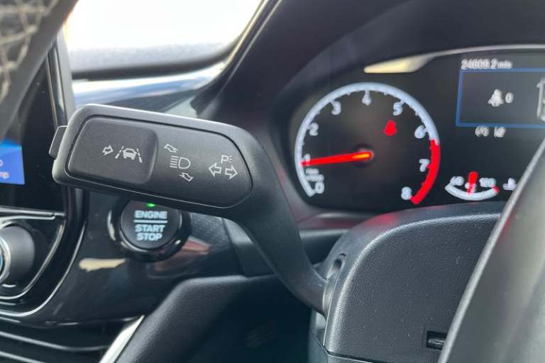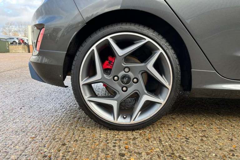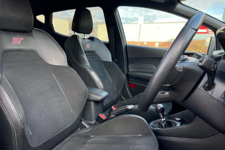 Bluetooth system, Cruise control with active speed limiter, Electric power steering, Ford easy fuel, Selectable drive modes (Normal, Sport, Track), Trip computer, Body colour bumpers, Body colour door handles, Body colour large rear spoiler, Body coloured electrically operated and heated door mirrors with side indicators, Cornering front fog lights, Dual chrome exhaust tailpipe, Electric front windows/one touch facility, Electric rear windows, LED Night signature to rear lights, Quickclear heated windscreen, Rain sensing wipers and auto dimming rear view mirror, Rear privacy glass, Rear wiper, Unique ST front grille, Unique ST rear bumper with diffuser, Unique ST scuff plates, 3 spoke flat bottomed Leather steering wheel with grey stitching, 60/40 split folding rear seat, Adjustable head restraints, Black headlining, Boot carpet, Centre console with opening armrest, 2x cupholders, 12v and USB, Chrome inner door handles, Drivers and Passenger lumbar support, EATC - Electronic Auto Temperature control, Floor mats with grey stitching, Footwell illumination, Front map reading lights, Front seat and rear pockets, Illuminated glovebox, Leather gaiter, Leather handbrake lever with grey stitching, Load area light, Manual 2 way passenger seat adjust, Manual 4-way driver seat adjust, Overhead console with sunglasses holder, Pollen filter, Rake/reach adjustable steering wheel, Recaro leather sports front seats, Seat belts with blue detailing, Unique ST gearknob with grey stitched gaiter