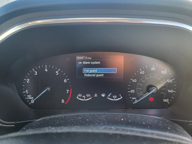 3x3 point rear seatbelts, ABS+Electronic Brake force Distribution, Auto hold function, Driver airbag, Electronic parking brake, Electronic stability control, Front and rear seatbelt reminder, Front inertia reel height adjustable seatbelts with pre-tensioners, Front passenger airbag, Front side airbags, Hill start assist, Manual rear child locks, Passenger airbag deactivate switch, Post collision braking, Pre collision assist with autonomous emergency braking and pedestrian/cyclist detection, Side curtain airbags, Three rear inertia reel lap/diagonal seatbelts, Tyre pressure monitoring system, 4.2 inch TFT coloured cluster, Bluetooth system, Cruise control + speed limiter, Digital clock, E-call, Easy fuel capless refuelling system, Eco mode, Ford SYNC 3 navigation with 8 inch TFT touchscreen, DAB radio and app link Android auto/Apple carplay, Front and rear parking sensors, Intelligent speed assist, Lane keeping system - lane keeping alert and lane keeping aid, PAS, Selectable drive mode, Trip computer, Auto dimming rear view mirror, Auto headlamps (on/off), Automatic rain sensing wipers, Body coloured bumpers, Body coloured door handles, Body coloured electrically operated and heated door mirrors with side indicators, Electrically operated front and rear windows with one touch opening and closing, Front fog lamps with cornering function, Front variable intermittent wipers with electric wash, Heated rear window, LED daytime running lamp, LED reflector headlamps, Power folding door mirrors, Quickclear heated windscreen, Rear side wing doors, Solid paint, Tailgate wash/wipe, Third brake light, Upper grille with chrome surround and horizontal bars, 3 seat bench in 2nd row, 3 spoke Sensico trimmed steering wheel with integrated audio controls, Ambient lighting, Cloth upholstery, Driver's lumbar support, Dual zone electronic air temperature control, Front floor mats, Heated driver and front passenger seats, Height adjustable front headrests, Isofix child seat preparation, Leather gear knob, Reach + rake adjustable steering column, Rear centre headrest, Single front passenger seat, Ford keyfree system with Keyless entry and keyless start/sleep mode key fob, MyKey system, Remote central locking and engine immobiliser, Thatcham category 1 alarm, 2 USB ports, 6 speakers, Aux input, 16 inch 15 spoke sparkle silver alloy wheels, Mini steel spare wheel