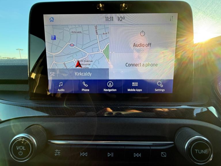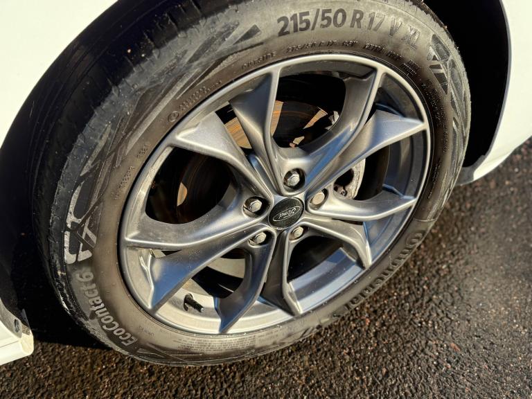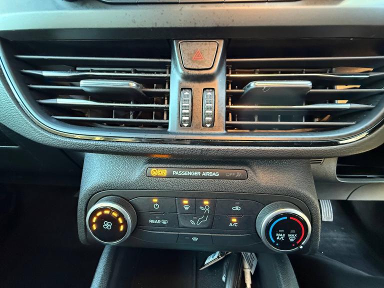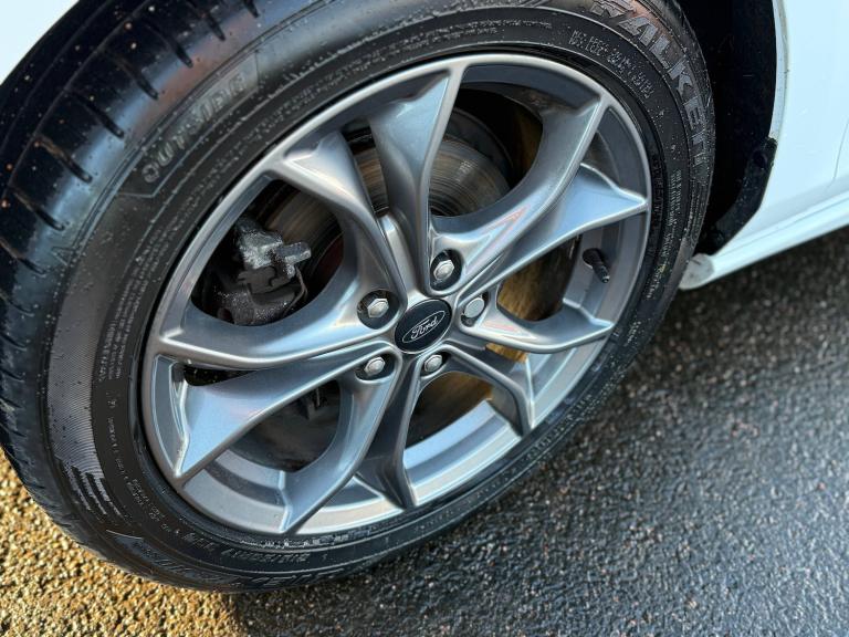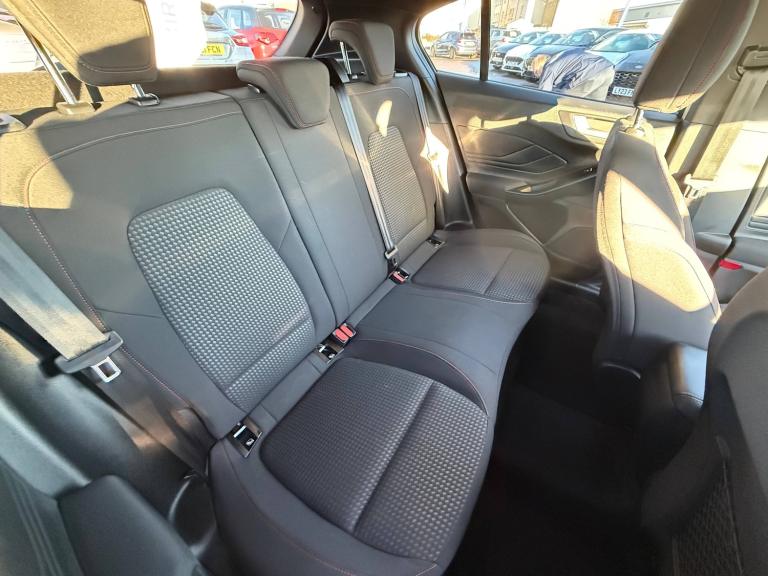 3x3 point rear seatbelts, ABS+Electronic Brake force Distribution, Auto hold function, Driver airbag, Electronic parking brake, Electronic stability control, Front and rear seatbelt reminder, Front inertia reel height adjustable seatbelts with pre-tensioners, Front passenger airbag, Front side airbags, Hill start assist, Manual rear child locks, Passenger airbag deactivate switch, Post collision braking, Pre collision assist with autonomous emergency braking and pedestrian/cyclist detection, Side curtain airbags, Three rear inertia reel lap/diagonal seatbelts, Tyre pressure monitoring system, Bluetooth system, Cruise control + speed limiter, Digital clock, E-call, Easy fuel capless refuelling system, Eco mode, Front and rear parking sensors, Intelligent speed assist, Lane keeping system - lane keeping alert and lane keeping aid, PAS, Selectable drive mode, Trip computer, Auto dimming rear view mirror, Auto headlamps (on/off), Automatic rain sensing wipers, Body colour large rear spoiler, Body coloured bumpers, Body coloured door handles, Body coloured electrically operated and heated door mirrors with side indicators, Electrically operated front and rear windows with one touch opening and closing, Front variable intermittent wipers with electric wash, Heated rear window, LED daytime running lamp, LED front fog lamps with cornering function, LED reflector headlamps, Polished twin tailpipe, Power folding door mirrors, Quickclear heated windscreen, Rear privacy glass, Rear side wing doors, Solid paint, ST-Line upper and lower grille with full body styling kit and wing badges, Tailgate wash/wipe, Third brake light, 3 seat bench in 2nd row, 3 spoke flat bottomed Sensico steering wheel with red stitching, Aluminium gear knob, Cloth upholstery, Dark headliner, Driver's lumbar support, Front floor mats, Height adjustable front headrests, Isofix child seat preparation, Manual air conditioning, Reach + rake adjustable steering column, Rear centre headrest, Single front passenger seat, Sports tuned suspension, Ford keyfree system with Keyless entry and keyless start/sleep mode key fob, MyKey system, Remote central locking and engine immobiliser, Thatcham category 1 alarm, 2 USB ports, 6 speakers, Aux input, Mini steel spare wheel