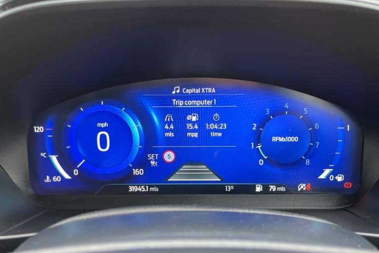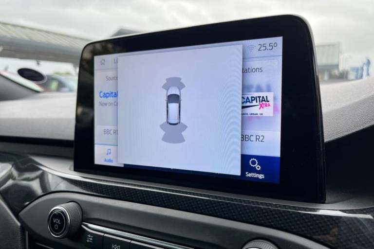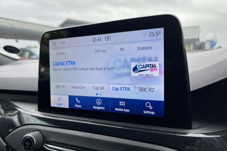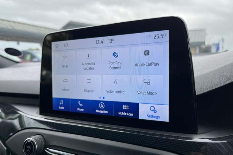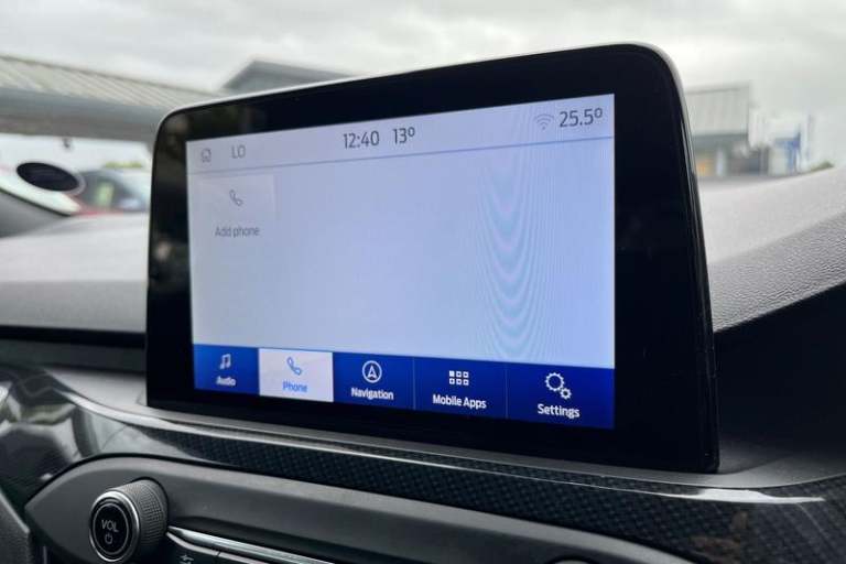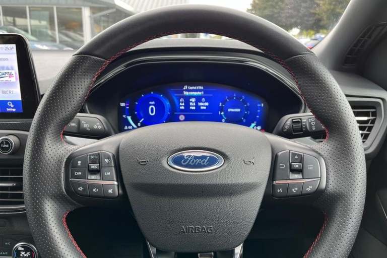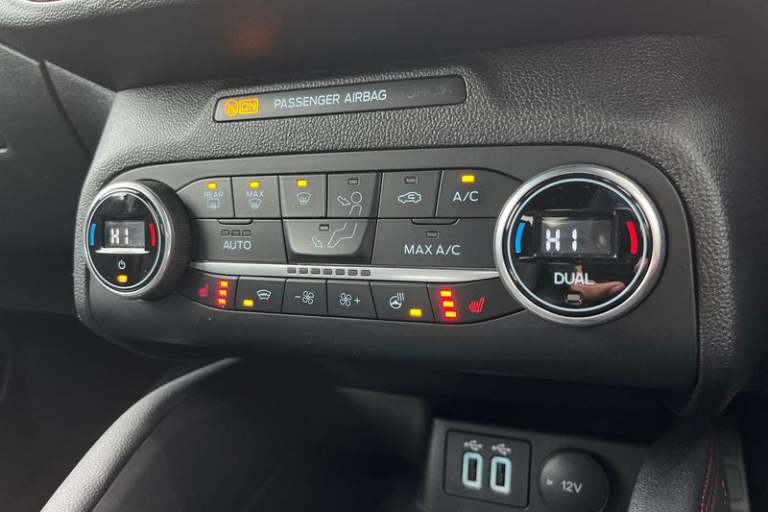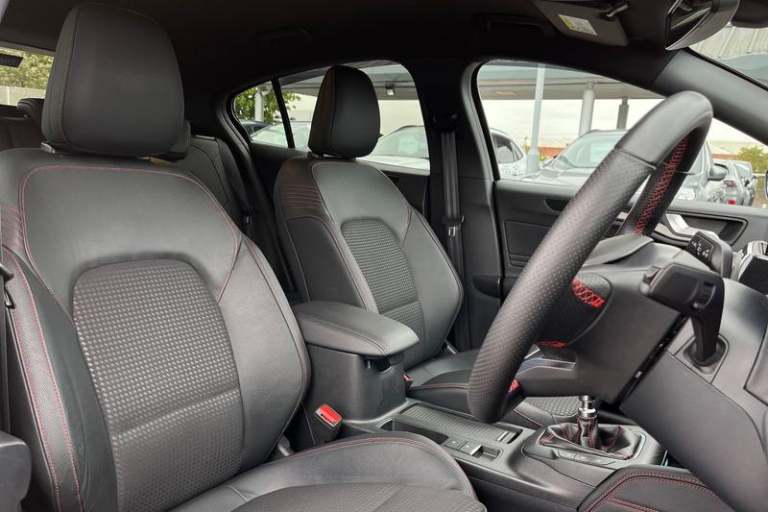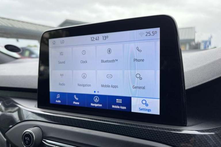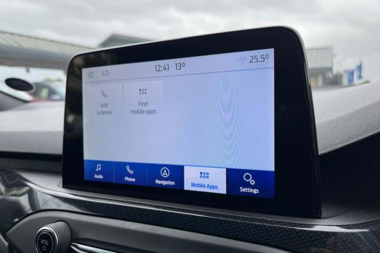 12.3 Digital instrument cluster, Bluetooth system, Digital clock, E-call, Easy fuel capless refuelling system, Eco mode, Ford SYNC 3 navigation with 8 TFT touchscreen, DAB radio and app link Android auto/Apple carplay, Intelligent speed assist, Lane keeping system - lane keeping alert and lane keeping aid, PAS, Selectable drive mode, Trip computer, Auto dimming rear view mirror, Auto headlamps (on/off), Automatic rain sensing wipers, Body colour large rear spoiler, Body coloured bumpers, Body coloured door handles, Body coloured electrically operated and heated door mirrors with side indicators, Electrically operated front and rear windows with one touch opening and closing, Front variable intermittent wipers with electric wash, Heated rear window, LED daytime running lamp, Polished twin tailpipe, Power folding door mirrors with puddle lights, Quickclear heated windscreen, Rear privacy glass, Rear side wing doors, ST-Line upper and lower grille with full body styling kit and wing badges, Tailgate wash/wipe, Third brake light, Unique door and instrument panel inserts, 3 seat bench in 2nd row, 3 spoke flat bottomed Sensico steering wheel with red stitching, 6 way power adjustable driver seat, Aluminium gear knob, Dark headliner, Driver's lumbar support, Dual zone electronic air temperature control, Front and rear floor mats with red stitching, Heated driver and front passenger seats, Heating for Sensico steering wheel, Height adjustable front headrests, Isofix child seat preparation,