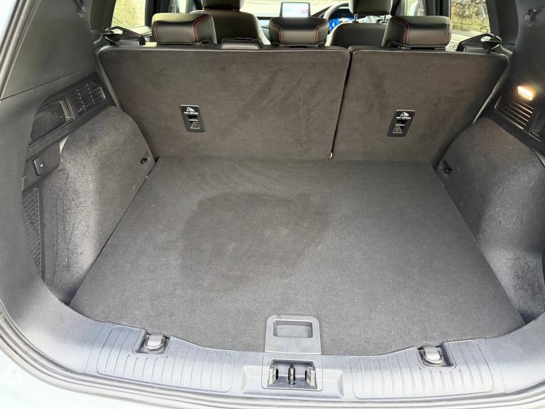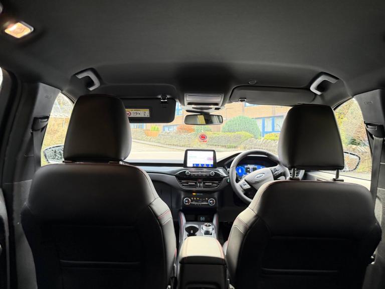 3x3 point rear seatbelts, Airbags - front driver/passenger, front and rear curtain, Drivers knee airbag, Electronic stability control (ESC) and ABS, Ford MyKey Gen 2 safety system, Post collision braking, Powered child proof rear door locks, Pre collision assist with autonomous emergency braking, Red brake calipers, Tyre pressure monitoring system, Cruise control with adjustable speed limiter, Driver impairment monitor, Ford easy fuel, Ford SYNC 3 with 8 inch colour touchscreen, App Link, andriod auto/apple carPlay and navigation with Ford pass connect, Front and rear parking sensors, Intelligent speed assist, Lane keeping aid with lane departure warning, Mobile phone wireless charging pad, Power assist steering, Selectable drive modes, Auto dimming rear view mirror, Auto headlamps with high and low beam, Auto wipers, Black roof rails, Front LED fog lights with cornering function, Full LED headlamps, Large rear spoiler, LED daytime running lights, LED rear lights, Power folding heated door mirrors with puddle lights, Power front/rear windows with global close, Privacy glass, Quickclear heated windscreen, Solid paint, ST Line body styling kit with unique front and rear fascia and bumper, rear painted diffuser, front painted skid plates, dark mesh upper grille, ST Line front scuff plates, Twin exhausts, 2nd row sliding seats, 8 way manual driver seat including lumbar support and height adjust, 8 way manual passenger seat including lumbar support and height adjust, Alloy pedals, Ambient lighting, Centre console with electronic parking brake, Dark headlining and pillars, Dual electronic automatic temperature control, Flat bottomed leather steering wheel in sensico with red stitching, Front and rear head restraints, Rear charging point, Sensico partial premium leather upholstery, Sports seats, ST Line front and rear floor mats, BandO with large instrument cluster pack - Kuga, 3-Pin Home charge cable (230V/16A Domestic socket), Sports suspension, Engine immobiliser, Keyless entry, Keyless start with 'Ford Power' starter button, Locking wheel nuts, Remote powered central double locking doors, Thatcham category 1 alarm, Ford DAB audio system with 6 speakers, 18 inch 10 spoke rock metallic alloy wheels, Tyre inflation kit