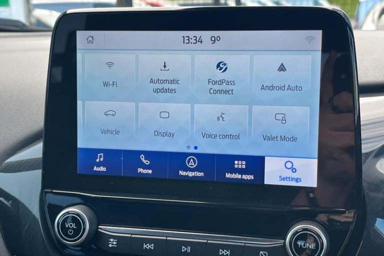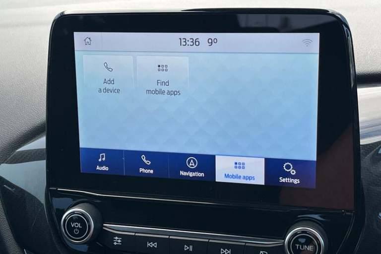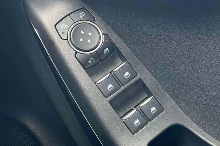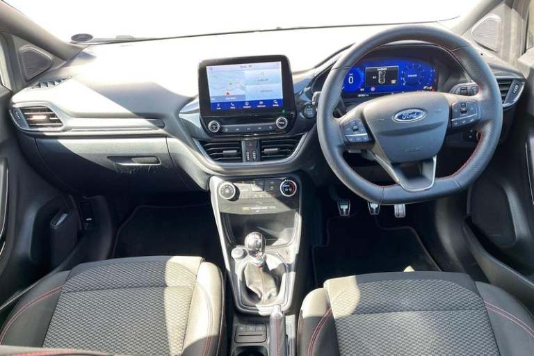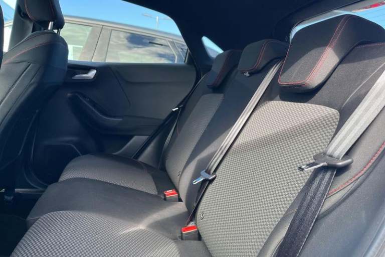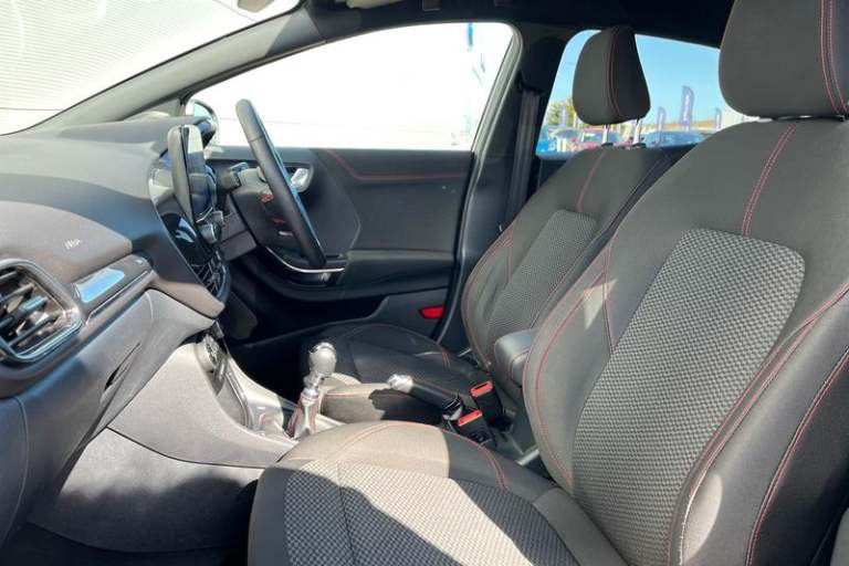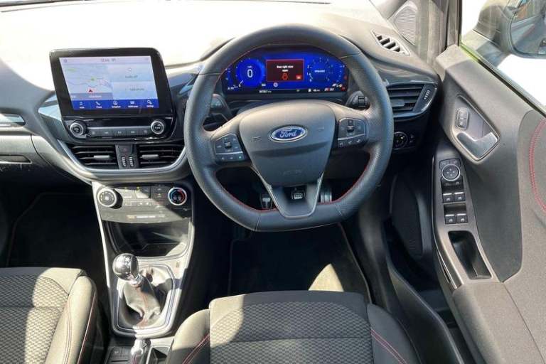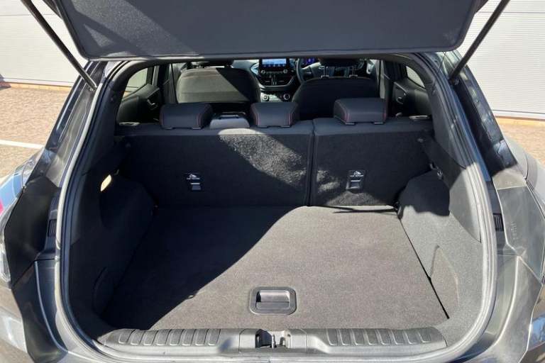 Driver impairment monitor, Emergency call service, Ford easy fuel, Full digital 12.3 instrument cluster, Lane keeping aid with lane departure warning, Power assist steering, Power start button, Rear parking sensor, Selectable drive modes(Normal, Eco, Sport, Slippery and Trail), Speed sign recognition, Automatic headlights with auto high beam, Automatic rain sensing wipers, LED rear lamps, Power foldable heated door mirrors with puddle lamps, Projector headlamps with LED day time running lights and front fog lamps, Quickclear heated windscreen, Rear side wing doors, Rear wiper, ST-Line body styling kit with unique grille, Third brake light, 3 seat bench in 2nd row, Centre console with armrest and stowage, Ford megabox extended bootspace, Front and rear head restraints, Front floor mats, Manual 2 way passenger seat adjustment, Manual 4 way driver seat adjust with lumbar adjustment, Single front passenger seat, ST- Line cloth trim with red stitching, ST-Line flat bottomed sensico leather steering wheel with leather handbrake and aluminium gear knob, 3 rear seatbelts, Child safety lock, Electronic stability control (ESC) and hill start assist, Pedestrian/cyclist detection & post-collision braking, Pre collision assist system, Tyre pressure monitoring system (TPMS)