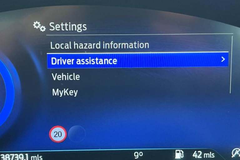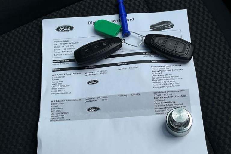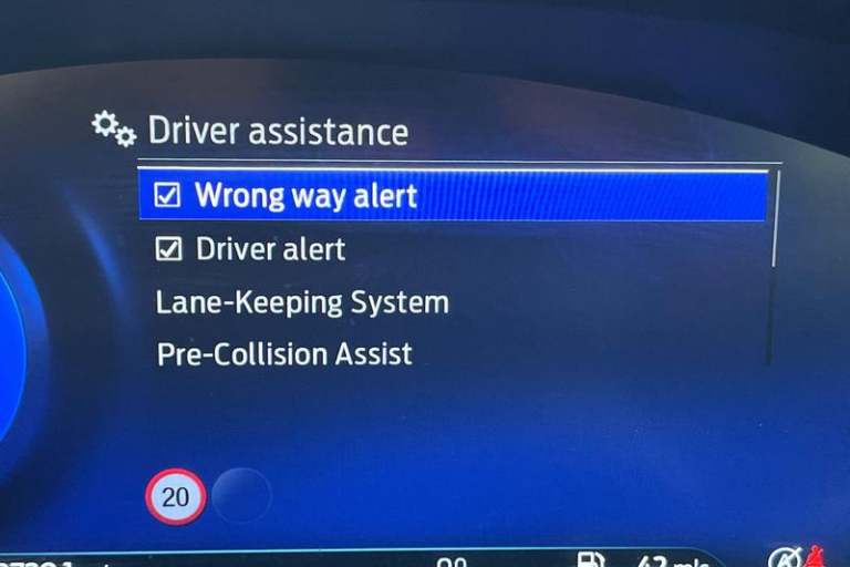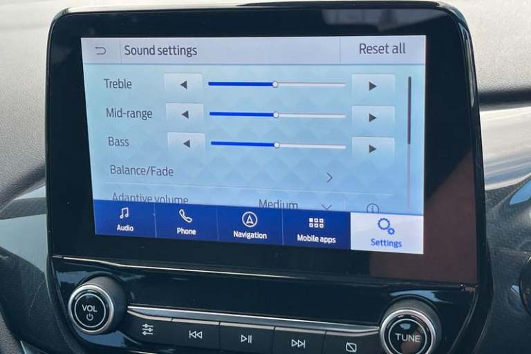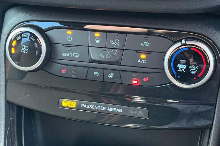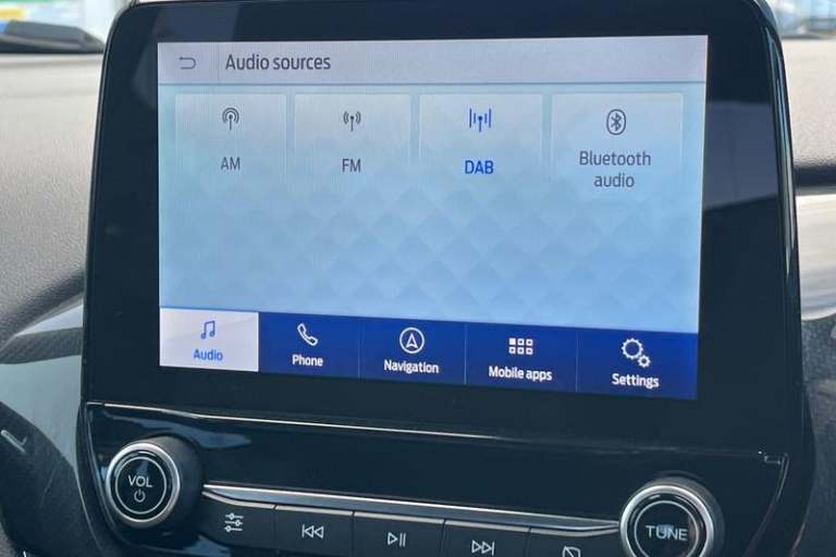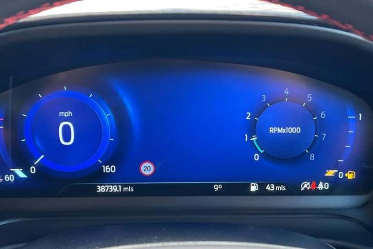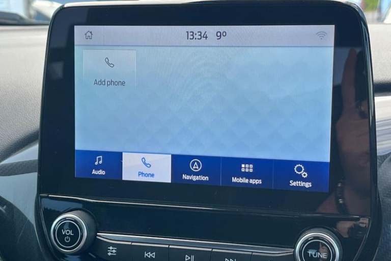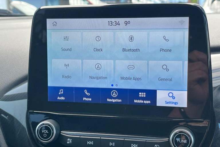 Driver impairment monitor, Emergency call service, Ford easy fuel, Full digital 12.3 instrument cluster, Lane keeping aid with lane departure warning, Power assist steering, Power start button, Rear parking sensor, Selectable drive modes(Normal, Eco, Sport, Slippery and Trail), Speed sign recognition, Automatic headlights with auto high beam, Automatic rain sensing wipers, LED rear lamps, Power foldable heated door mirrors with puddle lamps, Projector headlamps with LED day time running lights and front fog lamps, Quickclear heated windscreen, Rear side wing doors, Rear wiper, ST-Line body styling kit with unique grille, Third brake light, 3 seat bench in 2nd row, Centre console with armrest and stowage, Ford megabox extended bootspace, Front and rear head restraints, Front floor mats, Manual 2 way passenger seat adjustment, Manual 4 way driver seat adjust with lumbar adjustment, Single front passenger seat, ST- Line cloth trim with red stitching, ST-Line flat bottomed sensico leather steering wheel with leather handbrake and aluminium gear knob, 3 rear seatbelts, Child safety lock, Electronic stability control (ESC) and hill start assist, Pedestrian/cyclist detection & post-collision braking, Pre collision assist system, Tyre pressure monitoring system (TPMS)
