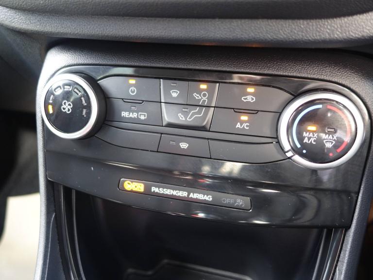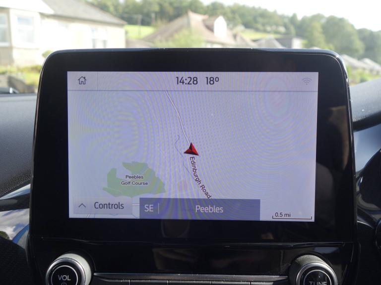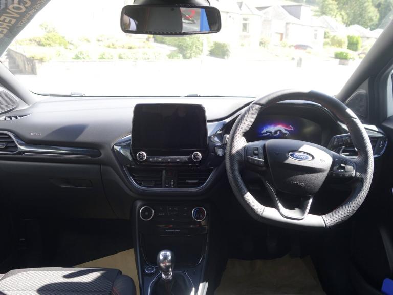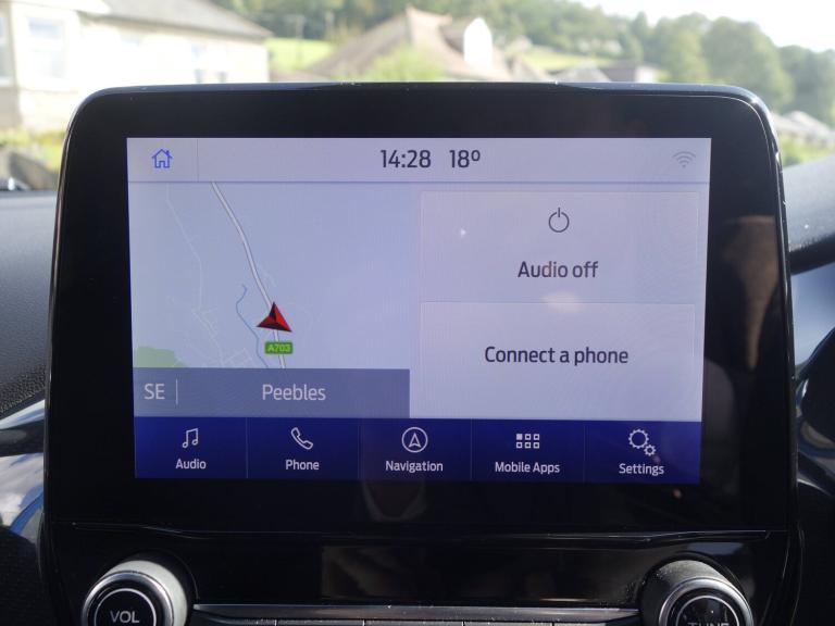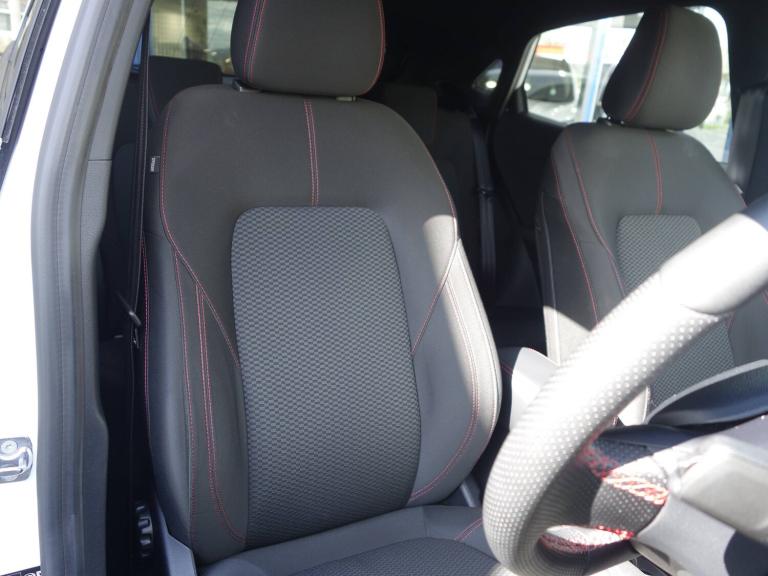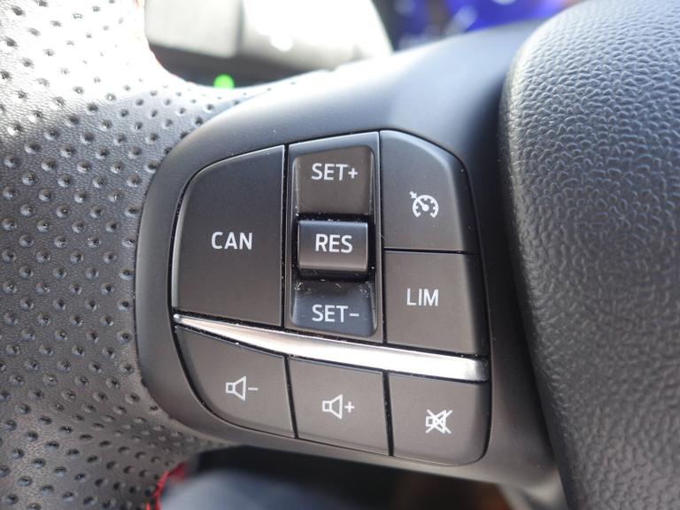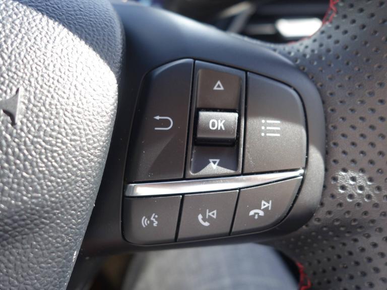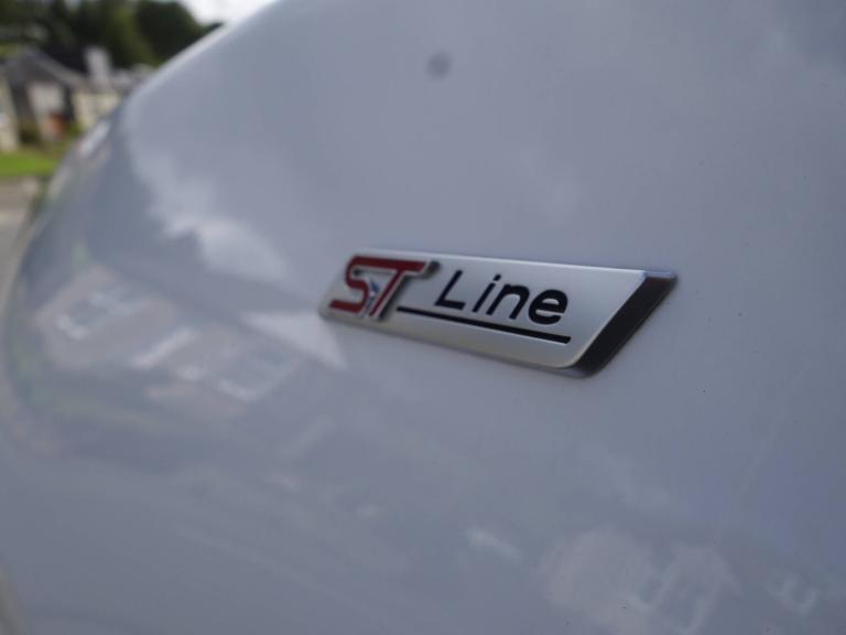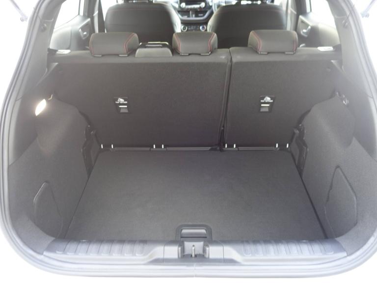 3 rear seatbelts, Child safety lock, Electronic stability control (ESC) and hill start assist, Pedestrian/cyclist detection and post-collision braking, Tyre pressure monitoring system (TPMS), Cruise control with Intelligent speed assist, Emergency call service, Ford easy fuel, Manual tailgate, Power assist steering, Power start button, Selectable drive modes(Normal, sport, Eco, trail, slippery), Automatic headlights, Automatic rain sensing wipers, Body coloured door mirrors, Front fog lights with cornering lights and LED rear lamps, Projector headlamps with LED day time running lights, Quickclear heated windscreen, Rear side wing doors, Rear wiper, Solid paint, ST-Line body styling kit with unique grille and large body colour rear spoiler, Third brake light, 3 seat bench in 2nd row, Centre console with armrest and stowage, Cloth upholstery, Ford megabox extended bootspace, Front and rear floor mats, Front and rear head restraints, Manual 2 way passenger seat adjustment, Manual 4 way driver seat adjust with lumbar adjustment, Manual air conditioning, Single front passenger seat, ST-Line flat bottomed sensico leather steering wheel with leather handbrake and aluminium gear knob, Ford SYNC 3 navigation pack - Puma, Sport suspension, Thatcham alarm, Tyre inflation kit
