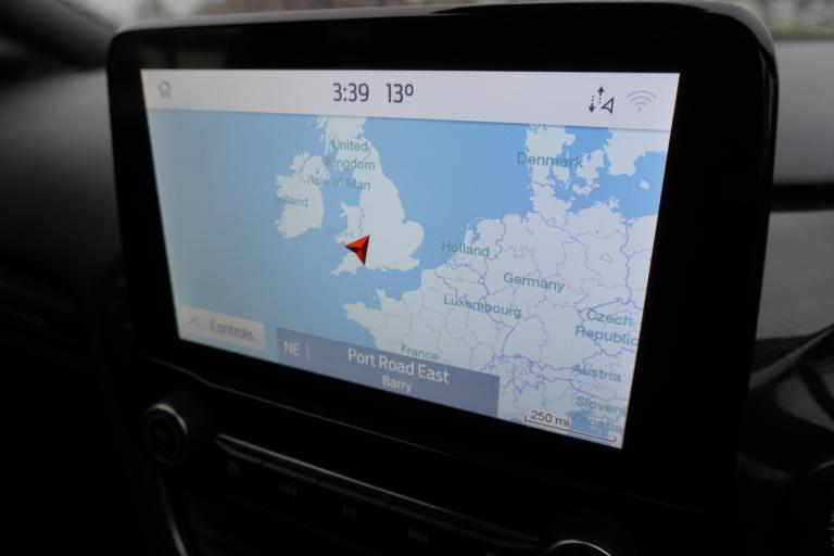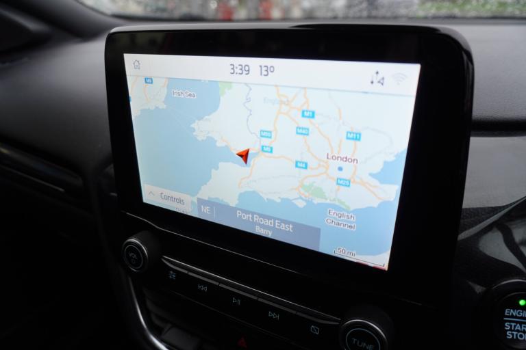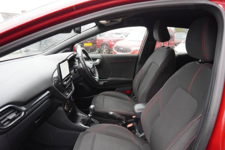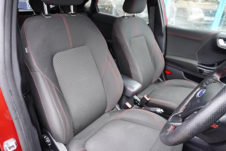 3 rear seatbelts, Autonomous emergency braking, Child safety lock, Electronic stability control (ESC) and hill start assist, Pedestrian/cyclist detection and post-collision braking, Pre collision assist system, Tyre pressure monitoring system (TPMS), Cruise control with Intelligent speed assist, Driver impairment monitor, Emergency call service, Ford easy fuel, Full digital 12.3 inch instrument cluster, Lane keeping aid with lane departure warning, Manual tailgate, Power assist steering, Power start button, Rear parking sensor, Selectable drive modes(Normal, sport, Eco, trail, slippery), Speed sign recognition, Automatic headlights with auto high beam, Automatic rain sensing wipers, Body coloured door mirrors, Body coloured roof, Large body colour rear roof spoiler, LED rear lamps, Power foldable heated door mirrors with puddle lamps, Projector headlamps with LED day time running lights and front fog lamps, Quickclear heated windscreen, Rear side wing doors, Rear wiper, Solid paint, ST-Line body styling kit with unique grille, Third brake light, 3 seat bench in 2nd row, Centre console with armrest and stowage, Ford megabox extended bootspace, Front and rear head restraints, Front floor mats, Manual 2 way passenger seat adjustment, Manual 4 way driver seat adjust with lumbar adjustment, Manual air conditioning, Single front passenger seat, ST- Line cloth trim with red stitching, ST-Line flat bottomed sensico leather steering wheel with leather handbrake and aluminium gear knob, Ford SYNC 3 navigation pack - Puma, Sport suspension, Thatcham alarm, 17 inch 5x2 spoke black machined finished alloy wheel, Tyre inflation kit