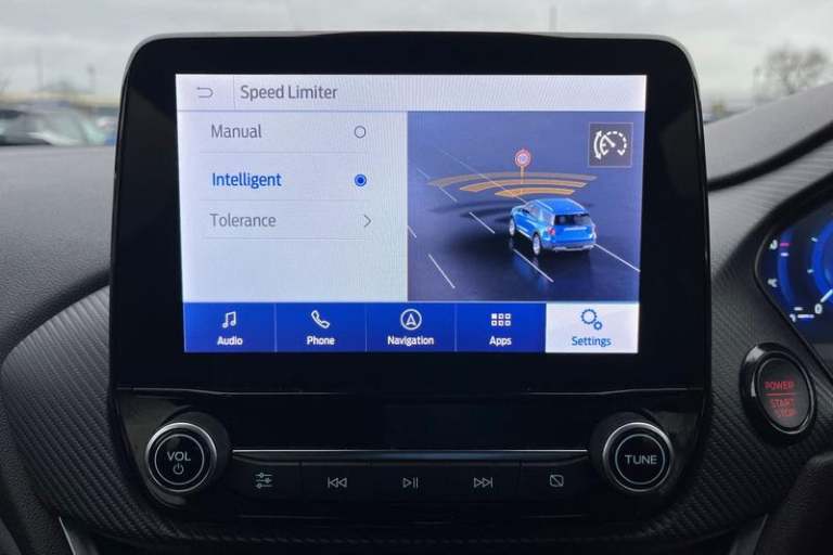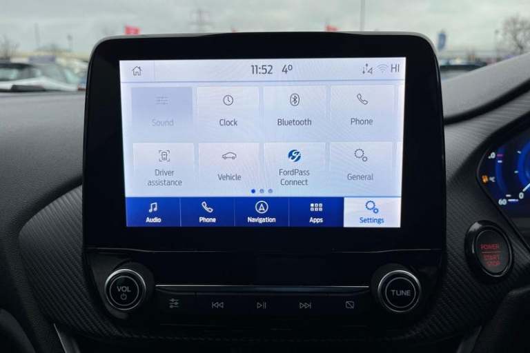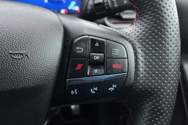 Cruise control with adjustable speed limiter and intelligent speed assist, Driver alert system, Electric power steering, Ford easy fuel, Lane keep assist, Lane keeping aid, Rear parking distance sensors, Rear view camera, Selectable drive modes (Normal, Sport, Track), Traffic sign recognition, Trip computer, 3rd brake light, Auto high beam, Automatic headlights, Body colour bumpers, Body coloured electrically operated with side indicators, Dual chrome exhaust tailpipe, Electric front windows/one touch facility, Electric rear windows, LED rear lights, Matrix LED headlights with signature LED daytime running lights and integrated sequential indicator, Quickclear heated windscreen, Rain sensing wipers and auto dimming rear view mirror, Rear privacy glass, Rear side wing doors, Rear wiper, Unique ST front grille and bumper, ST rear bumper with diffusor, Unique ST scuff plates, 3 rear headrests, 3 seat bench in 2nd row, 6 way manual driver seat adjust, with lumbar adjust, 6 way manual passenger seat adjust, with lumbar adjust, Adjustable head restraints, Centre console with opening armrest, 2x cupholders, 12v and USB, EATC - Electronic Auto Temperature control, Floor mats with red stitching, Ford Performance sensico partial premium leather upholstery with red stitching, Ford performance sports seats, Leather gear knob with red stitching, Leather steering wheel with red stitching, Seat belts with red detailing, Single front passenger seat, Unique ST soft feel gearknob, 3 point