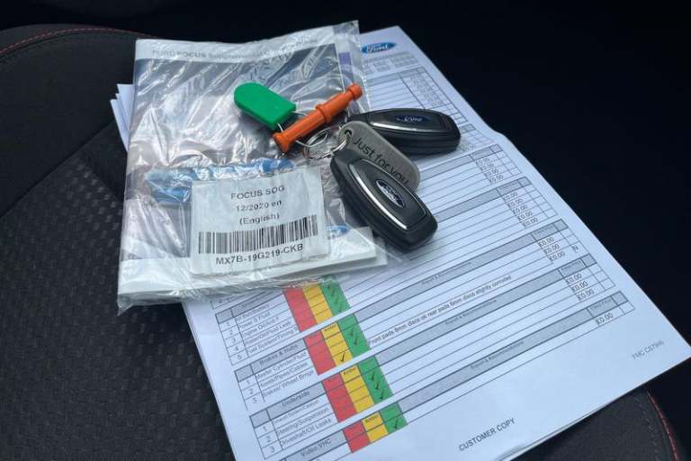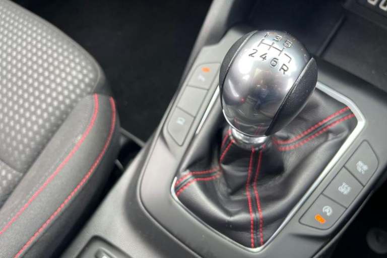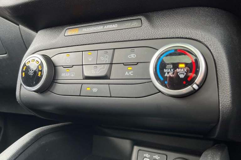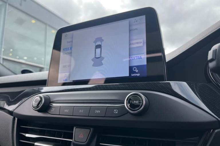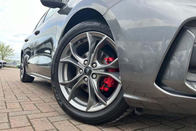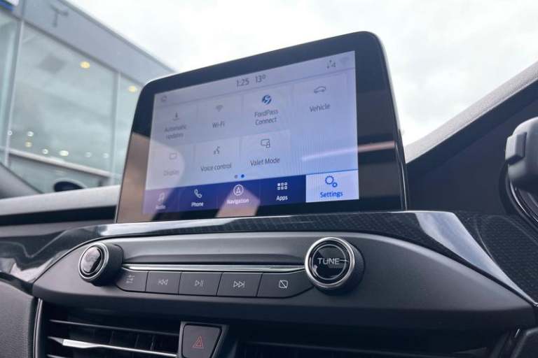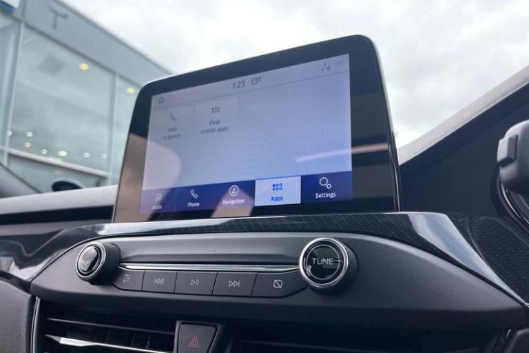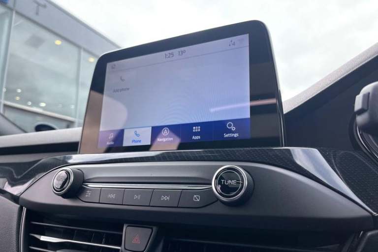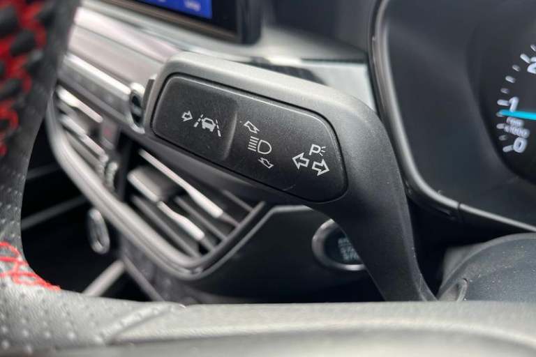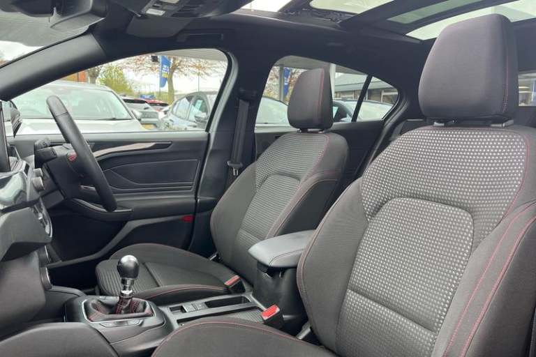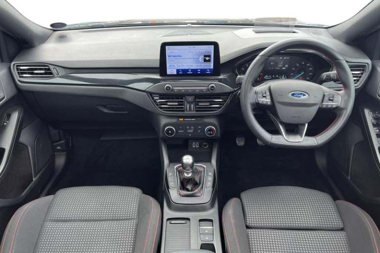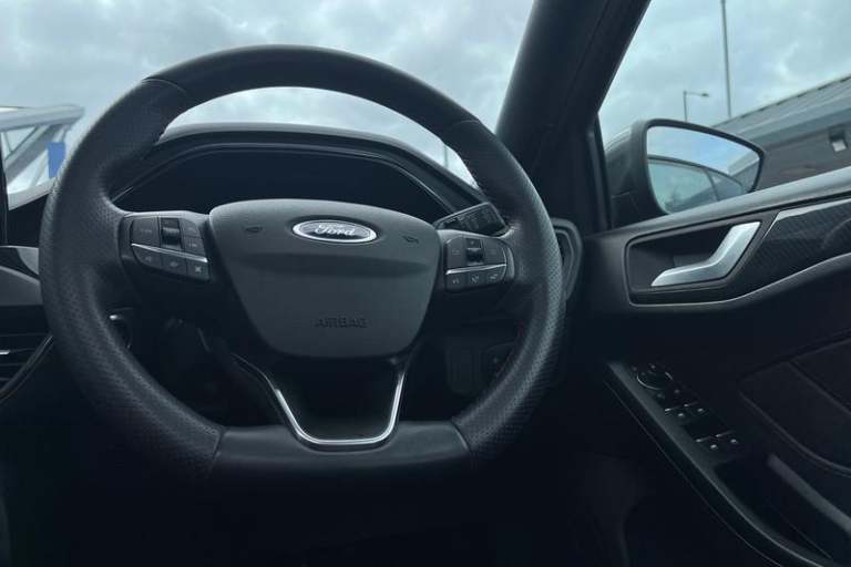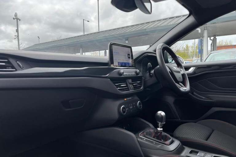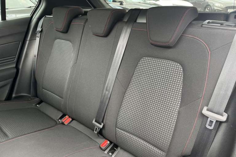 4.2 TFT coloured cluster, Bluetooth system, Digital clock, E-call, Easy fuel capless refuelling system, Eco mode, Ford SYNC 3 navigation with 8 TFT touchscreen, DAB radio and app link Android auto/Apple carplay, Intelligent speed assist, Lane keeping system - lane keeping alert and lane keeping aid, PAS, Selectable drive mode, Trip computer, Auto dimming rear view mirror, Auto headlamps (on/off), Automatic rain sensing wipers, Body colour large rear spoiler, Body coloured bumpers, Body coloured door handles, Body coloured electrically operated and heated door mirrors with side indicators, Electrically operated front and rear windows with one touch opening and closing, Front variable intermittent wipers with electric wash, Heated rear window, LED daytime running lamp, LED front fog lamps with cornering function, LED reflector headlamps, Polished twin tailpipe, Power folding door mirrors, Quickclear heated windscreen, Rear privacy glass, Rear side wing doors, ST-Line upper and lower grille with full body styling kit and wing badges, Tailgate wash/wipe, Third brake light, 3 seat bench in 2nd row, 3 spoke flat bottomed Sensico steering wheel with red stitching, Aluminium gear knob, Cloth upholstery, Dark headliner, Driver's lumbar support, Front floor mats, Height adjustable front headrests, Isofix child seat preparation, Manual air conditioning, Reach + rake adjustable steering column, Rear centre headrest, Single front passenger seat, 3x3 point rear seatbelts, ABS+Electronic