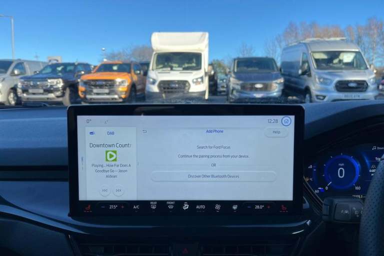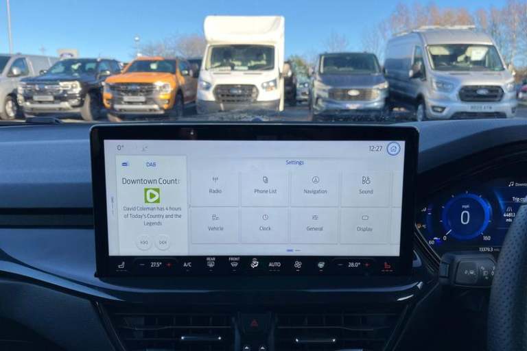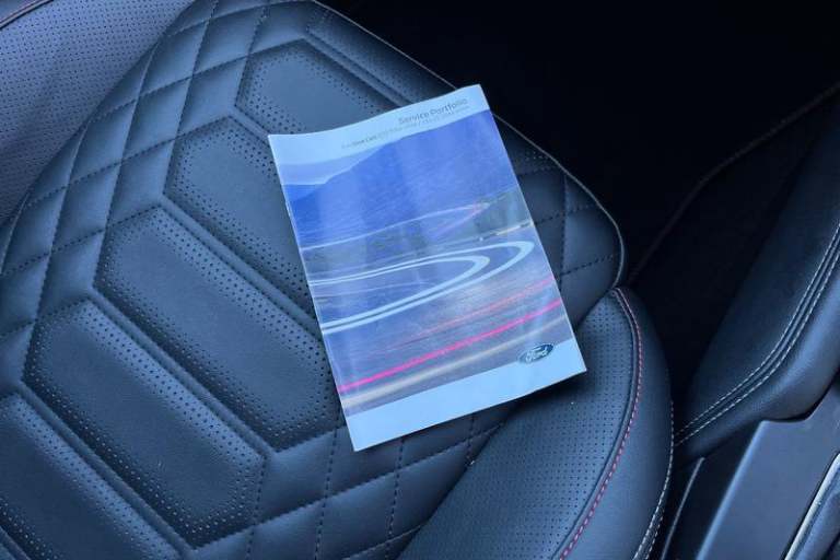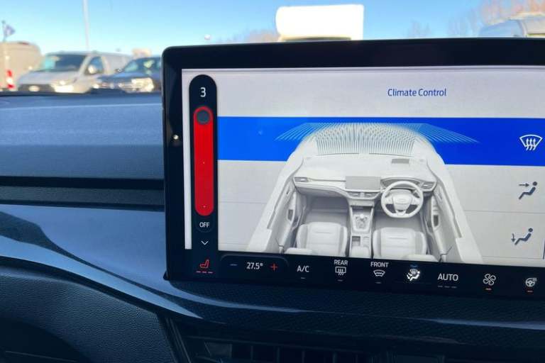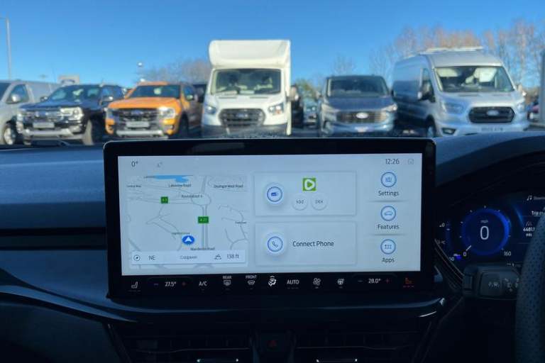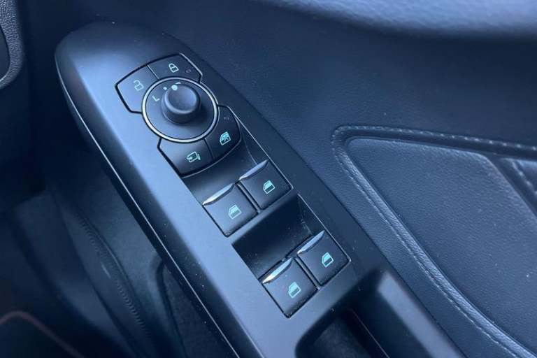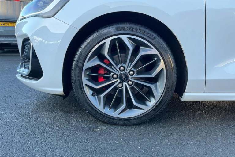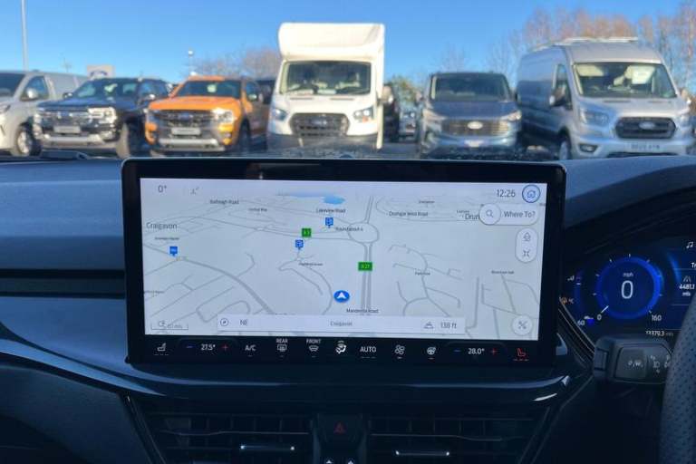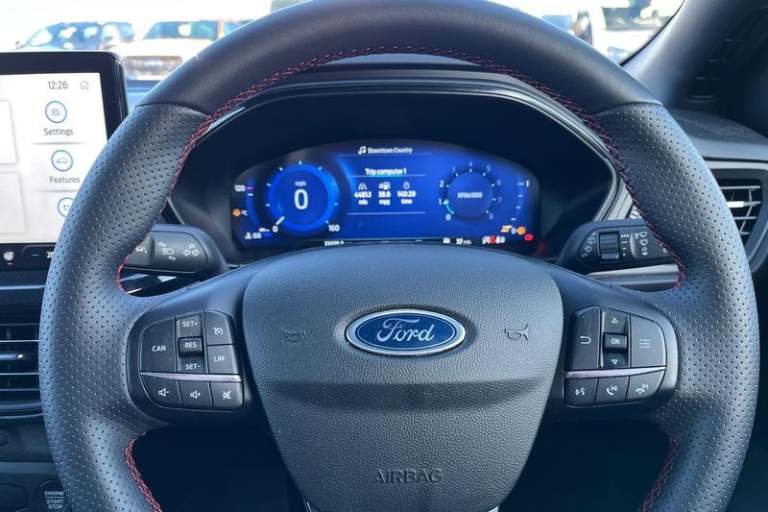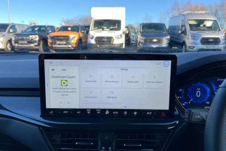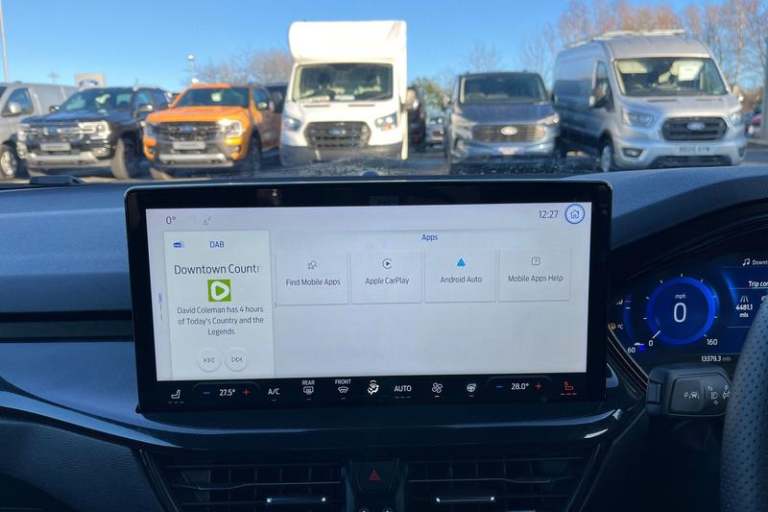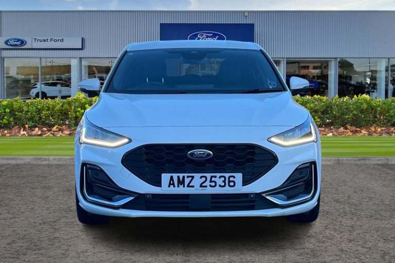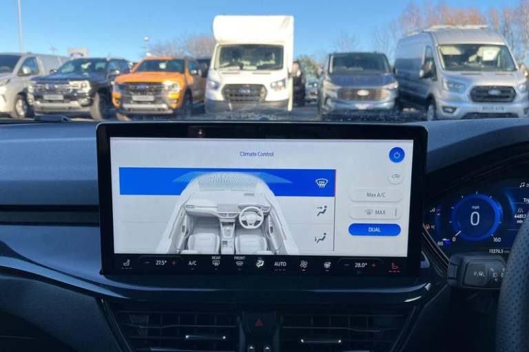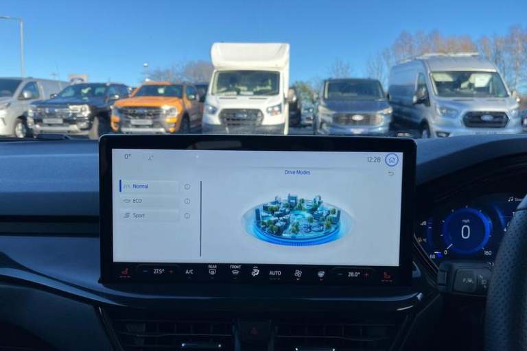 12.3 Digital instrument cluster, Bluetooth system, Digital clock, Easy fuel capless refuelling system, Eco mode, Ford SYNC4 Nav with 13.2'' touchscreen, DAB, Emergency Assistance, Apple Carplay & Android Auto, B&O Premium Audio with 10 speakers, FordPass Connect, Lane keeping system - lane keeping alert and lane keeping aid, PAS, Rev counter, Selectable drive mode, Service interval indicator, Trip computer, Wireless charging pad, Auto headlamps (on/off), Body coloured door handles, Electrically operated front and rear windows with one touch opening and closing, Electrically operated heated power fold door mirrors with puddle lamp with side indicators, Front variable intermittent wipers with electric wash, Heated rear window, LED daytime running lamp, LED rear lamps, LED third brake light, Polished twin tailpipe, Privacy glass, Quickclear heated windscreen, Rain sensor, Rear side wing doors, Tailgate wash/wipe, Unique ST-Line grille, full bodystyling kit, and large body coloured rear spoiler, 3 rear headrests, 3 seat bench in 2nd row, Dual zone electronic air temperature control, Full sensico premium upholstery, Height adjustable front headrests, Isofix child seat preparation, Load through ski hatch, Manual 4-way passenger seat adjusts, Power 4-way driver seat adjust, with power lumbar adjust, Reach + rake adjustable steering column, Single front passenger seat, 3x3 point rear seatbelts, ABS+Electronic Brake force Distribution, Auto hold function, Driver airbag, EDL traction
