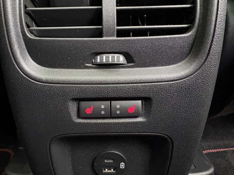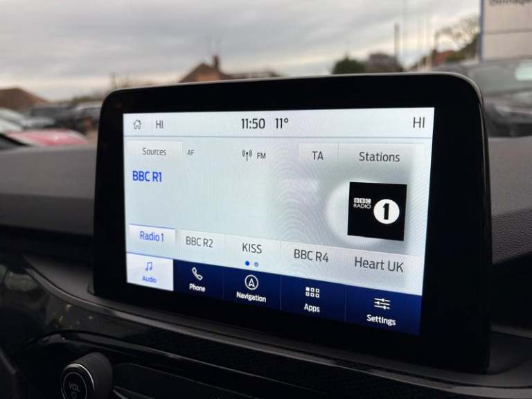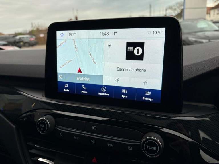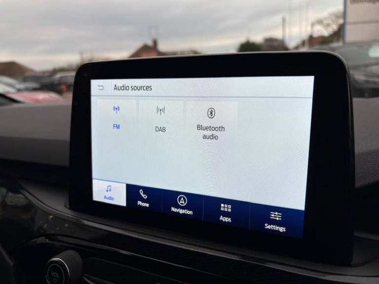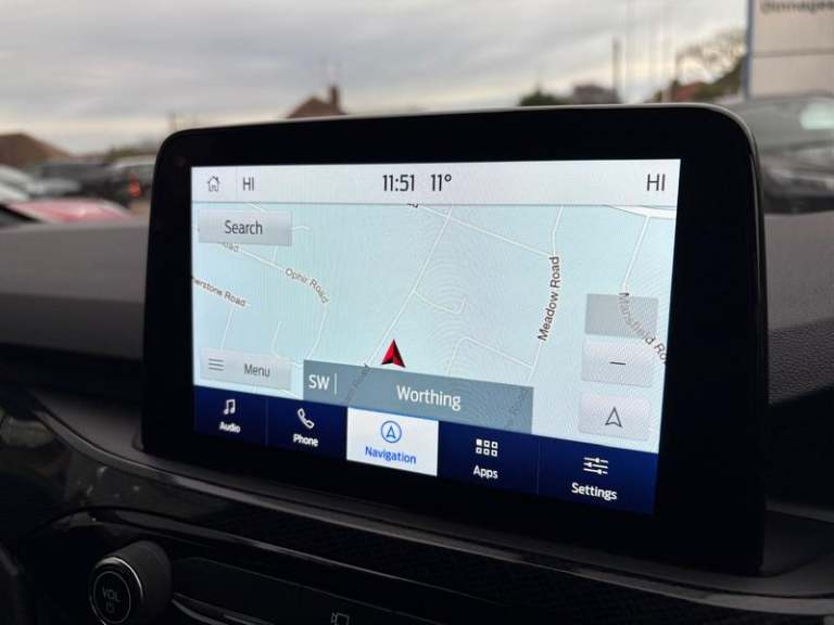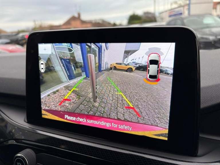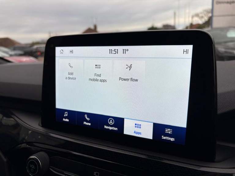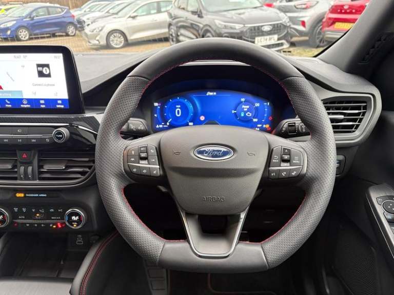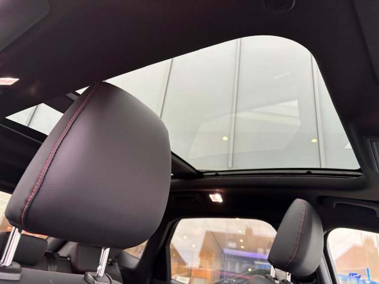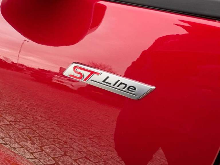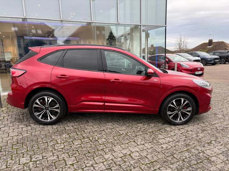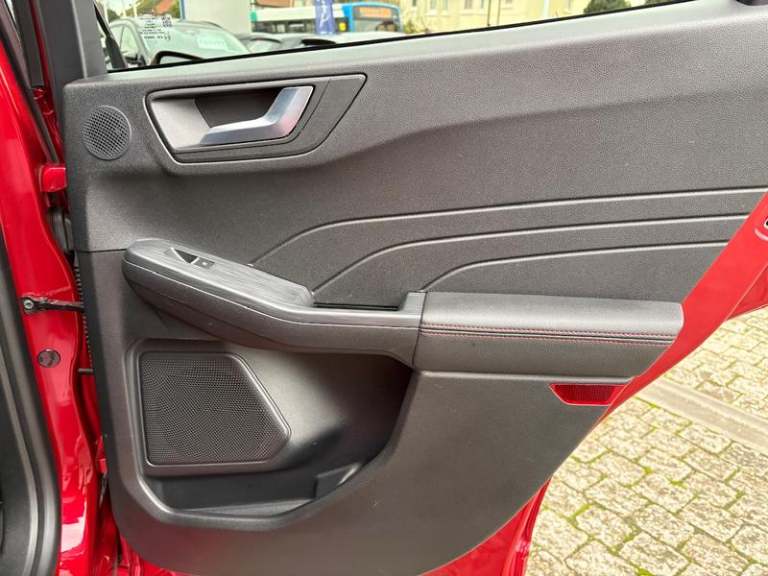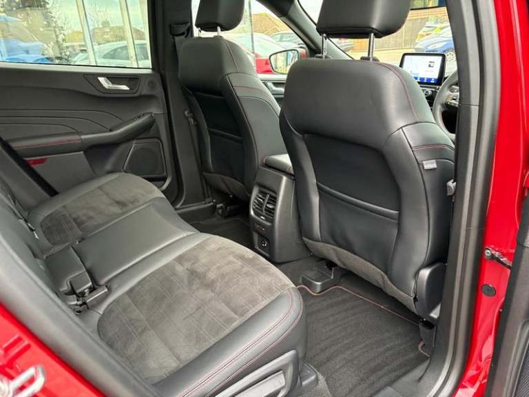 Black roof rails, Engine immobiliser, Heated rear seats, Locking wheel nuts, Quickclear heated windscreen, Rear centre head restraint, Rear wiper, Sports seats, Sports suspension, Service interval indicator, Body colour bumpers, Front and rear head restraints, Third brake light, Heated steering wheel, Day/night rear view mirror, Power front/rear windows with global close, Rear privacy glass, Rear view camera, Tyre pressure monitoring system, Drivers knee airbag, 3x3 point rear seatbelts, Alloy pedals, Red brake calipers, LED daytime running lights, Front and rear parking sensors, LED rear lights, Hands free power tailgate, Ford easy fuel, Rear seat Occupancy alert, Post collision braking, Power assist steering, Ford MyKey Gen 2 safety system, Thatcham category 1 alarm, Lane keeping aid with lane departure warning, Remote powered central double locking doors, Rain sensing wipers, Airbags - front driver/passenger, front and rear curtain, 3.7 kW monophase on board charger, Selectable drive modes, Electronic stability control (ESC) and ABS, Pre collision assist with autonomous emergency braking, ST Line front and rear floor mats, ST Line front scuff plates, Twin exhausts, Power opening panoramic roof, Auto headlamps with high and low beam, Front LED fog lamps, Centre console with electronic parking brake, Dark headlining and pillars, ST Line body styling kit with unique front and rear fascia and bumper, rear painted diffuser, front painted skid plates, dark mesh upper grille, Heated