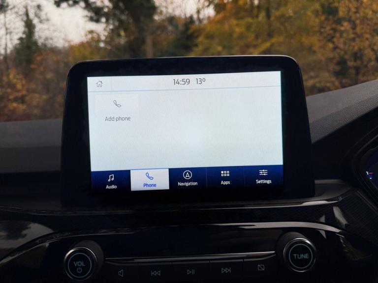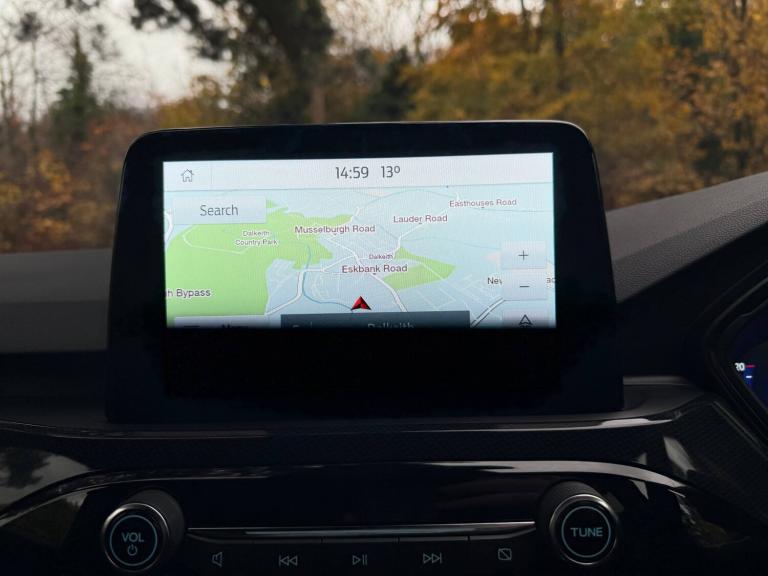 3x3 point rear seatbelts, Airbags - front driver/passenger, front and rear curtain, Drivers knee airbag, Electronic stability control (ESC) and ABS, Ford MyKey Gen 2 safety system, Post collision braking, Powered child proof rear door locks, Pre collision assist with autonomous emergency braking, Red brake calipers, Tyre pressure monitoring system, Cruise control with adjustable speed limiter, Driver impairment monitor, Ford easy fuel, Ford SYNC 3 with 8 inch colour touchscreen, App Link, andriod auto/apple carPlay and navigation with Ford pass connect, Front and rear parking sensors, Intelligent speed assist, Lane keeping aid with lane departure warning, Mobile phone wireless charging pad, Power assist steering, Selectable drive modes, Auto dimming rear view mirror, Auto headlamps with high and low beam, Auto wipers, Black roof rails, Front LED fog lights with cornering function, Full LED headlamps, Large rear spoiler, LED daytime running lights, LED rear lights, Power folding heated door mirrors with puddle lights, Power front/rear windows with global close, Privacy glass, Quickclear heated windscreen, Solid paint, ST Line body styling kit with unique front and rear fascia and bumper, rear painted diffuser, front painted skid plates, dark mesh upper grille, ST Line front scuff plates, Twin exhausts, 2nd row sliding seats, 8 way manual driver seat including lumbar support and height adjust, 8 way manual passenger seat including lumbar support and height adjust, Alloy pedals, Ambient lighting, Centre console with electronic parking brake, Dark headlining and pillars, Dual electronic automatic temperature control, Flat bottomed leather steering wheel in sensico with red stitching, Front and rear head restraints, Rear charging point, Sensico partial premium leather upholstery, Sports seats, ST Line front and rear floor mats, Unique ST Line leather gear knob, BandO with large instrument cluster pack - Kuga, Sports suspension, Engine immobiliser, Keyless entry, Keyless start with 'Ford Power' starter button, Locking wheel nuts, Remote powered central double locking doors, Thatcham category 1 alarm, 18 inch 10 spoke rock metallic alloy wheels, Tyre inflation kit