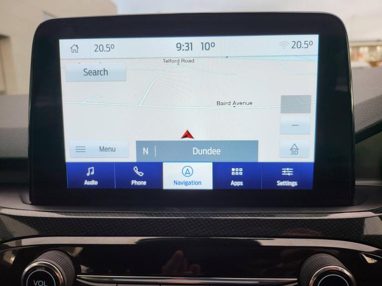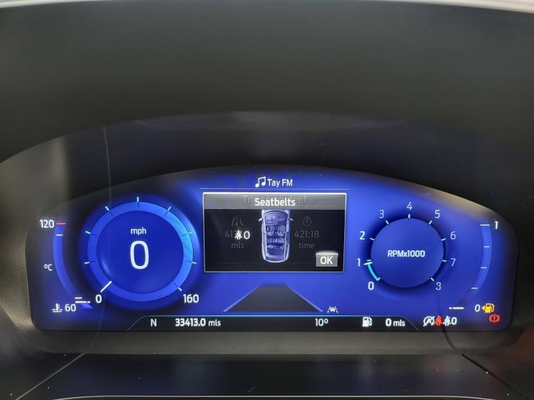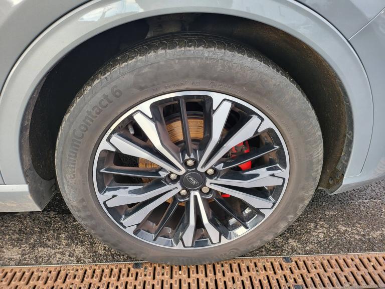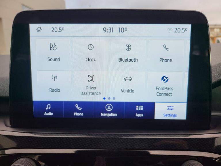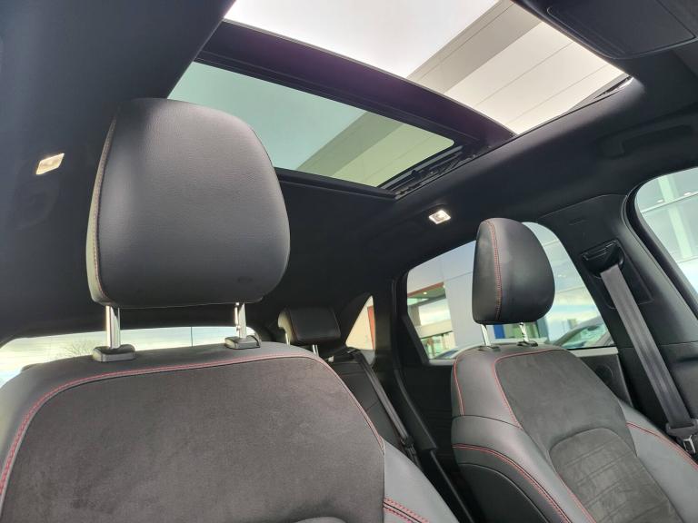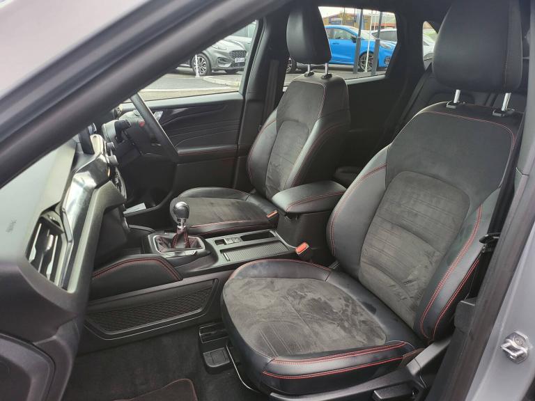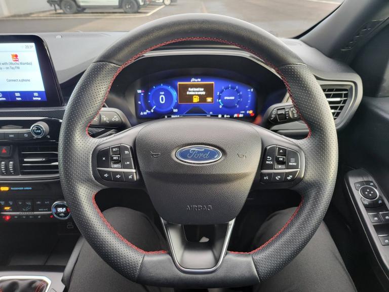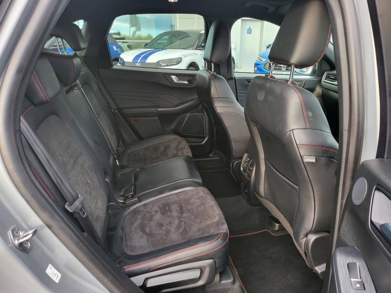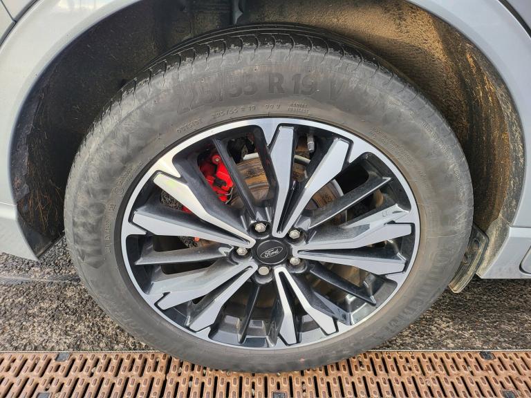 3x3 point rear seatbelts, Airbags - front driver/passenger, front and rear curtain, Drivers knee airbag, Electronic stability control (ESC) and ABS, Ford MyKey Gen 2 safety system, Manual child proof rear door locks, Post collision braking, Pre collision assist with autonomous emergency braking, Rear seat Occupancy alert, Red brake calipers, Tyre pressure monitoring system, 12.3 inch digital colour instrument cluster, Cruise control with adjustable speed limiter, Ford easy fuel, Ford SYNC 3 with 8 inch TFT LCD touchscreen, App Link, andriod auto/apple carPlay, emergency assistance and navigation with Ford pass connect, Front and rear parking sensors, Hands free power tailgate, Lane keeping aid with lane departure warning, Power assist steering, Rear view camera, Selectable drive modes, Service interval indicator, Auto headlamps with high and low beam, Black roof rails, Body colour bumpers, Day/night rear view mirror, Front LED fog lamps, Full LED headlamps, Large rear roof spoiler, LED daytime running lights, LED rear lights, Power folding, electrically adjustable and heated door mirrors with puddle lights, Power front/rear windows with global close, Power opening panoramic roof, Quickclear heated windscreen, Rain sensing wipers, Rear privacy glass, Rear side wing doors, Rear wiper, Solid paint, ST Line body styling kit with unique front and rear fascia and bumper, rear painted diffuser, front painted skid plates, dark mesh upper grille, ST Line front scuff plates, Third brake light, Twin exhausts, 10 way power adjustable drivers seat, 8 way manual passenger seat including lumbar support and height adjust, Alloy pedals, Centre console with electronic parking brake, Dark headlining and pillars, Electronic automatic temperature control (EATC), Flat bottomed leather steering wheel in sensico with red stitching, Front and rear head restraints, Heated passenger and driver seats, Heated rear seats, Heated steering wheel, Partial premium touch Sensico with black cloth inserts and red stitching, Rear centre head restraint, Single front passenger seat, Sports seats, ST Line front and rear floor mats, ST Line gear knob, Sports suspension, Twist beam rear suspension, Engine immobiliser, Keyless entry and Ford power start button (Keyless start), Locking wheel nuts, Remote powered central double locking doors, Thatcham category 1 alarm, BandO premium audio system with 10 speakers and subwoofer, 2 USB ports, DAB radio/CD, 19 inch 5x2 spoke high gloss machined alloy