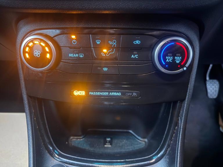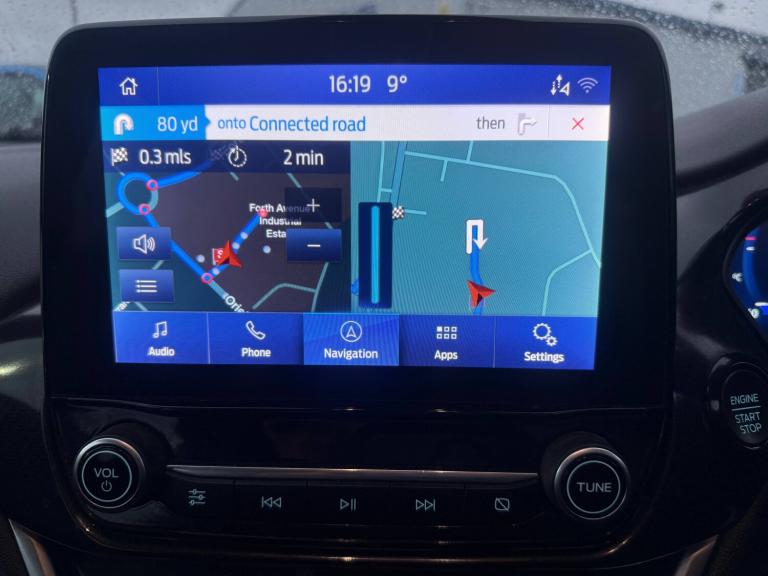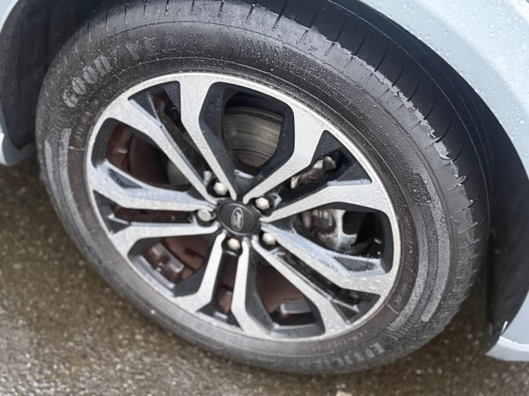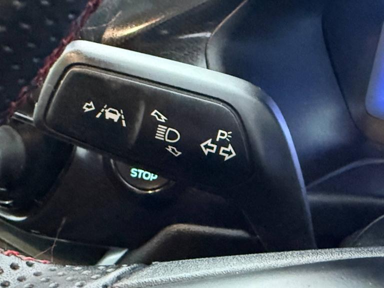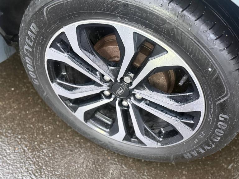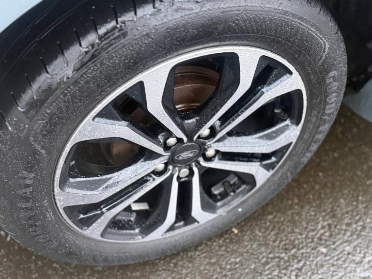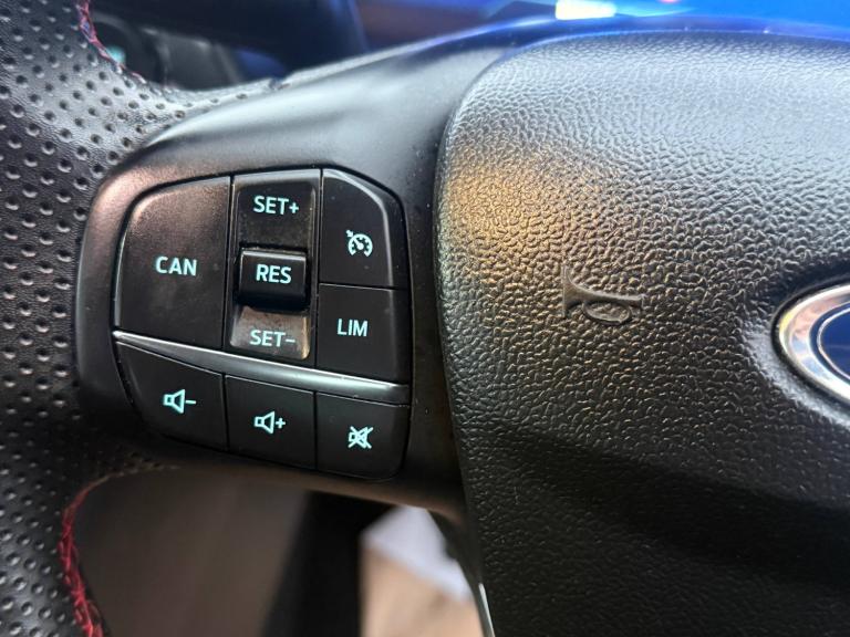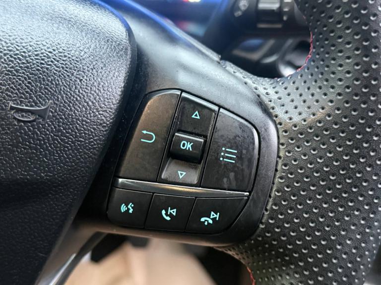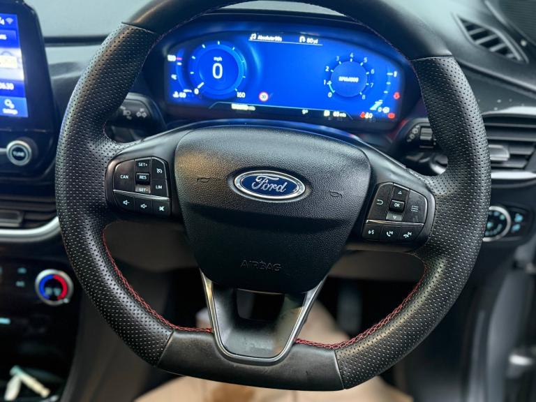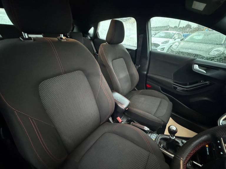 3 rear seatbelts, Autonomous emergency braking, Child safety lock, Electronic stability control (ESC) and hill start assist, Pedestrian/cyclist detection and post-collision braking, Pre collision assist system, Tyre pressure monitoring system (TPMS), Cruise control with Intelligent speed assist, Driver impairment monitor, Emergency call service, Ford easy fuel, Full digital 12.3 inch instrument cluster, Lane keeping aid with lane departure warning, Manual tailgate, Power assist steering, Power start button, Rear parking sensor, Selectable drive modes(Normal, Eco, Sport, Slippery and Trail), Speed sign recognition, Automatic headlights with auto high beam, Automatic rain sensing wipers, Body coloured door mirrors, Body coloured roof, Large body colour rear roof spoiler, LED rear lamps, Power foldable heated door mirrors with puddle lamps, Projector headlamps with LED day time running lights and front fog lamps, Quickclear heated windscreen, Rear side wing doors, Rear wiper, Solid paint, ST-Line body styling kit with unique grille, Third brake light, 3 seat bench in 2nd row, Centre console with armrest and stowage, Ford megabox extended bootspace, Front and rear head restraints, Front floor mats, Manual 2 way passenger seat adjustment, Manual 4 way driver seat adjust with lumbar adjustment, Manual air conditioning, Single front passenger seat, ST- Line cloth trim with red stitching, ST-Line flat bottomed sensico leather steering wheel with leather handbrake and aluminium gear knob, Ford SYNC 3 navigation pack - Puma, Sport suspension, Thatcham alarm, 17 inch 5x2 spoke black machined finished alloy wheel, Tyre inflation kit