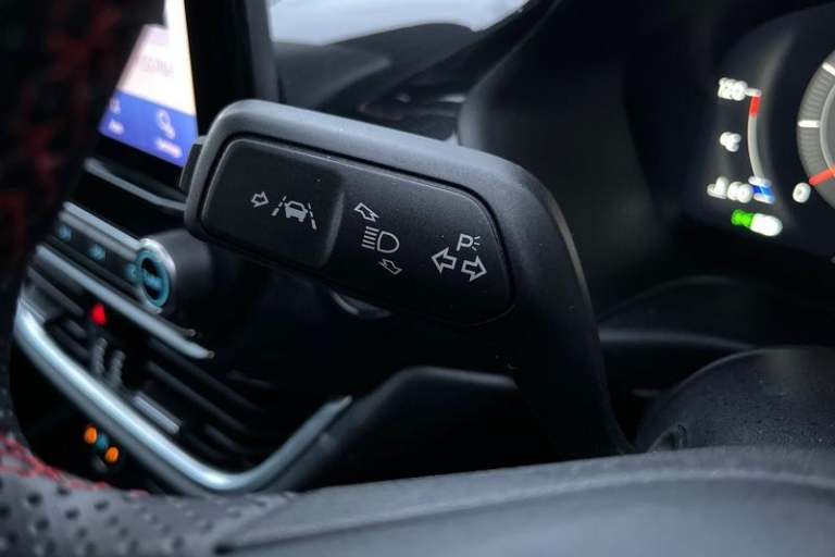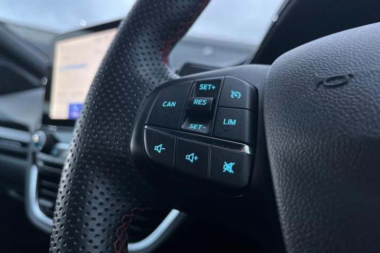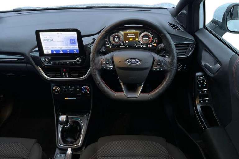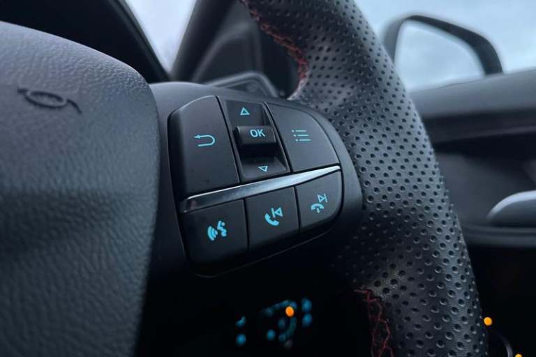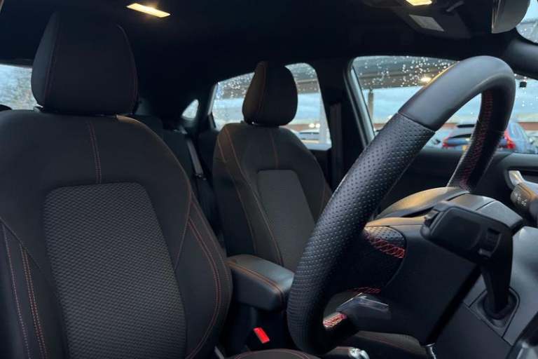 Driver impairment monitor, Emergency call service, Ford easy fuel, Full digital 12.3 instrument cluster, Lane keeping aid with lane departure warning, Power assist steering, Power start button, Rear parking sensor, Selectable drive modes(Normal, Eco, Sport, Slippery and Trail), Speed sign recognition, Automatic headlights with auto high beam, Automatic rain sensing wipers, LED rear lamps, Power foldable heated door mirrors with puddle lamps, Projector headlamps with LED day time running lights and front fog lamps, Quickclear heated windscreen, Rear side wing doors, Rear wiper, ST-Line body styling kit with unique grille, Third brake light, 3 seat bench in 2nd row, Centre console with armrest and stowage, Ford megabox extended bootspace, Front and rear head restraints, Front floor mats, Manual 2 way passenger seat adjustment, Manual 4 way driver seat adjust with lumbar adjustment, Single front passenger seat, ST- Line cloth trim with red stitching, ST-Line flat bottomed sensico leather steering wheel with leather handbrake and aluminium gear knob, 3 rear seatbelts, Child safety lock, Electronic stability control (ESC) and hill start assist, Pedestrian/cyclist detection & post-collision braking, Pre collision assist system, Tyre pressure monitoring system (TPMS)
