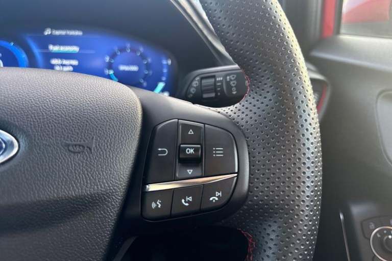 Driver impairment monitor, Emergency call service, Ford easy fuel, Full digital 12.3 instrument cluster, Lane keeping aid with lane departure warning, Power assist steering, Power start button, Rear parking sensor, Selectable drive modes(Normal, Eco, Sport, Slippery and Trail), Speed sign recognition, Automatic headlights with auto high beam, Automatic rain sensing wipers, Front fog lamps, LED daytime running lights, LED rear lamps, Power foldable heated door mirrors with puddle lamps, Privacy glass to side rear windows and tailgate glass, Quickclear heated windscreen, Rear side wing doors, Rear wiper, ST-Line body styling kit with unique grille, Third brake light, 3 seat bench in 2nd row, Centre console with armrest and stowage, Ford megabox extended bootspace, Front and rear head restraints, Front floor mats, Manual 4 way driver seat adjust with lumbar adjustment, Manual 4 way passenger seat with lumbar seat adjustment, Sensico partial premium upholstery, Single front passenger seat, ST-Line flat bottomed sensico leather steering wheel with leather handbrake and aluminium gear knob, Wireless charging pad with electronic air temperature control (EATC), 3 rear seatbelts, Child safety lock, Electronic stability control (ESC) and hill start assist, Pedestrian/cyclist detection & post-collision braking, Pre collision assist system, Tyre pressure monitoring system (TPMS)