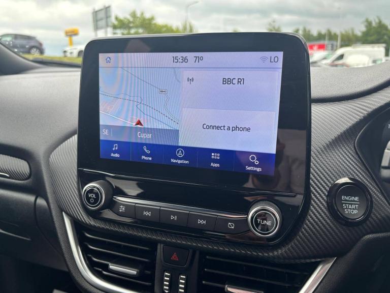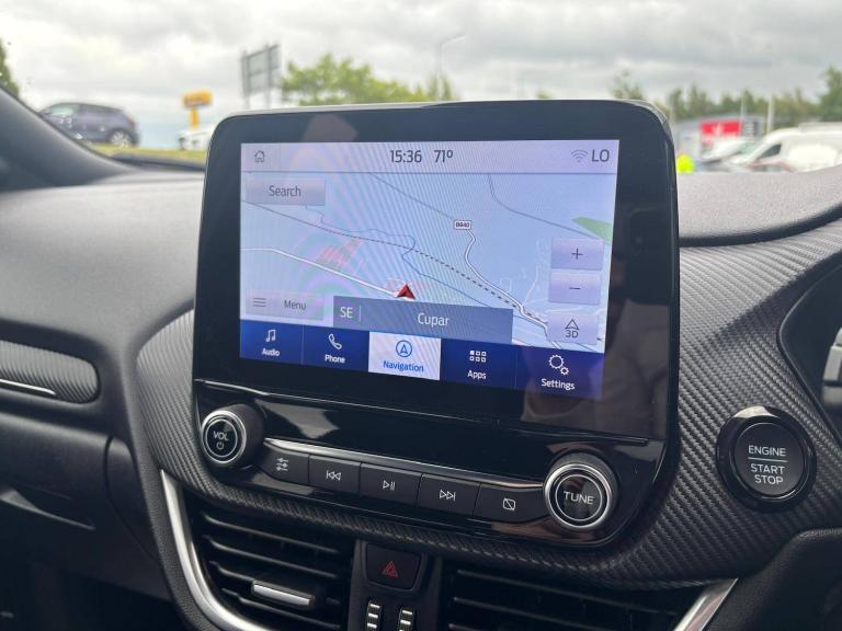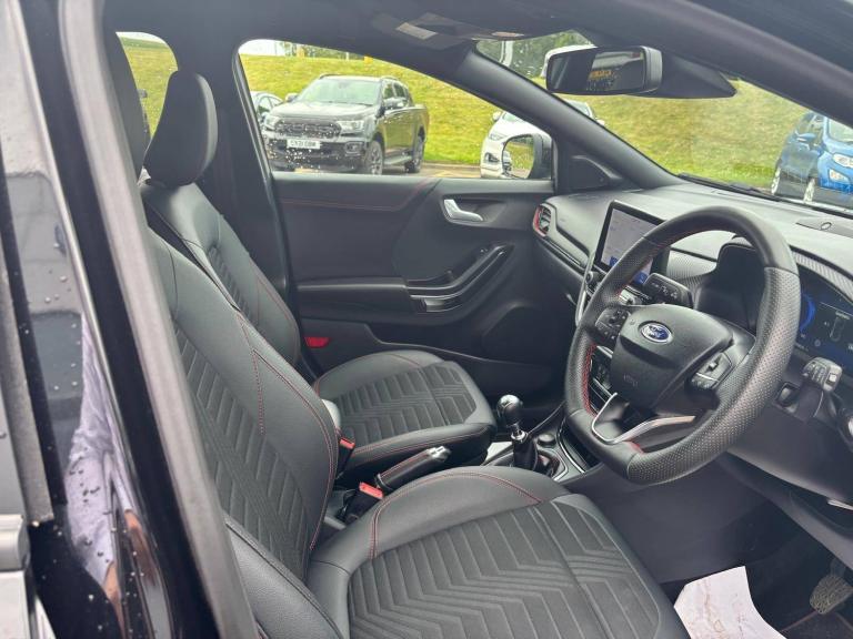 3 rear seatbelts, Autonomous emergency braking, Child safety lock, Electronic stability control (ESC) and hill start assist, Pedestrian/cyclist detection and post-collision braking, Pre collision assist system, Tyre pressure monitoring system (TPMS), Cruise control with Intelligent speed assist, Driver impairment monitor, Emergency call service, Ford easy fuel, Full digital 12.3 inch instrument cluster, Lane keeping aid with lane departure warning, Manual tailgate, Power assist steering, Power start button, Rear parking sensor, Selectable drive modes(Normal, sport, Eco, trail, slippery), Speed sign recognition, Automatic headlights with auto high beam, Automatic rain sensing wipers, Body coloured door mirrors, Body coloured roof, Front fog lamps, Large body colour rear roof spoiler, LED daytime running lights, LED rear lamps, Power foldable heated door mirrors with puddle lamps, Privacy glass to side rear windows and tailgate glass, Projector headlamps, Quickclear heated windscreen, Rear side wing doors, Rear wiper, Solid paint, ST-Line body styling kit with unique grille, Third brake light, 3 seat bench in 2nd row, Centre console with armrest and stowage, Ford megabox extended bootspace, Front and rear head restraints, Front floor mats, Manual 4 way driver seat adjust with lumbar adjustment, Manual 4 way passenger seat with lumbar seat adjustment, Sensico partial premium upholstery, Single front passenger seat, ST-Line flat bottomed sensico leather steering wheel with leather handbrake and aluminium gear knob, Wireless charging pad with electronic air temperature control (EATC), BandO Premium Audio system + Ford SYNC 3 navigation pack - Puma, Sport suspension, Carbon look interior deco spears, Thatcham alarm, 18 inch 5 spoke matt black finish alloy wheels, Tyre inflation kit