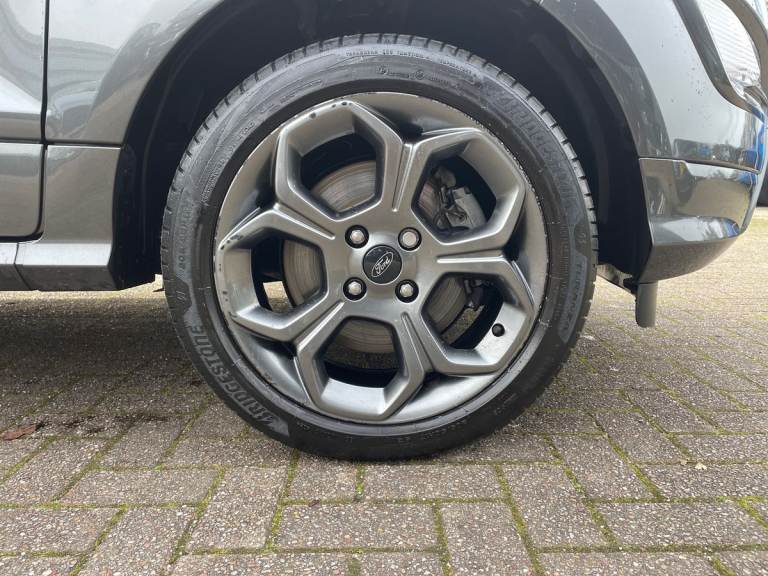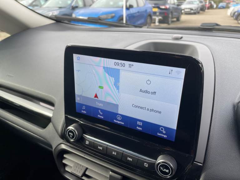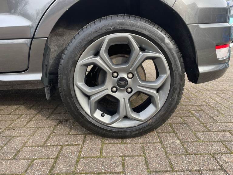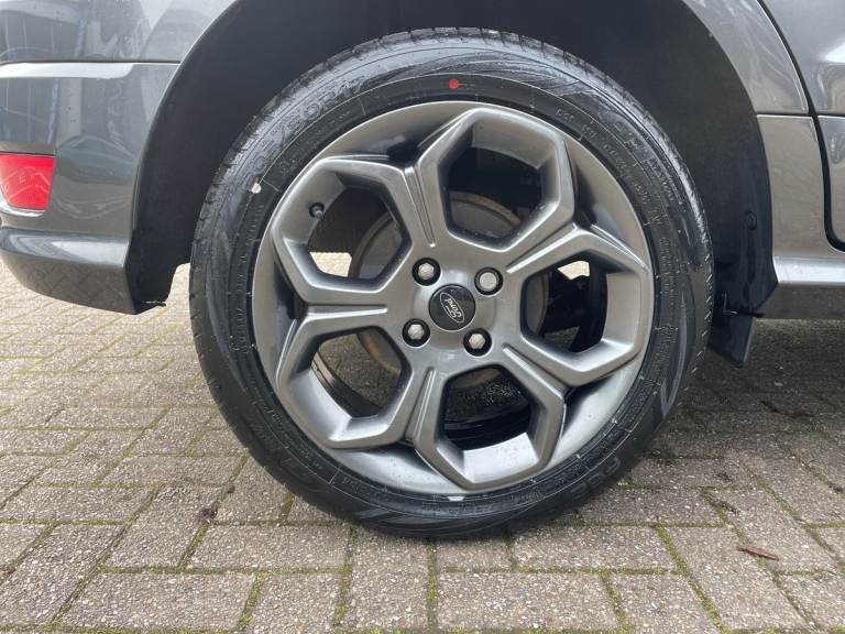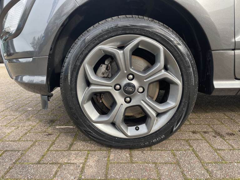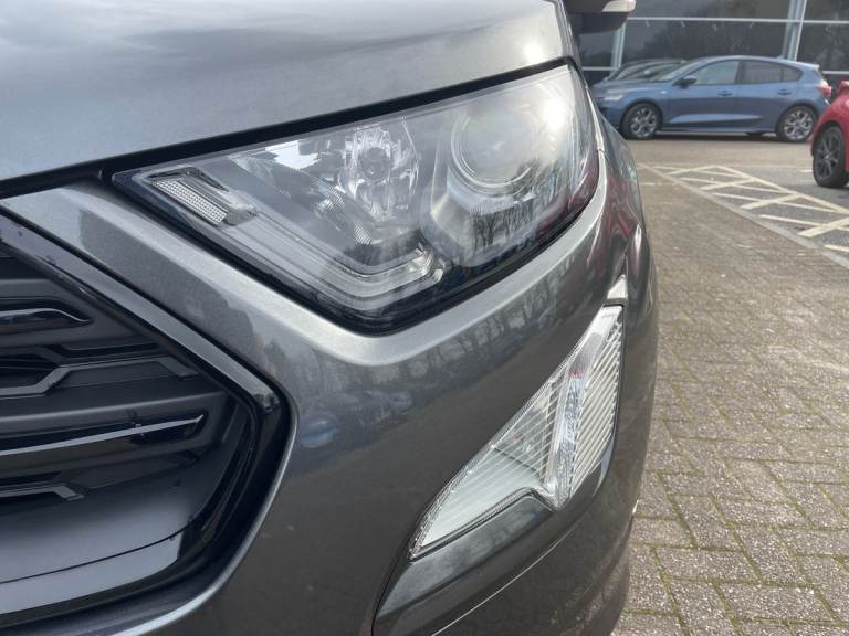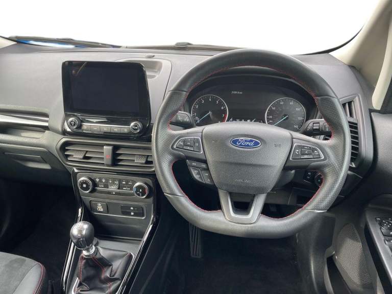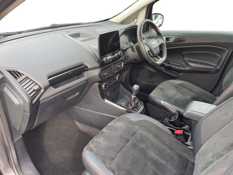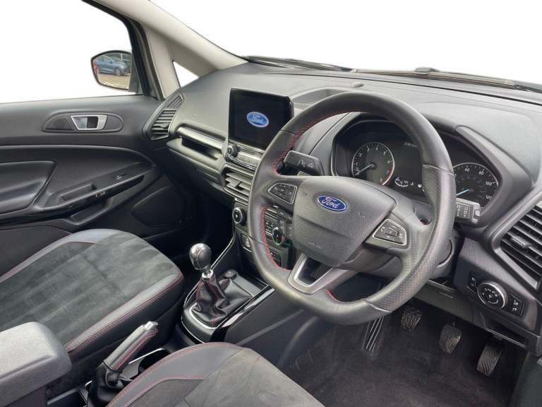 .the key features for the 2023 Ford EcoSport 1.0 EcoBoost 125 ST-Line 5dr 1.0L: Ford SYNC 3 nav system with DAB radio. Apple car play/Android auto. Rear parking sensors, Rear view camera. The 2023 Ford EcoSport ST-Line features a 1.0L EcoBoost petrol engine delivering 125PS, offering responsive performance and impressive fuel efficiency. The ST-Line trim adds sporty exterior styling, alloy wheels, and a dynamic interior with distinctive red stitching and trim accents. Technology includes a touchscreen infotainment system with Apple CarPlay and Android Auto, Bluetooth connectivity, climate control, and rear parking sensors. Stylish, compact, and practical, its ideal for comfortable everyday driving..Cruise control, e-Call (emergency call), Easy fuel capless refuelling system, Ford SYNC 3 nav system with DAB radio,8'' screen, emergency assistance,Apple car play/Android auto, 2x USB, 6 speakers, Ford pass connect, Intelligent speed limiter, PAS, Rear parking sensors, Rear view camera, Traffic sign recognition, Trip computer, Sports suspension, Steering wheel mounted audio controls, Auto dimming rear view mirror, Automatic front wipers, Automatic headlights, Black roof rails, Body colour door handles, Body coloured bumpers, Chrome lower window surround, Electrically adjustable and heated door mirrors, Front fog lights, Front grille bars and surround in black, Headlight levelling control, Large rear roof spoiler, LED day running lights, LED third brake light, Power front and rear windows, Puddle lights, Quick-clear heated windscreen, Rear side wing doors, Rear wiper, ST Line body styling kit - Black headlamp bezel, front and rear sport bumpers, body colour lower door claddings, 12V socket in front and rear, 3 seat bench in 2nd row, 60/40 split rear seats, Ambient lighting, Centre console with sliding front armrest, Cooled glovebox, Courtesy lights with map reading light, Driver seat height/lumbar adjust, Driver's side glovebox, Driver/passenger sunvisors and lidded vanity mirrors, EATC - Electronic Auto Temperature control, Folding grab handles, Front head restraints, Front seat back map pockets, Illuminated glovebox, Illuminated luggage compartment, Isofix system on outer rear seats, Luggage compartment carpet, Neosuede/Partial sensico leather upholstery, Overhead console with sunglasses holder, Rake adjustable rear seats, Reach + rake adjustable steering column, Rear headrests, Sensico trimmed steering wheel, handbrake and gearshift gaiter with red