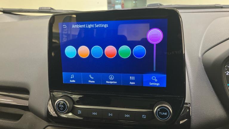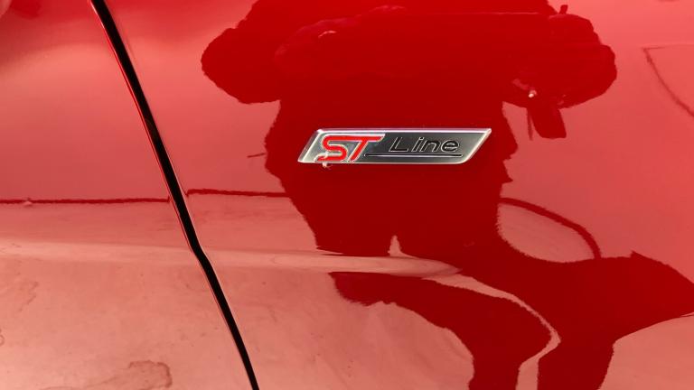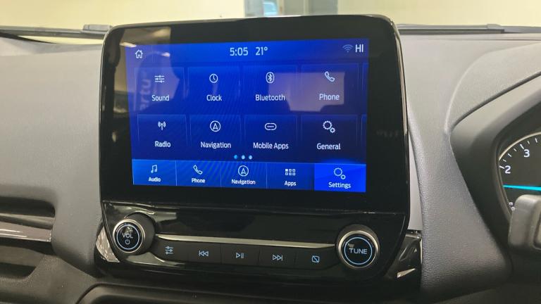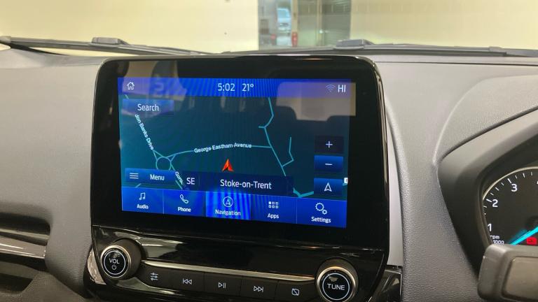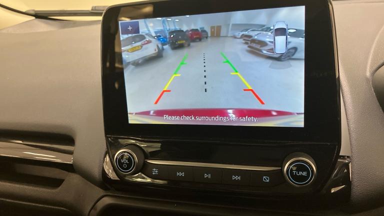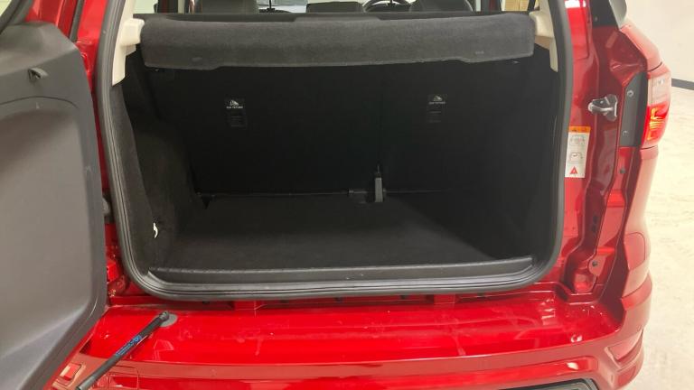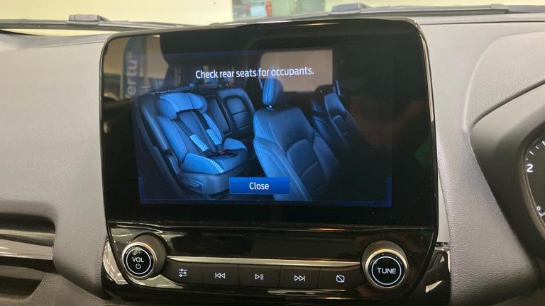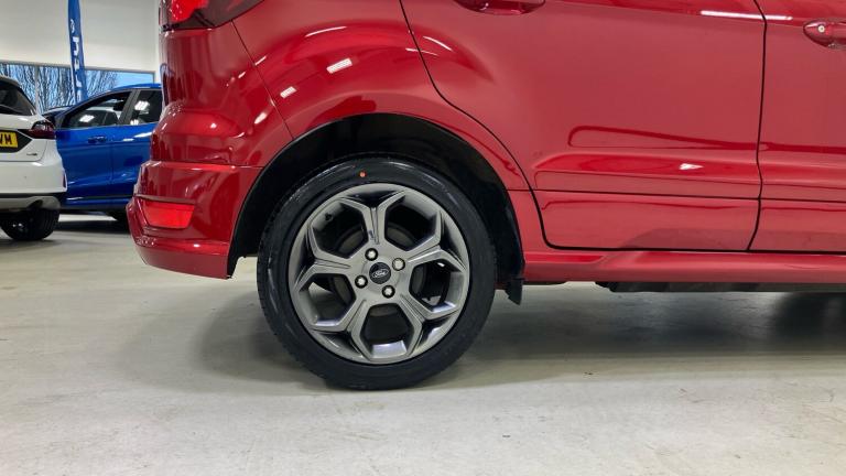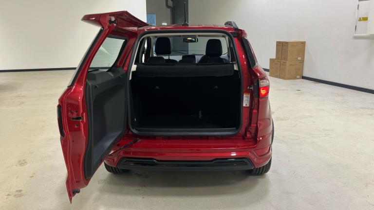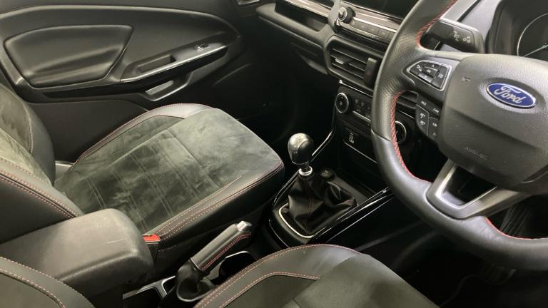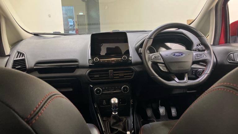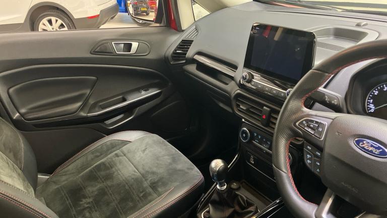 ST-Line delivers all the practicality of the Ford Ecosort, with the additional eye-catching aesthetics of a performance-line vehicle. Large rear spoiler, bodystyling kit, meshed front grilles, upgraded alloy wheels, and sports suspension – all contribute to the car’s unique blend of usability and head-turning good looks. This distinctively stylish image echoes through the interior, emphasising the sports inspired character of its design..Metallic Paint, Satellite Navigation, Alloy Wheels, DAB Radio, Bluetooth, USB, Apple-Android Play& Rear Camera, Luggage compartment carpet, ST-Line Front floor mats with red stitching, Electric front and rear windows + one touch + global open/closing, Rear wiper, Automatic front wipers, Power front and rear windows, Quick-clear heated windscreen, Electronic Stability Programme with hill launch assist, ABS, Traction control, Pre collision assist system with AEB, Sports suspension, Cruise control, PAS, Traffic sign recognition, Rear view camera, Rear parking sensors, Intelligent speed limiter, Easy fuel capless refuelling system, Trip computer, SYNC 3 DAB radio with 8"" touch screen, emergency assistance, Apple car play/Android auto, 2x USB sockets and 6 speakers, Seatbelt reminder for driver and front passenger, Ford SYNC 3 nav system with DAB radio, 8"" screen, emergency assistance, Apple car play/Android auto, 2x USB, 6 speakers, Ford pass connect