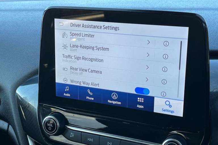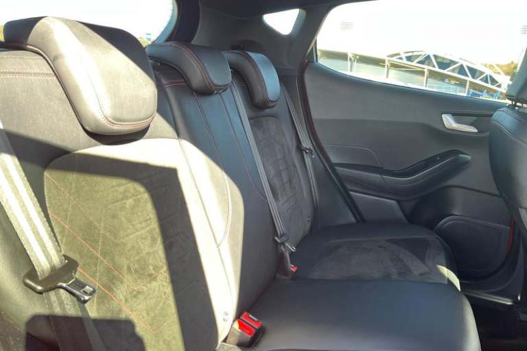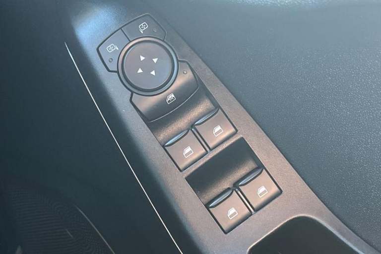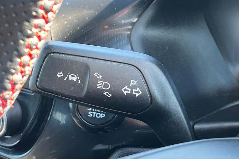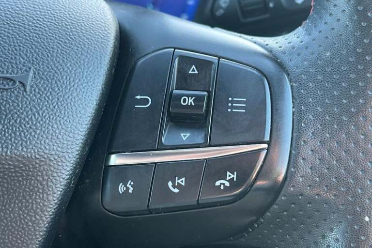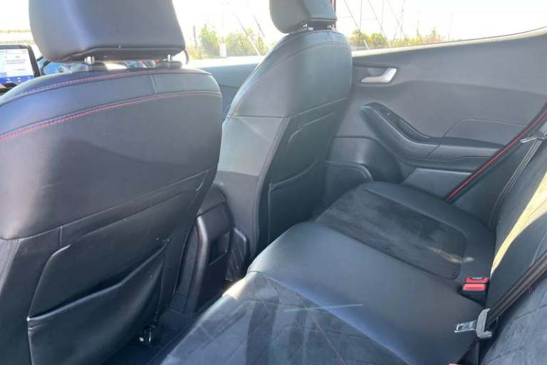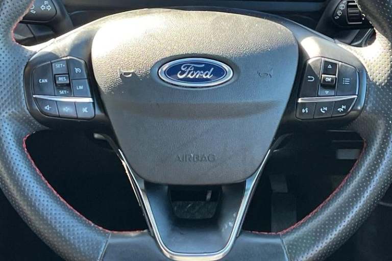Driver alert system, Electric power steering, Ford easy fuel, Lane keep assist, Lane keeping aid, Rear parking distance sensors, Rear view camera, Selectable drive modes (Normal, Sport, Track), Trip computer, 3rd brake light, Auto high beam, Automatic headlights, Body colour bumpers, Body colour large rear spoiler, Body coloured electrically operated with side indicators, Electric front windows/one touch facility, Electric rear windows, LED rear lights, Quickclear heated windscreen, Rain sensing wipers and auto dimming rear view mirror, Rear privacy glass, Rear side wing doors, Rear wiper, Unique ST-Line grille, full bodystyling kit and large body coloured rear spoiler, 3 rear headrests, 3 seat bench in 2nd row, 4 way manually adjustable passenger seat, Adjustable head restraints, Black headlining, Centre console with opening armrest, 2x cupholders, 12v and USB, EATC - Electronic Auto Temperature control, Leather gear knob, Manual 4-way driver seat adjust, Premium floor mats, Sensico partial premium leather upholstery with red stitching, Sensico wrapped steering wheel, Single front passenger seat, 3 point seatbelts on all rear seats, Electronic stability control with hill start assist, Front and rear seat belt warning, Manual child lock in rear doors, Tyre pressure monitoring system