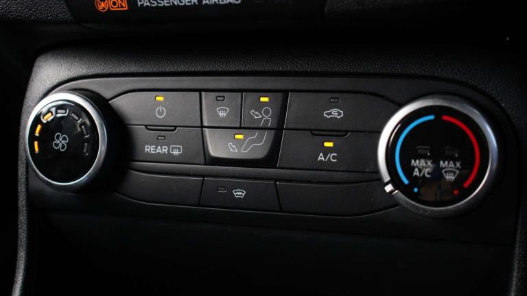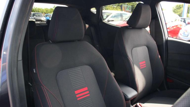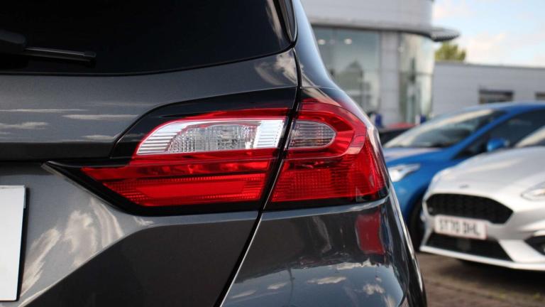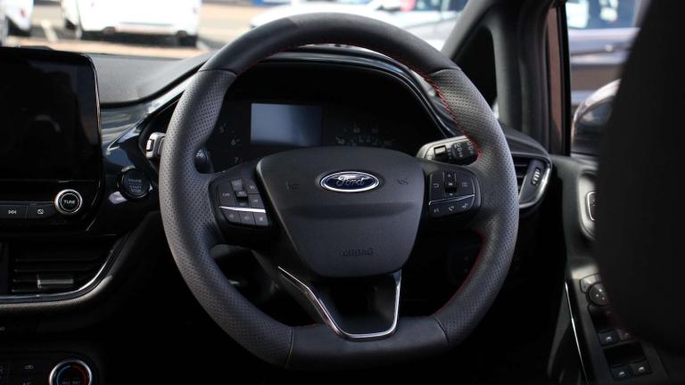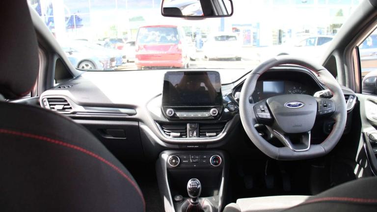 .The Ford Fiesta 1.0 EcoBoost Hybrid mHEV 125 ST-Line brings sporty styling, advanced tech, and everyday practicality together in one exciting package. From the moment you slide into the drivers seat, the ST-Lines Sensico-wrapped steering wheel, red-stitched cloth upholstery, and leather gear knob signal that this isnt your average small car. The sporty suspension, selectable drive modes, and unique ST-Line grille with full body styling kit give it a confident, dynamic presence on the road. On the move, the EcoBoost hybrid engine delivers smooth, efficient performance while the mild-hybrid system keeps fuel use low. Electronic stability control, hill start assist, lane keeping aid, and driver alert systems provide safety and reassurance, while rear parking sensors, rain-sensing wipers, and auto-dimming mirrors make daily driving simple and stress-free. Inside, comfort and convenience are well considered. The centre console with armrest, dual cupholders, USB and 12V charging points, manual air conditioning, and premium floor mats create a cabin thats practical yet refined. Rear privacy glass and three rear headrests ensure passengers travel comfortably, while MyKey and Ford Power keyless start offer security and ease. Outside, the Fiesta ST-Line turns heads with its large body-coloured rear spoiler, 17'' alloy wheels in Rock Metallic finish, and athletic stance. Its a car that blends everyday usability with a touch of excitement, making it ideal for city commutes, weekend drives, or anyone who wants a small car with personality and performance..4.2'' Colour TFT Ice blue illumination analogue cluster, Driver alert system, Electric power steering, Ford easy fuel, Lane keep assist, Lane keeping aid, Rear parking distance sensors, Selectable drive modes (Normal, Sport, Track), Trip computer, Sports suspension, 3rd brake light, Auto high beam, Automatic headlights, Body colour bumpers, Body colour large rear spoiler, Body coloured electrically operated with side indicators, Electric front windows/one touch facility, Electric rear windows, Quickclear heated windscreen, Rain sensing wipers and auto dimming rear view mirror, Rear privacy glass, Rear side wing doors, Rear wiper, Unique ST-Line grille, full bodystyling kit and large body coloured rear spoiler, 3 rear headrests, 3 seat bench in 2nd row, Adjustable head restraints, Black headlining, Centre console with opening armrest, 2x cupholders, 12v and USB, Cloth upholstery with red stitching, Leather gear knob,