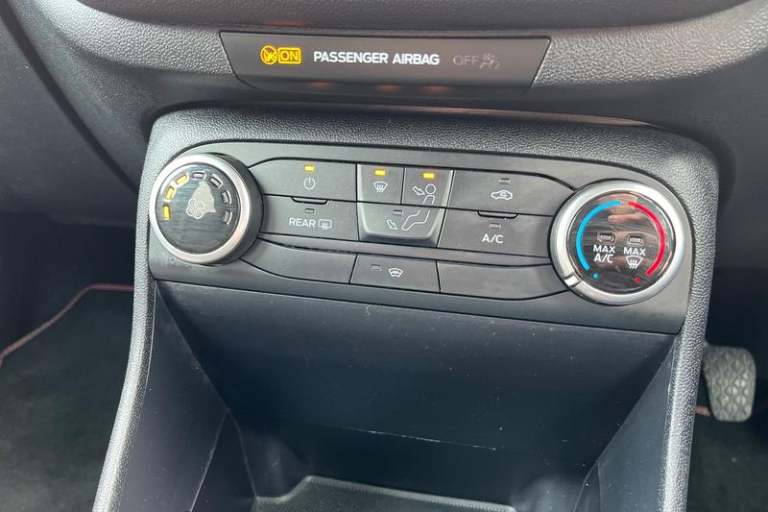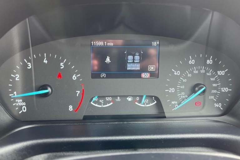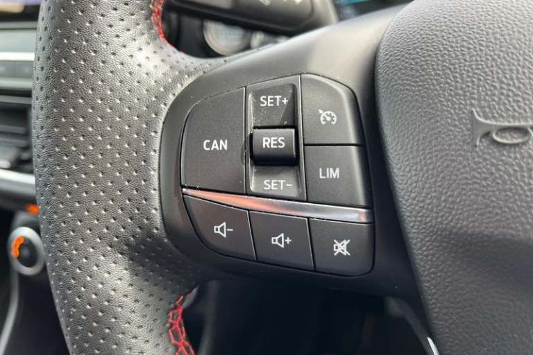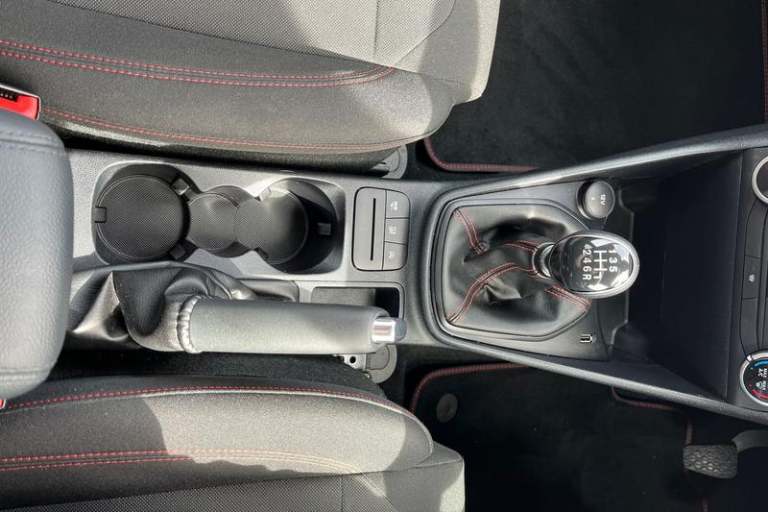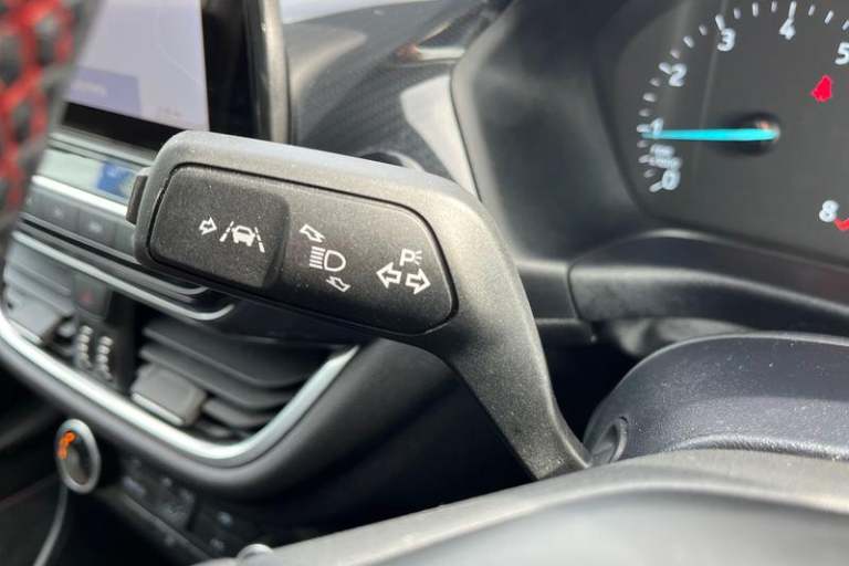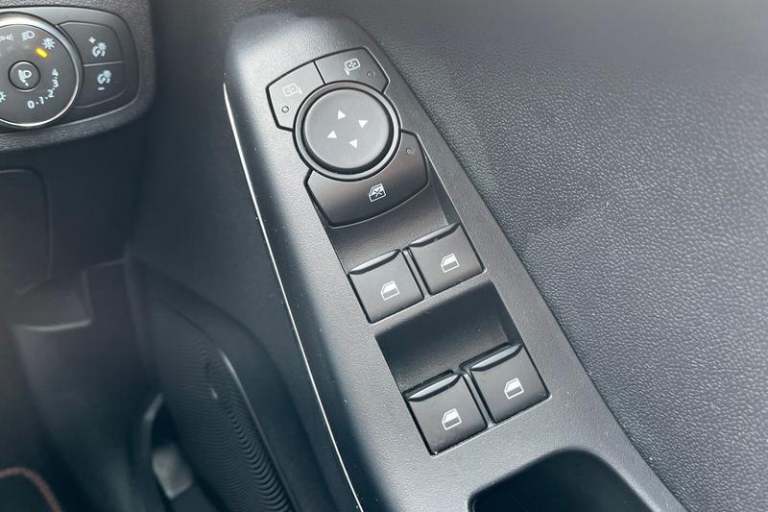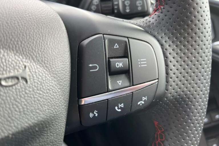 4.2 Colour TFT Ice blue illumination analogue cluster, Driver alert system, Electric power steering, Ford easy fuel, Lane keep assist, Lane keeping aid, Rear parking distance sensors, Selectable drive modes (Normal, Sport, Track), Trip computer, 3rd brake light, Auto high beam, Automatic headlights, Body colour bumpers, Body colour large rear spoiler, Body coloured electrically operated with side indicators, Electric front windows/one touch facility, Electric rear windows, Quickclear heated windscreen, Rain sensing wipers and auto dimming rear view mirror, Rear privacy glass, Rear side wing doors, Rear wiper, Unique ST-Line grille, full bodystyling kit and large body coloured rear spoiler, 3 rear headrests, 3 seat bench in 2nd row, Adjustable head restraints, Black headlining, Centre console with opening armrest, 2x cupholders, 12v and USB, Cloth upholstery with red stitching, Leather gear knob, Manual 2 way passenger seat adjust, Manual 4-way driver seat adjust, Manual air conditioning, Premium floor mats, Sensico wrapped steering wheel, Single front passenger seat, 3 point seatbelts on all rear seats, Electronic stability control with hill start assist, Front and rear seat belt warning, Manual child lock in rear doors, Tyre pressure monitoring system