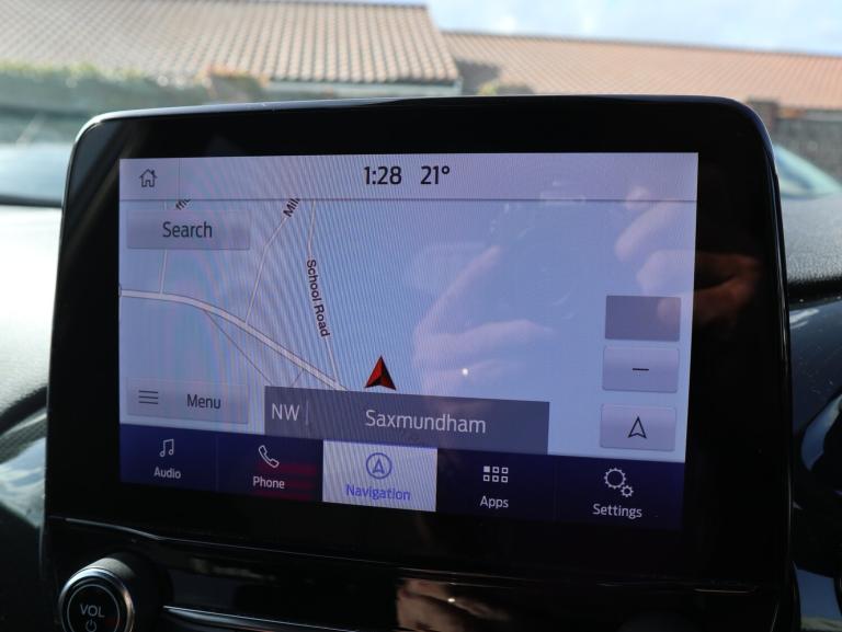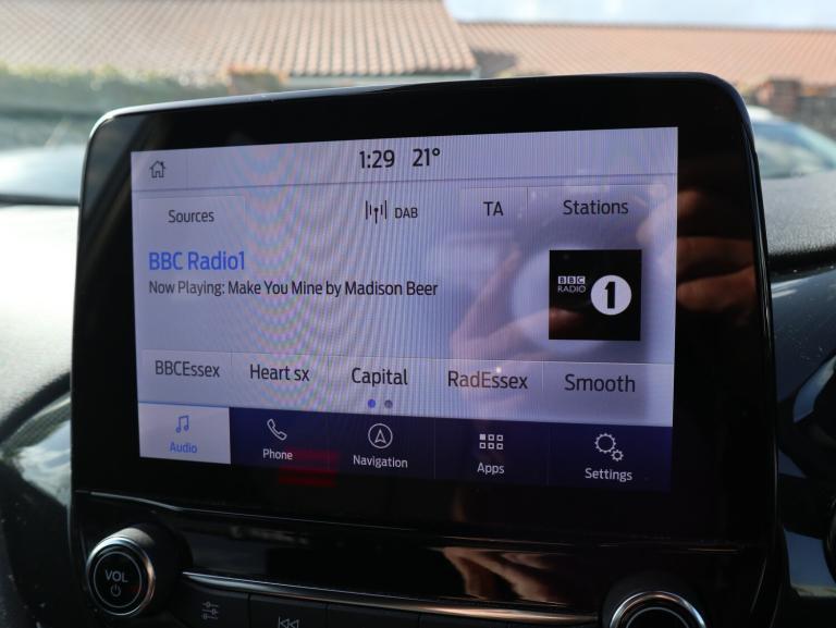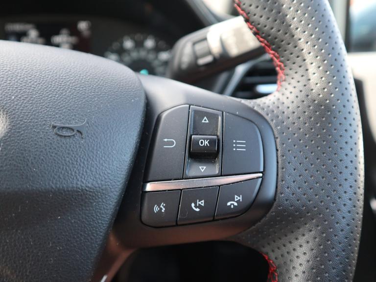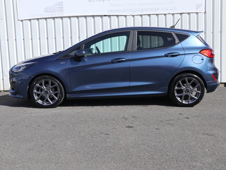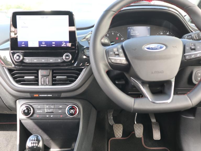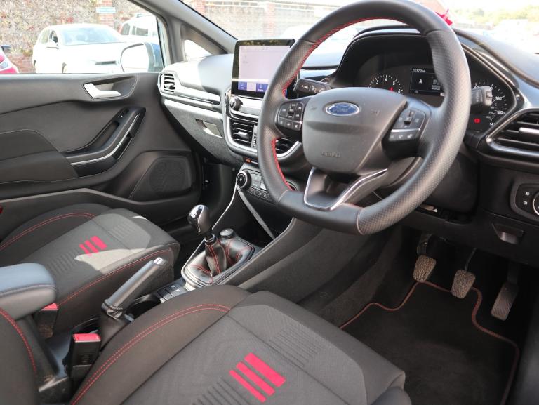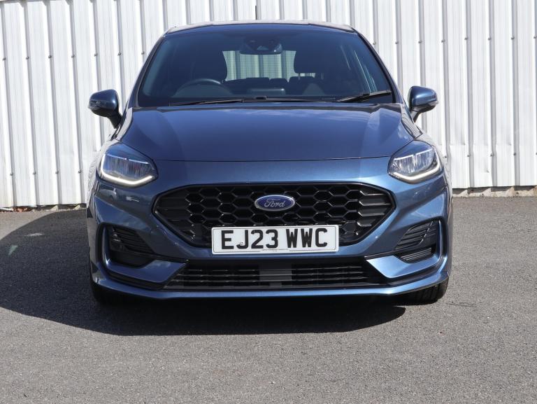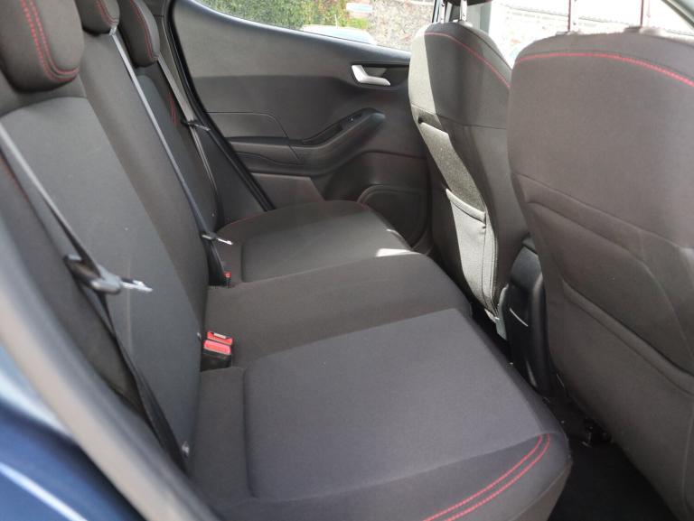 One owner Fiesta ST-Line Hybrid finished in metallic blue with privacy glass, gun-metal grey alloy wheels, red stitching and detail in the seats. The superb spec on the ST line includes LED headlights, heated seats and steering wheel, auto headlights with auto high beam and rain sensing wipers. Features Include: , air conditioning, bluetooth connection, keyless go, rain-sensing wipers, satellite navigation, usb/ipod interface, cruise control, lane departure warning, multi-function steering wheel, rear parking sensor, traction control, traffic sign recognition, abs, child locks, isofix child seat anchor points, multiple airbags, tyre pressure monitor, locking wheel nuts, privacy glass, remote central locking, automated high-beam assist, electric mirrors, electric windows, heated door mirrors, windscreen heating, digital radio, heated seats, push button start, alloy wheels, auto lighting, led daytime running lights, led headlights, rear wash/wipe, ulez compliant euro 6, heated steering wheel