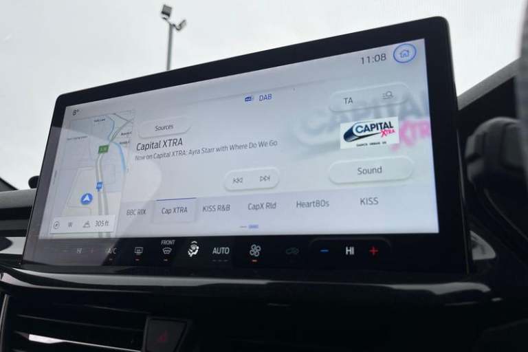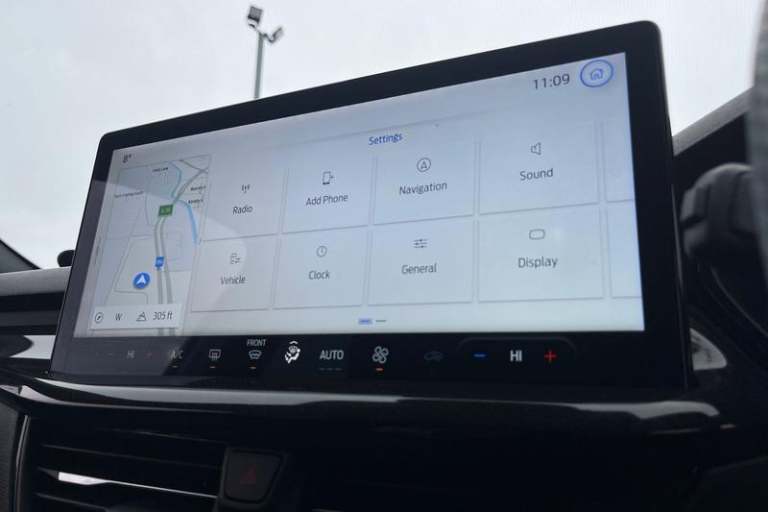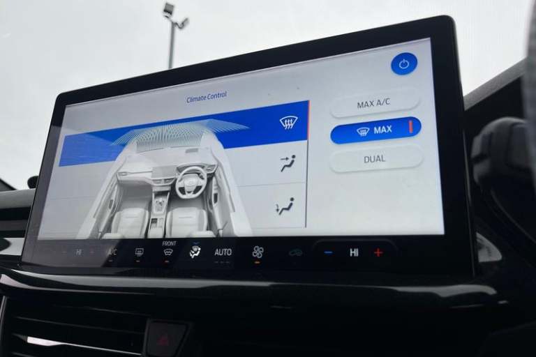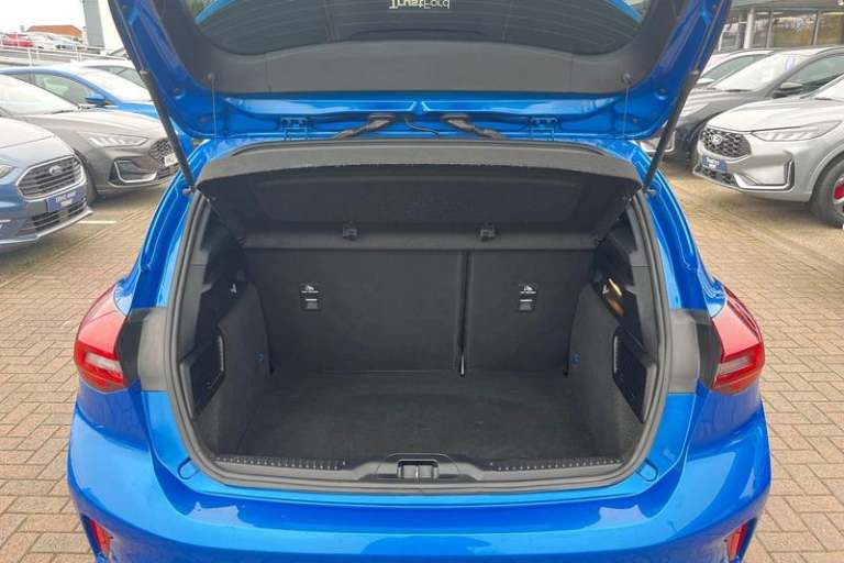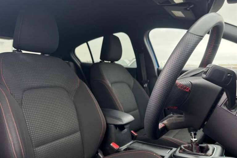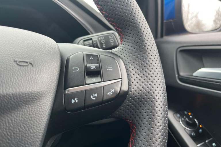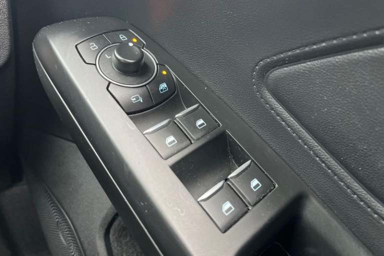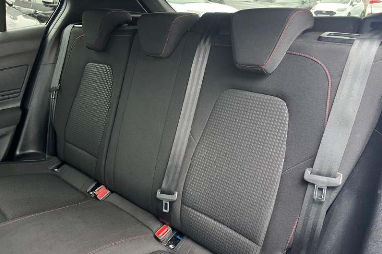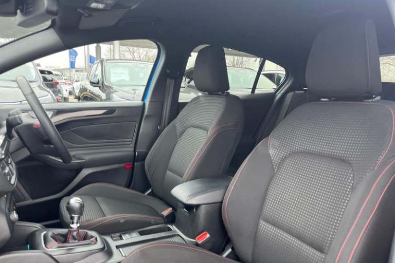 4.2 TFT coloured cluster, Bluetooth system, Digital clock, E-call, Easy fuel capless refuelling system, Eco mode, Ford SYNC 3 navigation with 8 TFT touchscreen, DAB radio and app link Android auto/Apple carplay, Intelligent speed assist, Lane keeping system - lane keeping alert and lane keeping aid, PAS, Selectable drive mode, Trip computer, Auto dimming rear view mirror, Auto headlamps (on/off), Automatic rain sensing wipers, Body colour large rear spoiler, Body coloured bumpers, Body coloured door handles, Body coloured electrically operated and heated door mirrors with side indicators, Electrically operated front and rear windows with one touch opening and closing, Front variable intermittent wipers with electric wash, Heated rear window, LED daytime running lamp, LED front fog lamps with cornering function, LED reflector headlamps, Polished twin tailpipe, Power folding door mirrors, Quickclear heated windscreen, Rear privacy glass, Rear side wing doors, ST-Line upper and lower grille with full body styling kit and wing badges, Tailgate wash/wipe, Third brake light, 3 seat bench in 2nd row, 3 spoke flat bottomed Sensico steering wheel with red stitching, Aluminium gear knob, Cloth upholstery, Dark headliner, Driver's lumbar support, Front floor mats, Height adjustable front headrests, Isofix child seat preparation, Manual air conditioning, Reach + rake adjustable steering column, Rear centre headrest, Single front passenger seat, 3x3 point rear seatbelts, ABS+Electronic